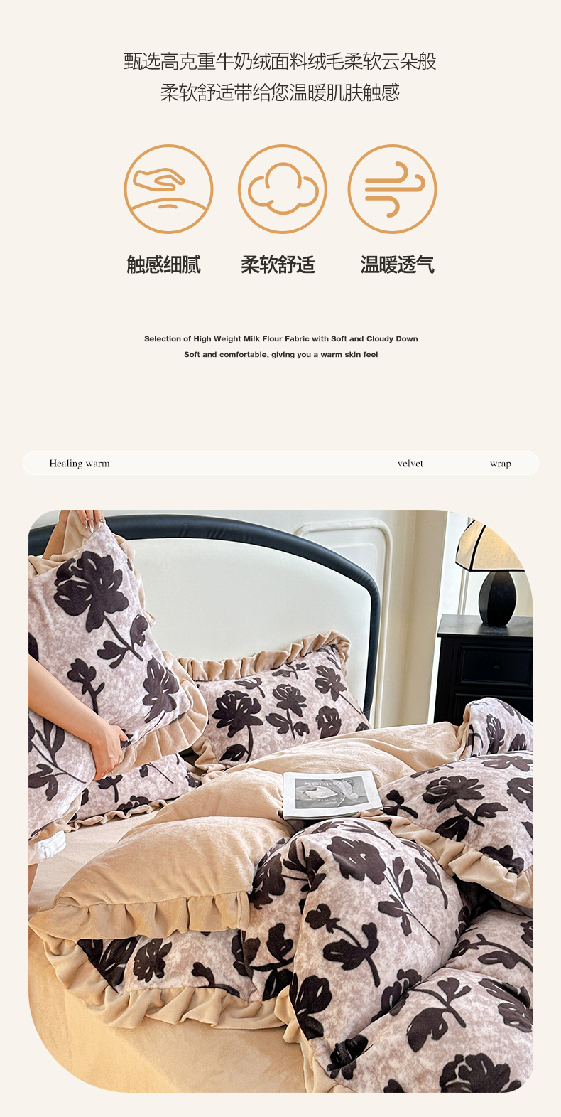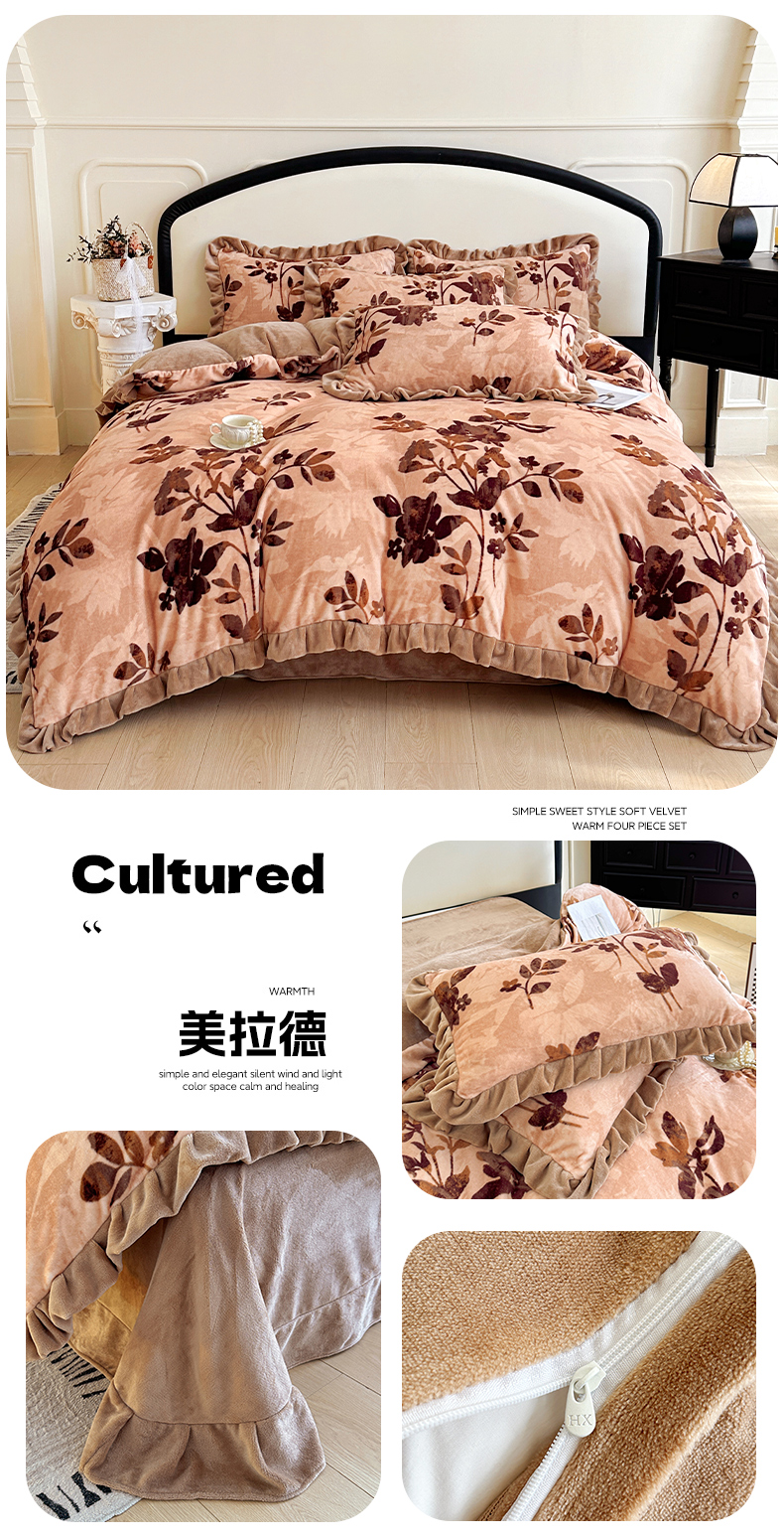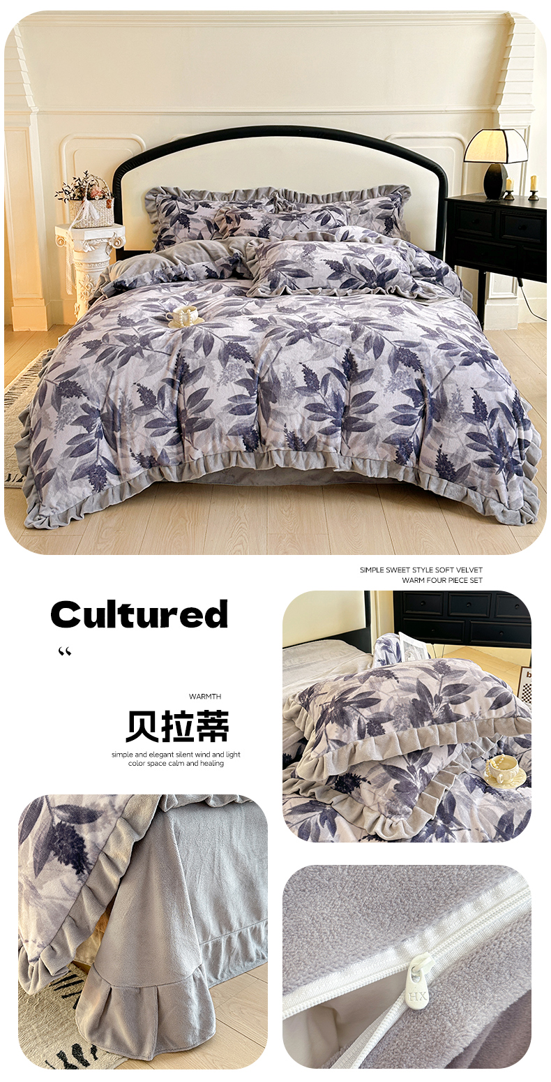 商品名称:绘萱家居 2025新款爆款高密消光双层花边牛奶绒四件套印花 奥黛丽