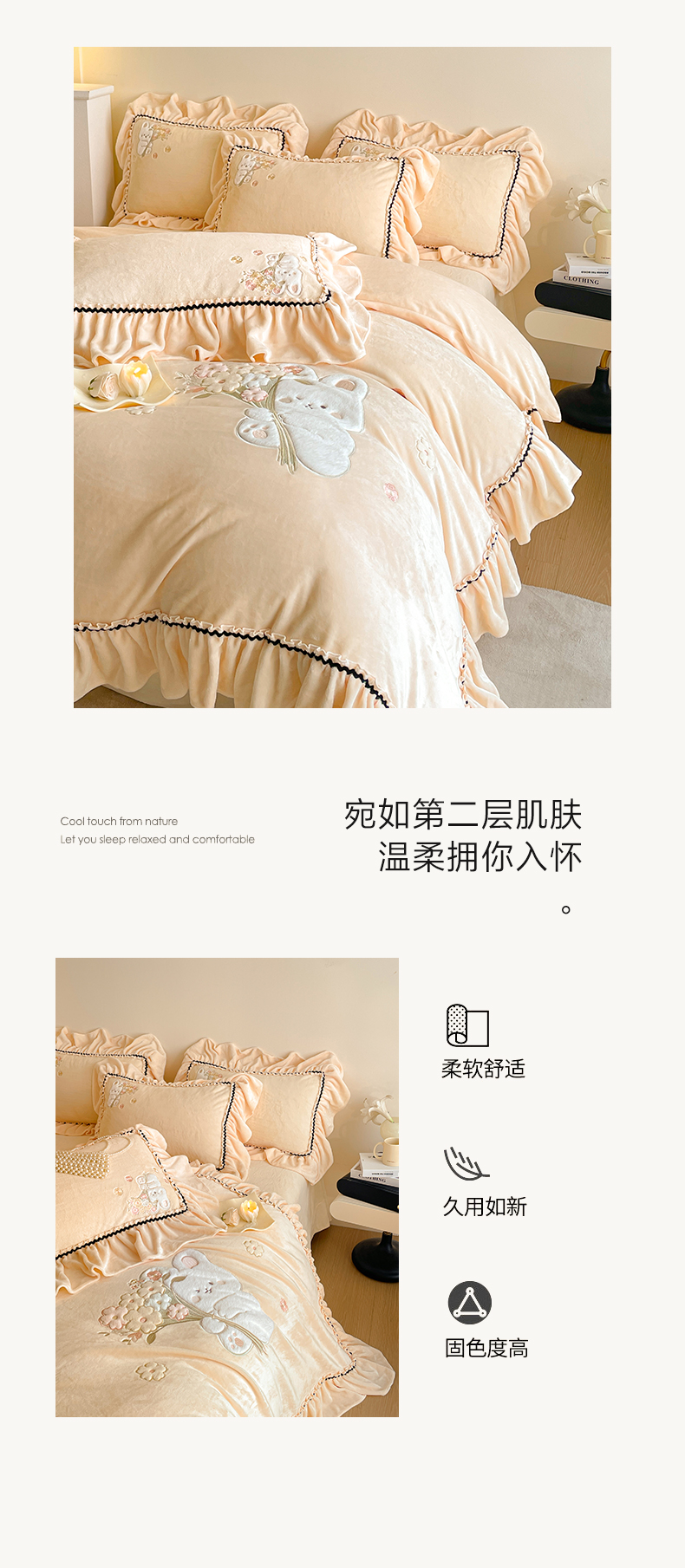畅畅家纺 2025新款轻奢高档冬季工艺款牛奶绒毛巾绣床单床笠四件套 梦境-浅米黄