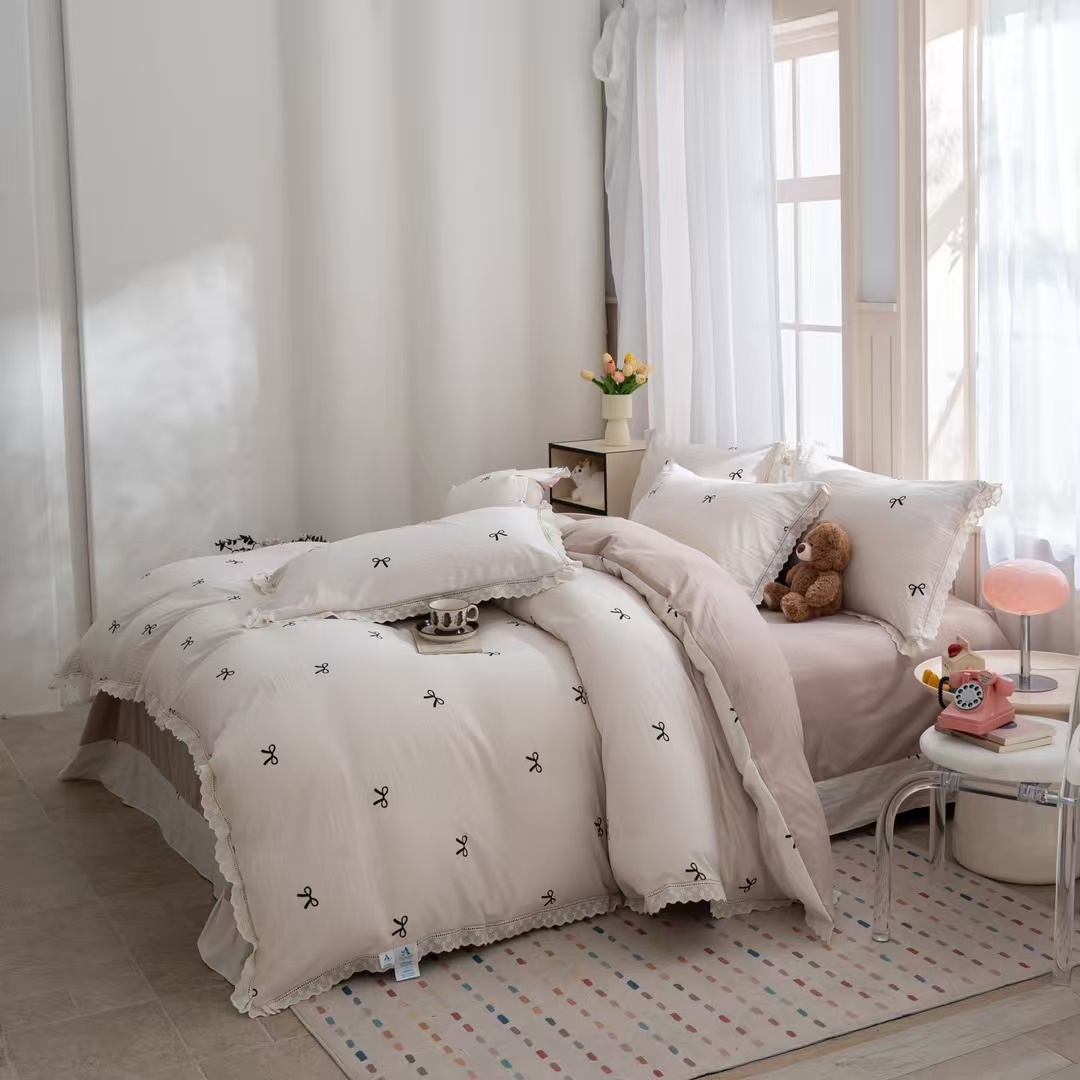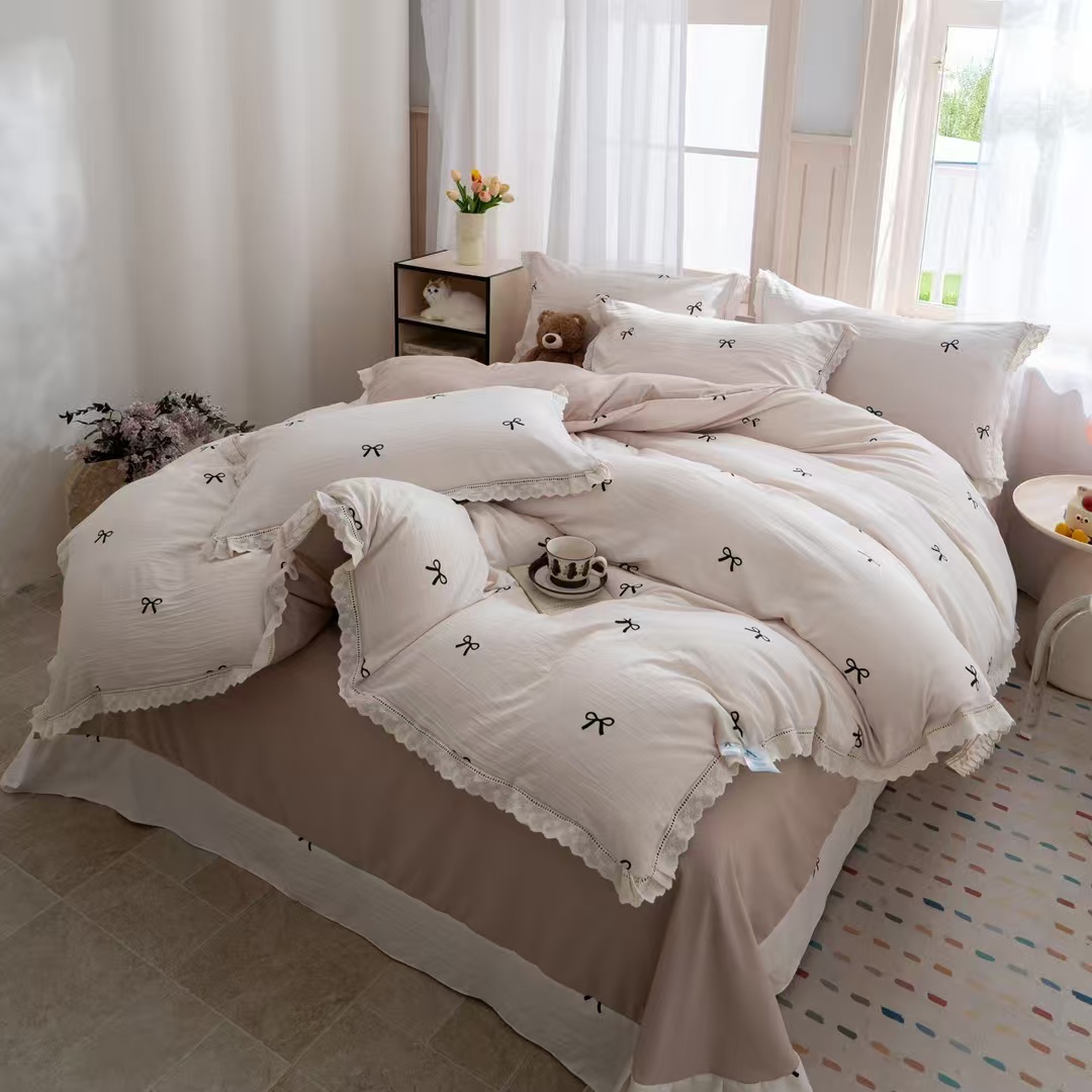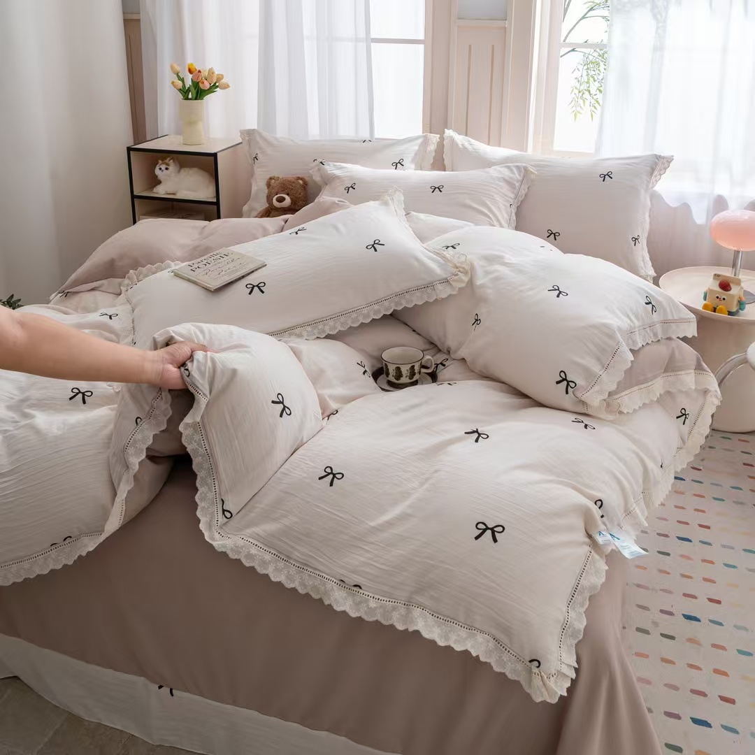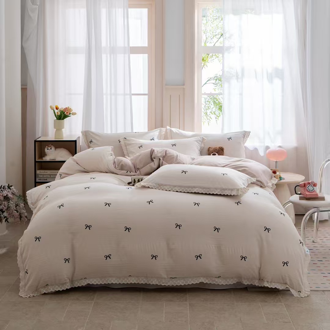 玖琳家纺 2025新款云朵水洗棉皱皱纱精致花边款四件套 碟引舞纱