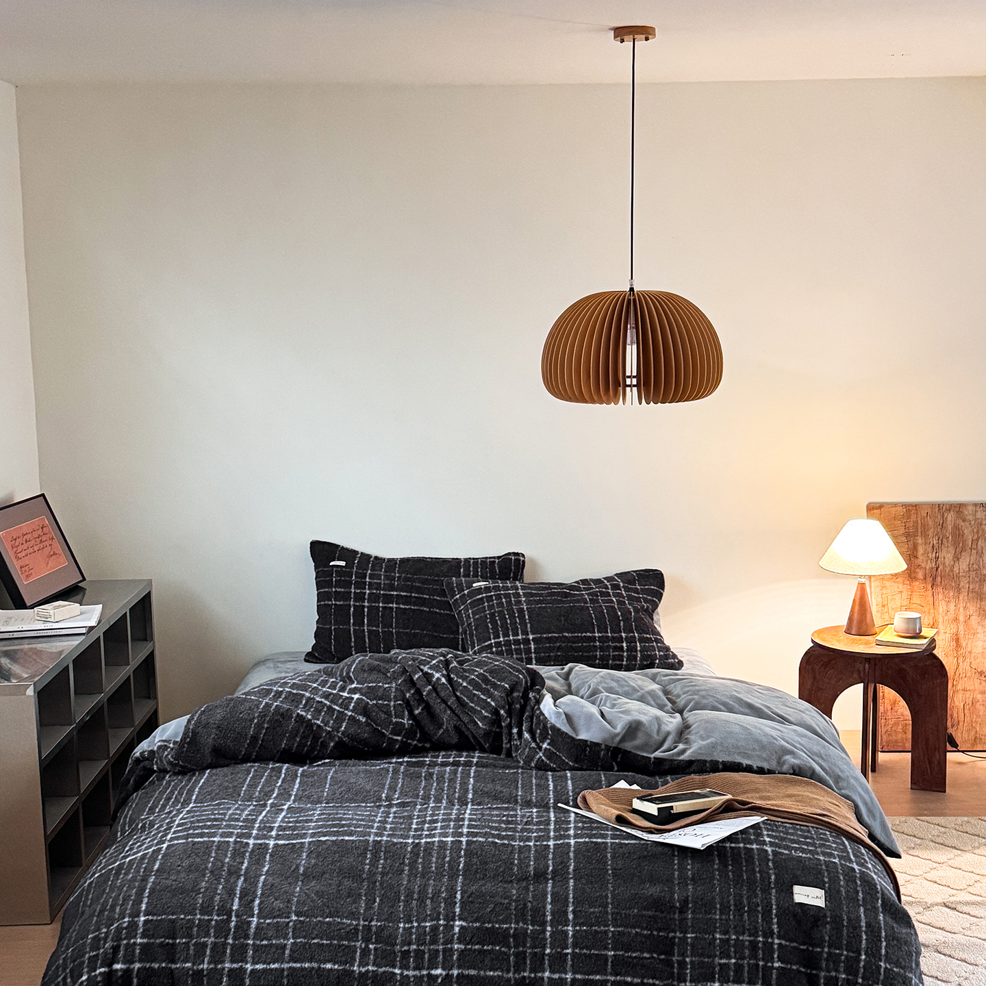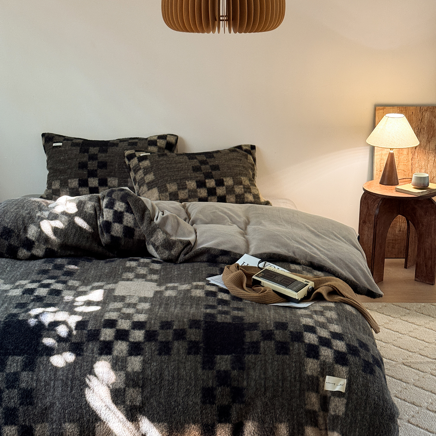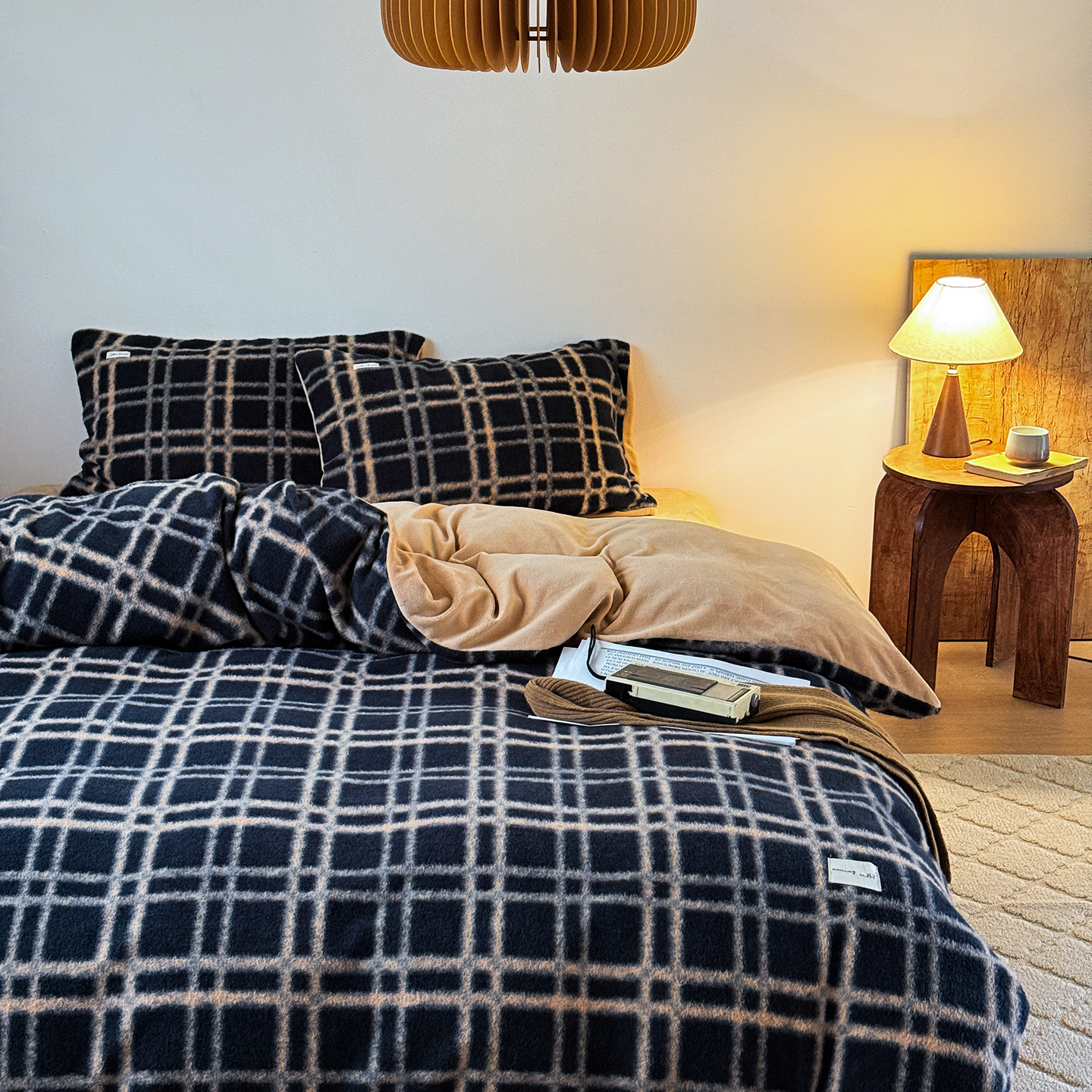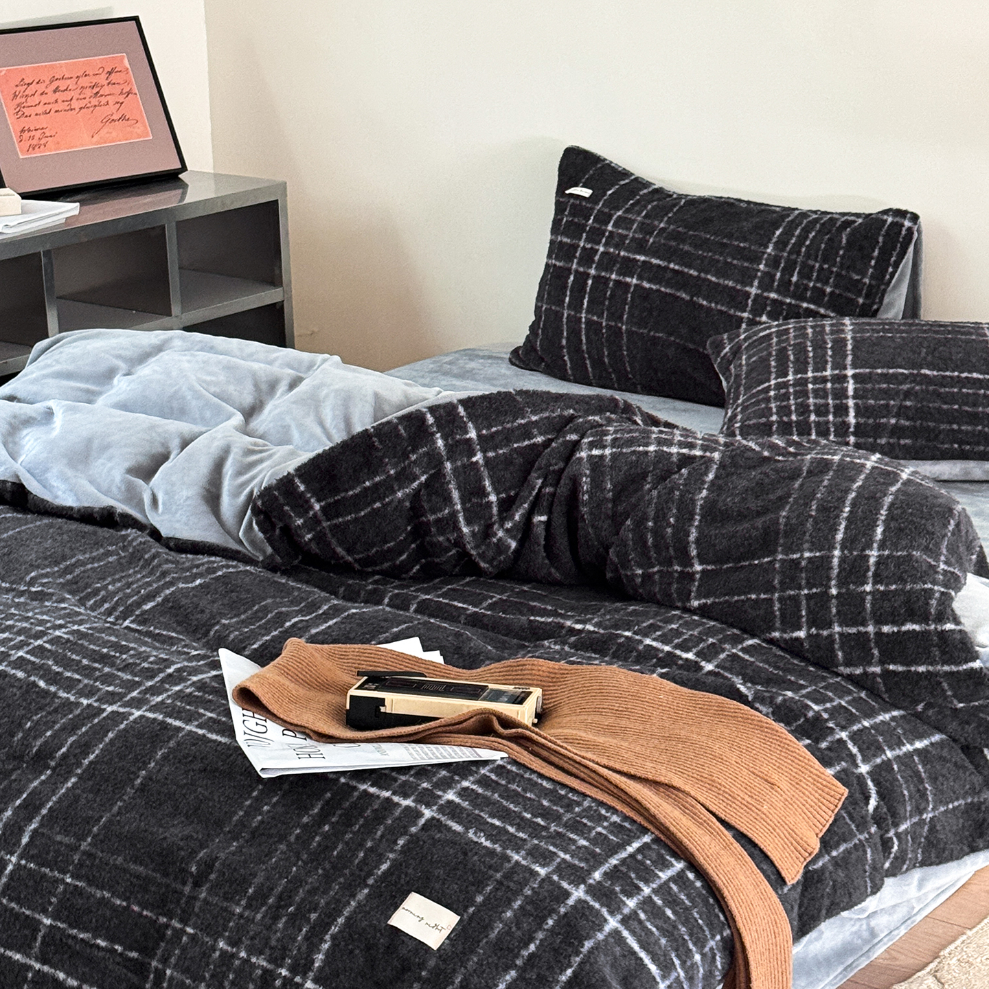 (总)小春日和 2025新款纯棉棉麻民宿中性风四件套高端全棉人字纹条纹被套加大纯色床单1.8床笠男士四件套,木笙-黑,木笙-米