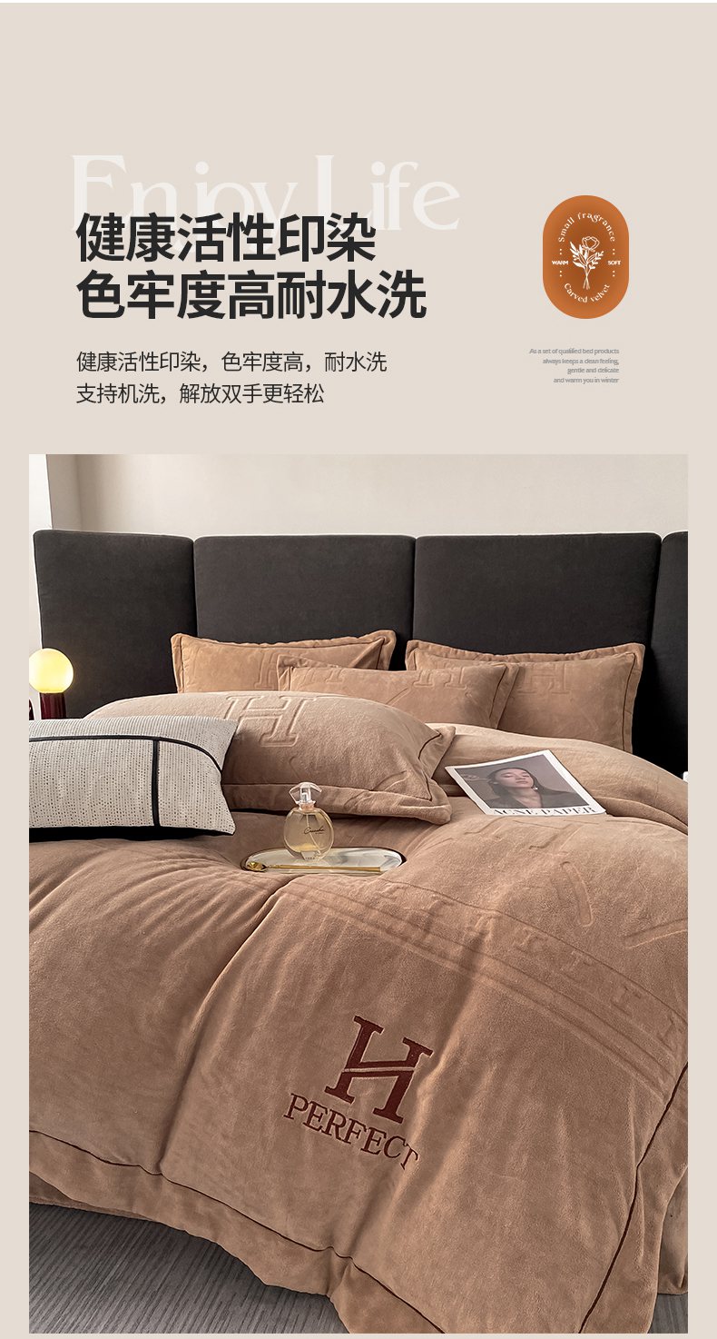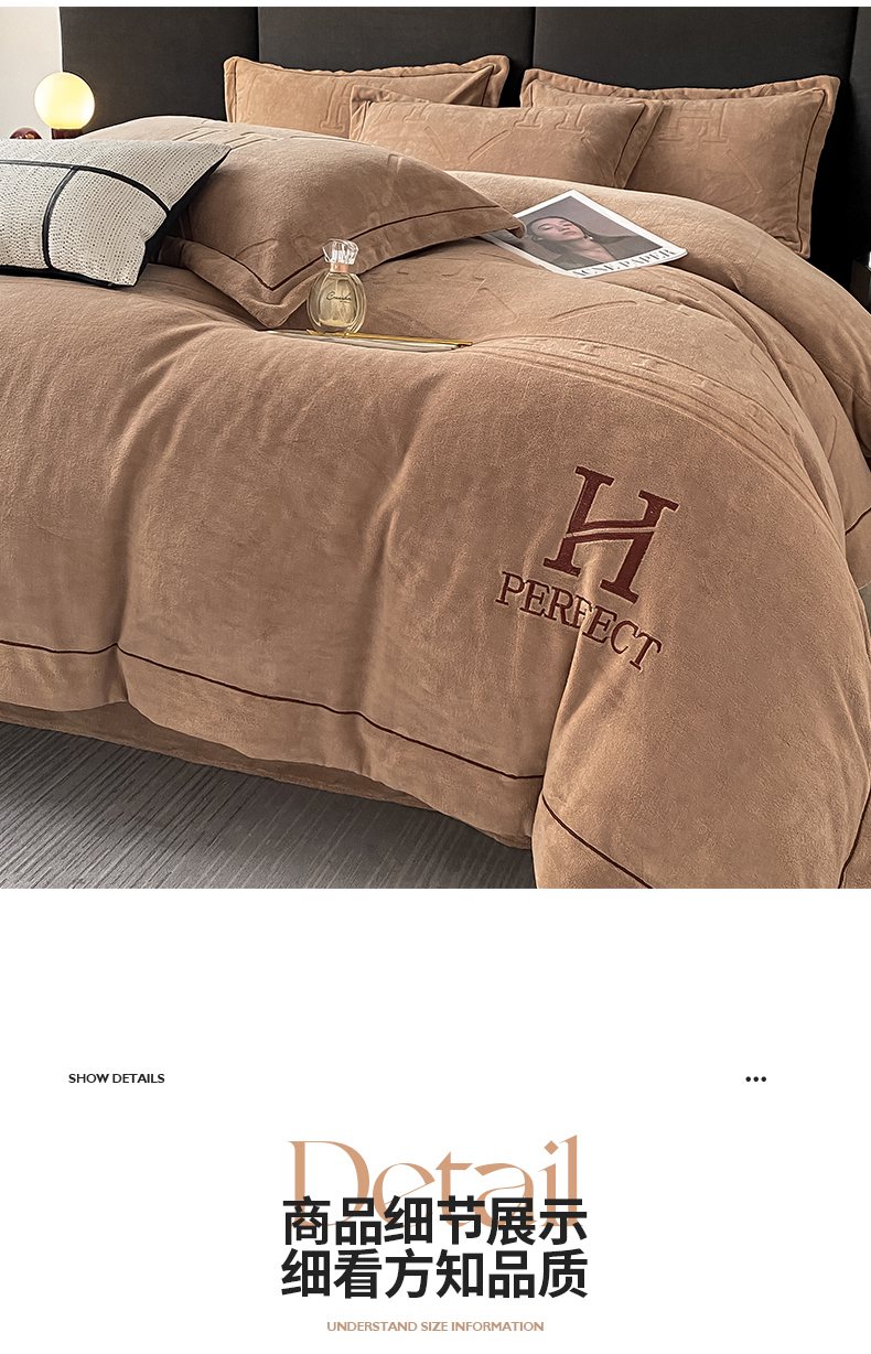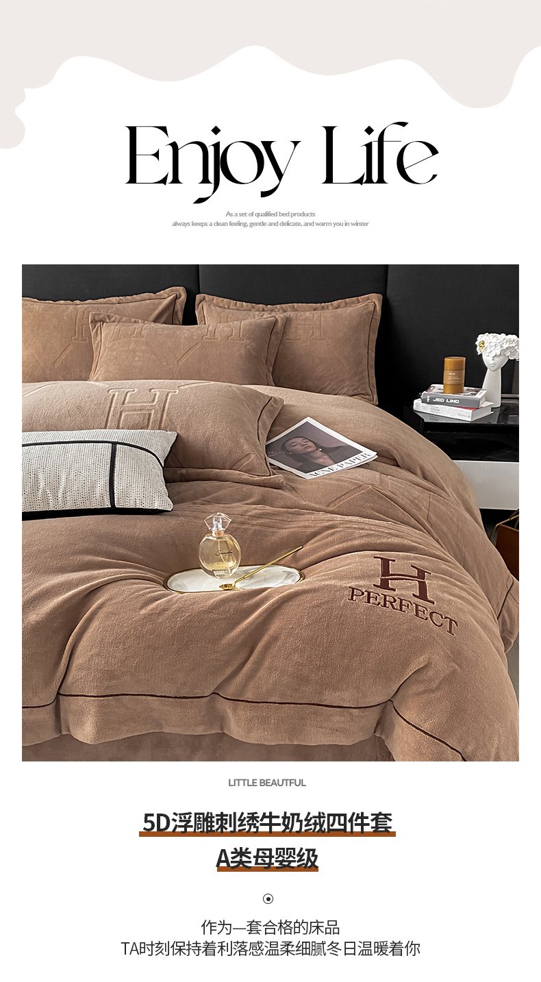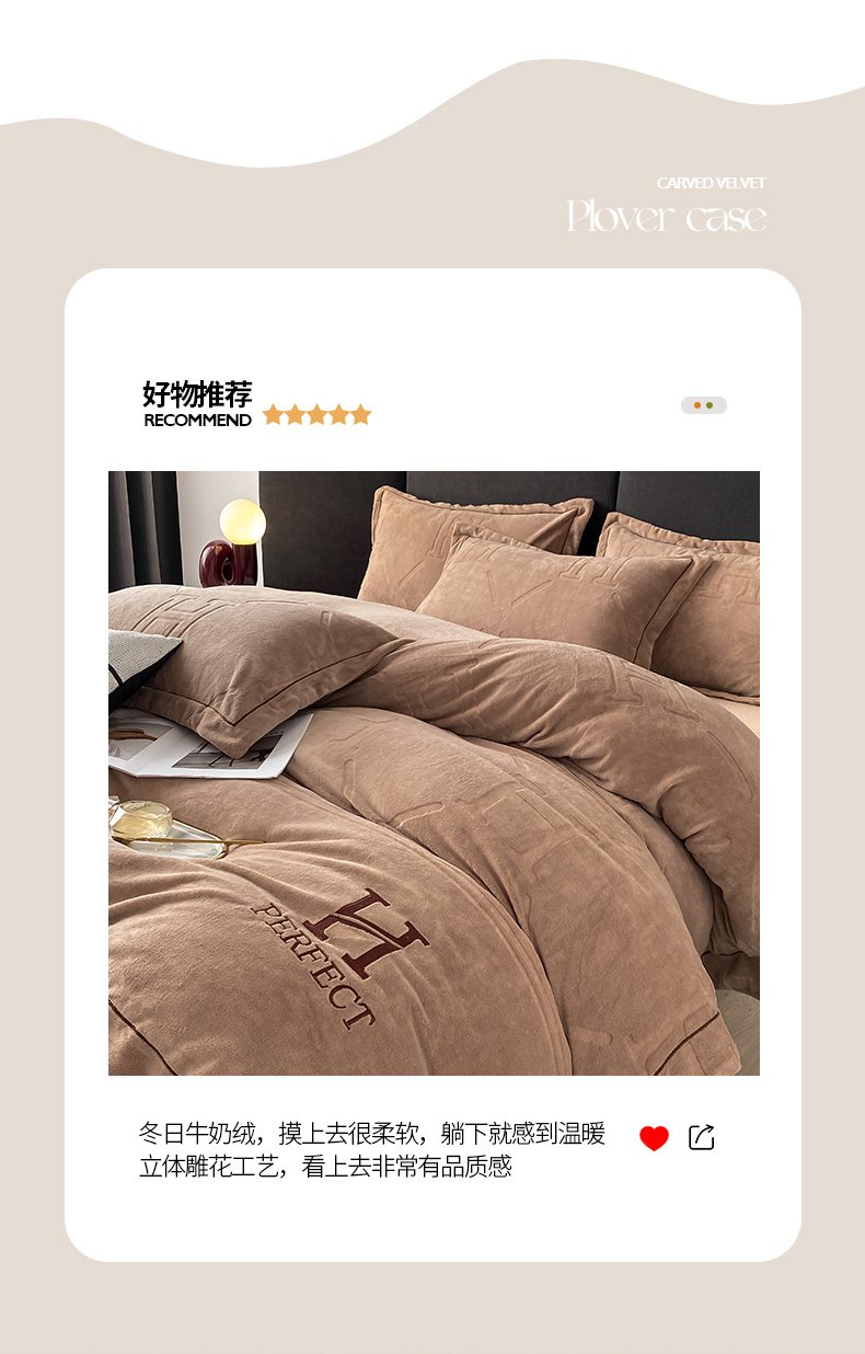 当前位置: 91家纺网 > 商品网购 > 床品套件 > 四件套 > 牛奶绒四件套 > 艾佳 2025新款A类全高克重雕花烂花刺绣牛奶绒四件套-小H系列 小H奶茶咖