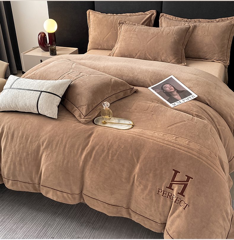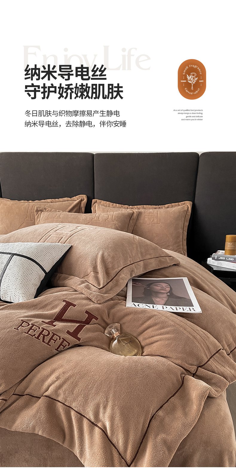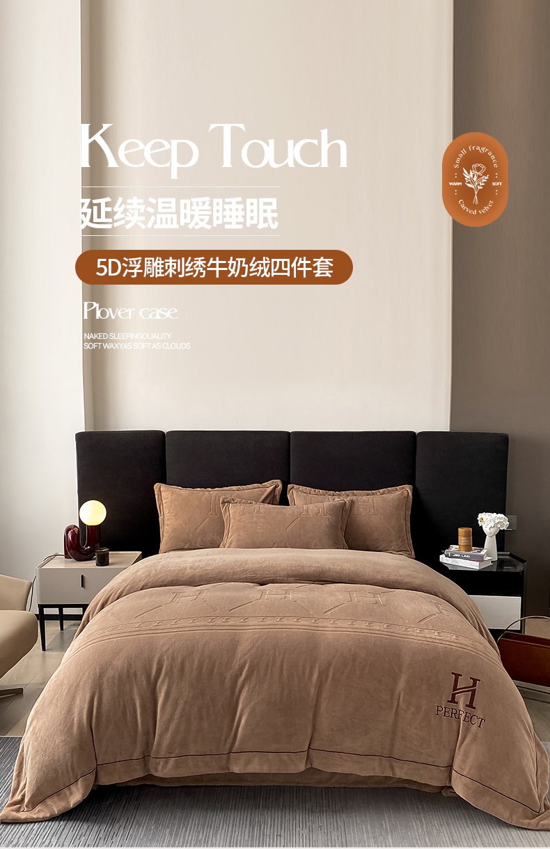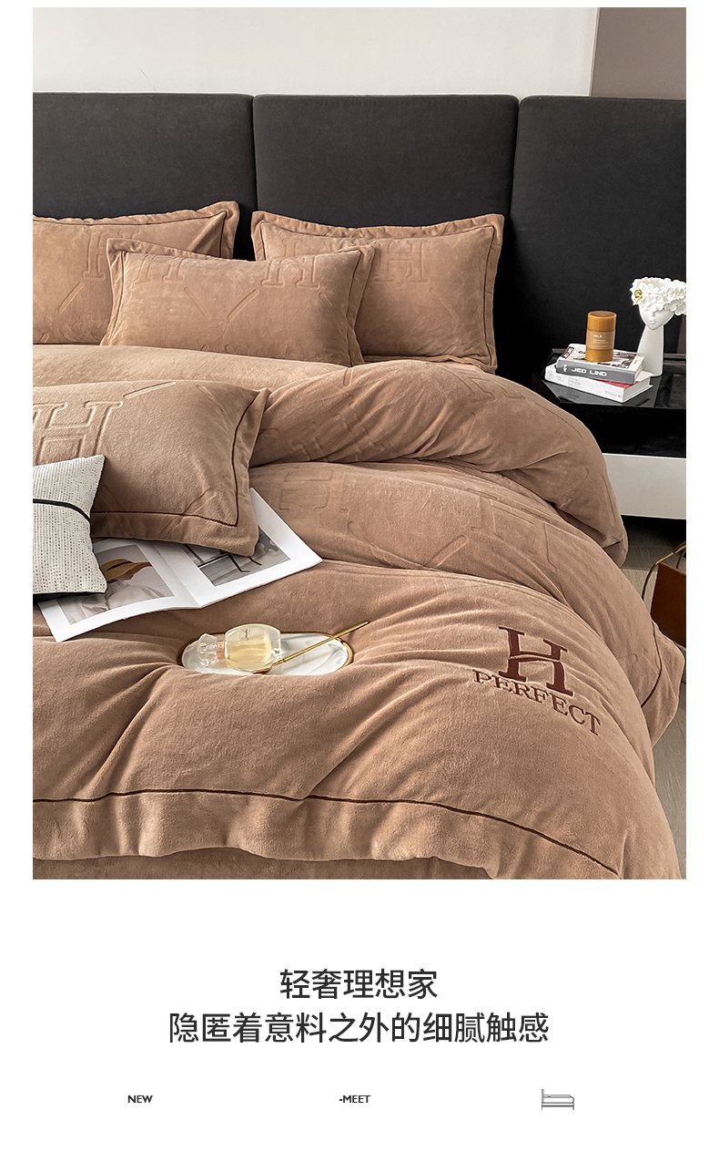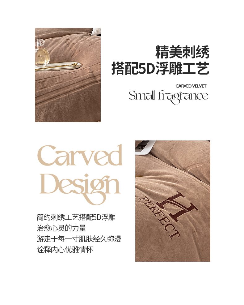 当前位置: 91家纺网 > 商品网购 > 床品套件 > 四件套 > 牛奶绒四件套 > 艾佳 2025新款A类全高克重雕花烂花刺绣牛奶绒四件套-小H系列 小H奶茶咖