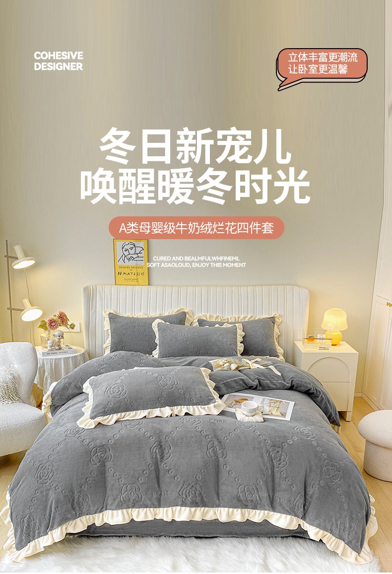 当前位置: 91家纺网 > 商品网购 > 床品套件 > 四件套 > 牛奶绒四件套 > 艾佳 2025新款高克重超柔牛奶绒婴儿绒雕花烂花四件套-山茶花系列 山茶花- 韩版极简灰
