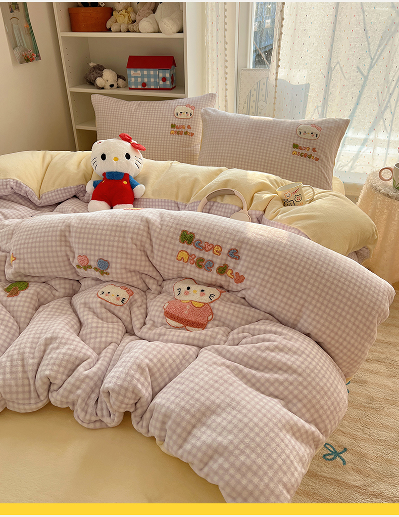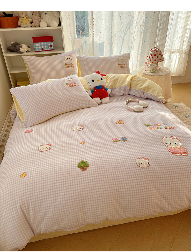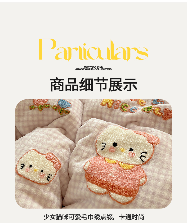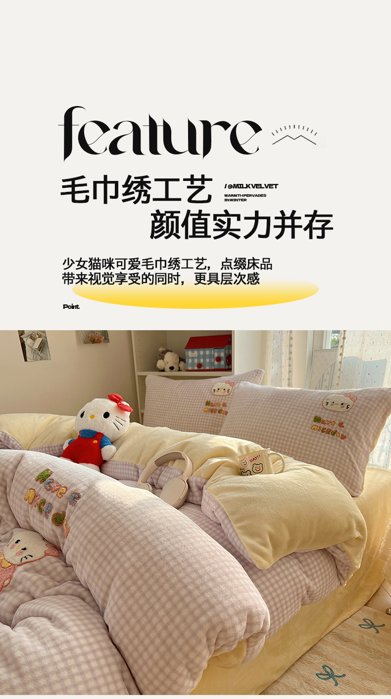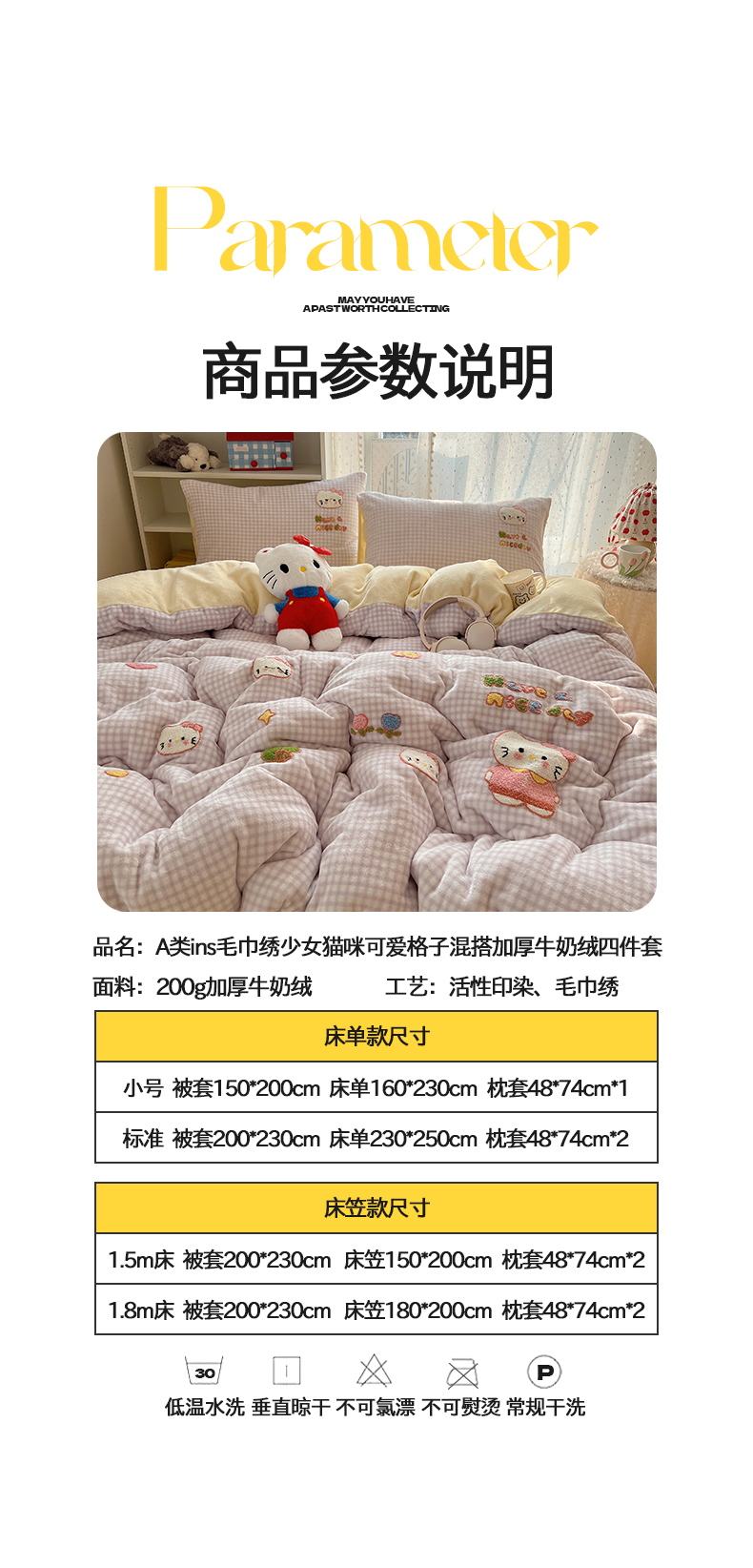 当前位置: 91家纺网 > 商品网购 > 床品套件 > 四件套 > 牛奶绒四件套 > 桃子家居 2025新款A类ins毛巾绣少女猫咪可爱格子混搭加厚牛奶绒系列四件套 绒毛巾绣-心愿猫紫黄