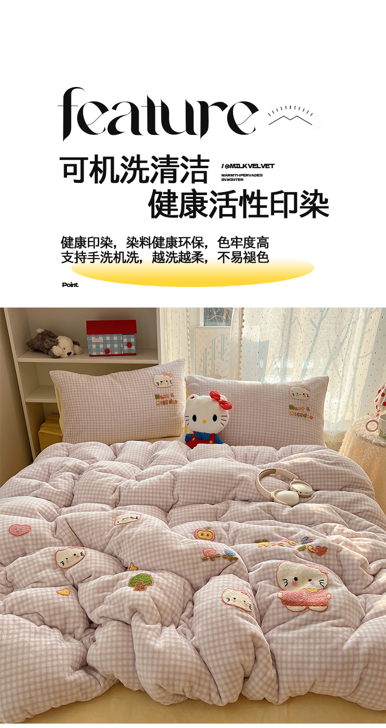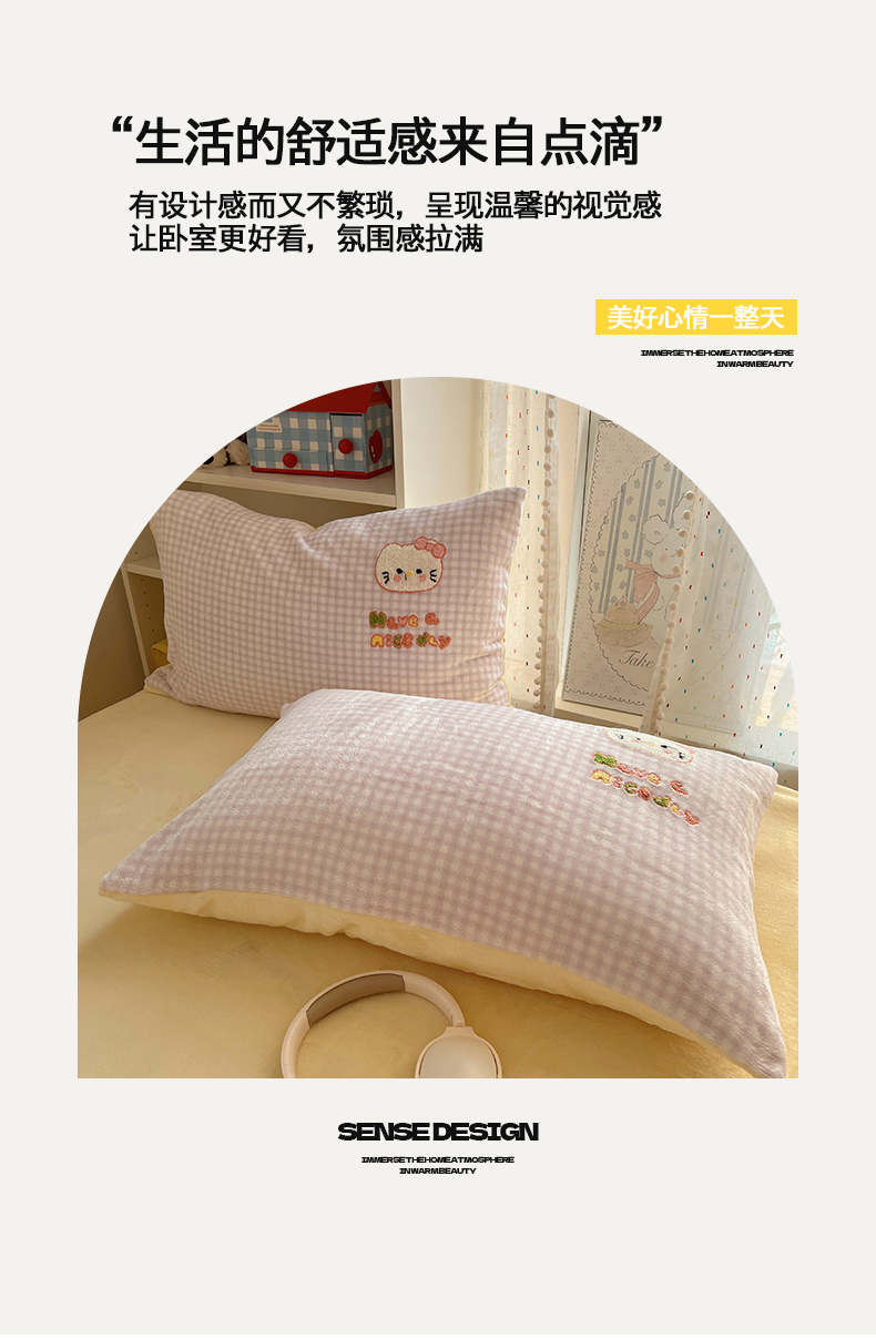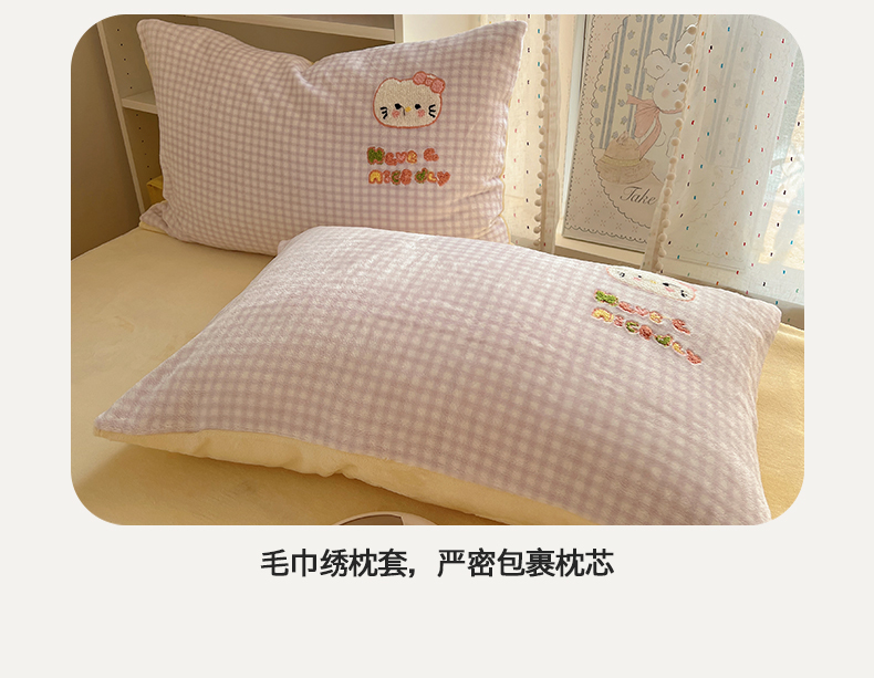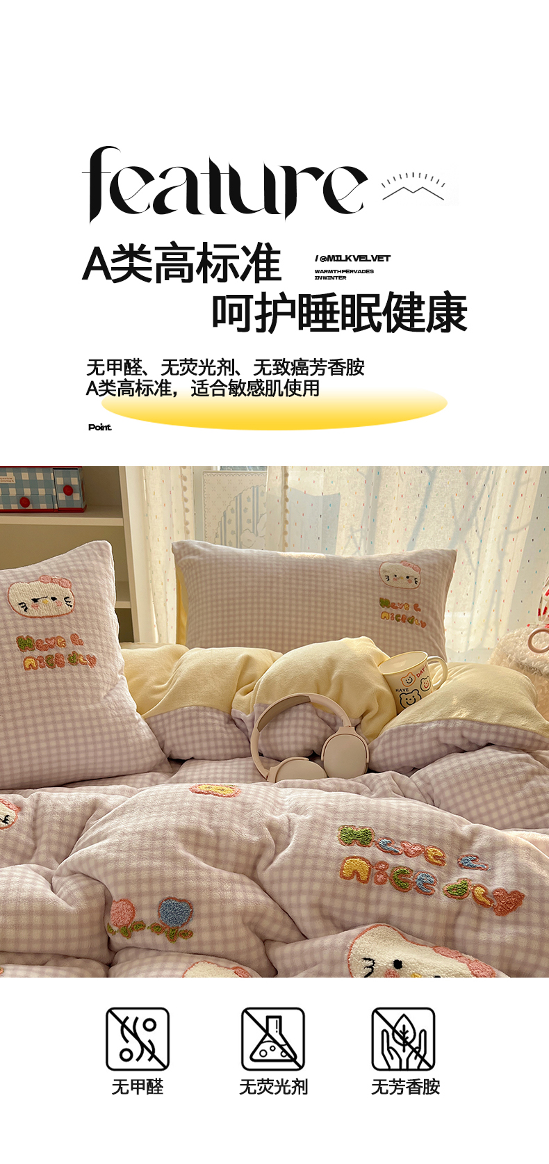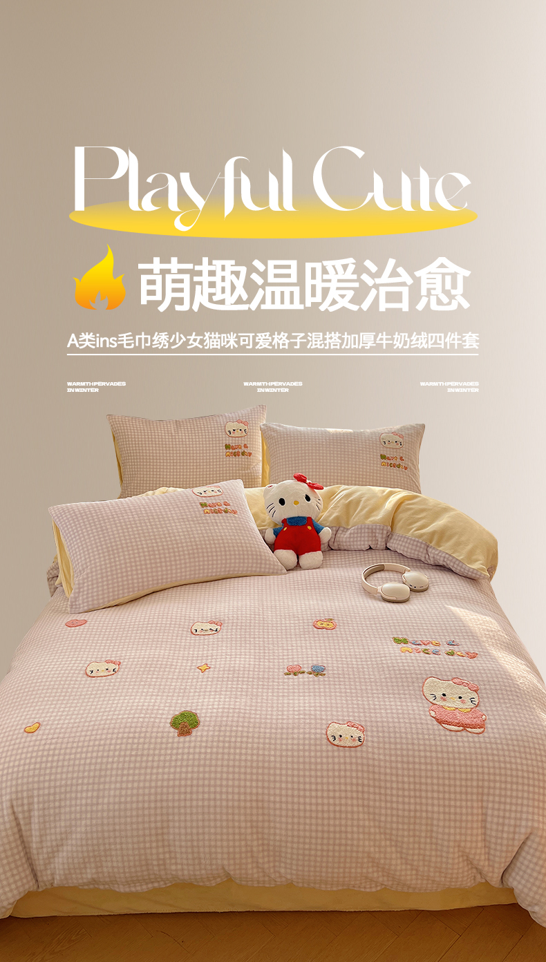 当前位置: 91家纺网 > 商品网购 > 床品套件 > 四件套 > 牛奶绒四件套 > 桃子家居 2025新款A类ins毛巾绣少女猫咪可爱格子混搭加厚牛奶绒系列四件套 绒毛巾绣-心愿猫紫黄