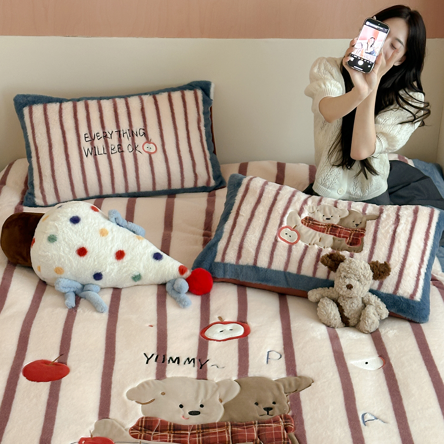 (总)觅糖 2024新款满版卡通牛奶绒套件,Good 猫柠,糯米团,起司棕熊,兔泡泡,雪饼小狗,椰椰龙崽
