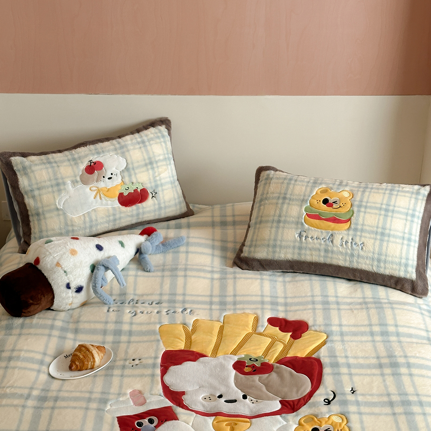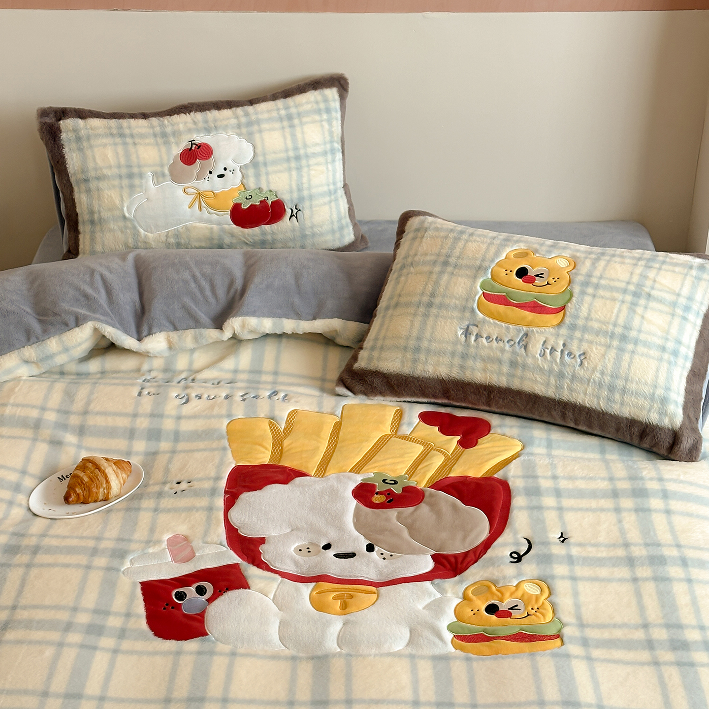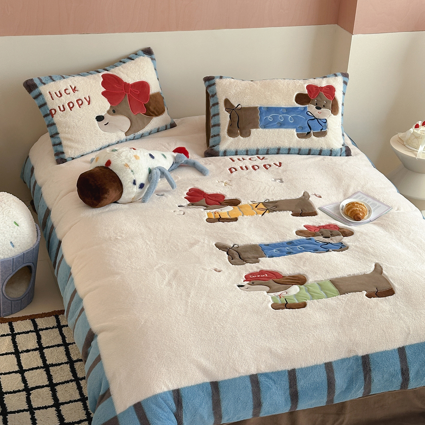 觅糖家纺 2025新款大版卡通兔毛绒系列刺绣四件套 薯条狗狗