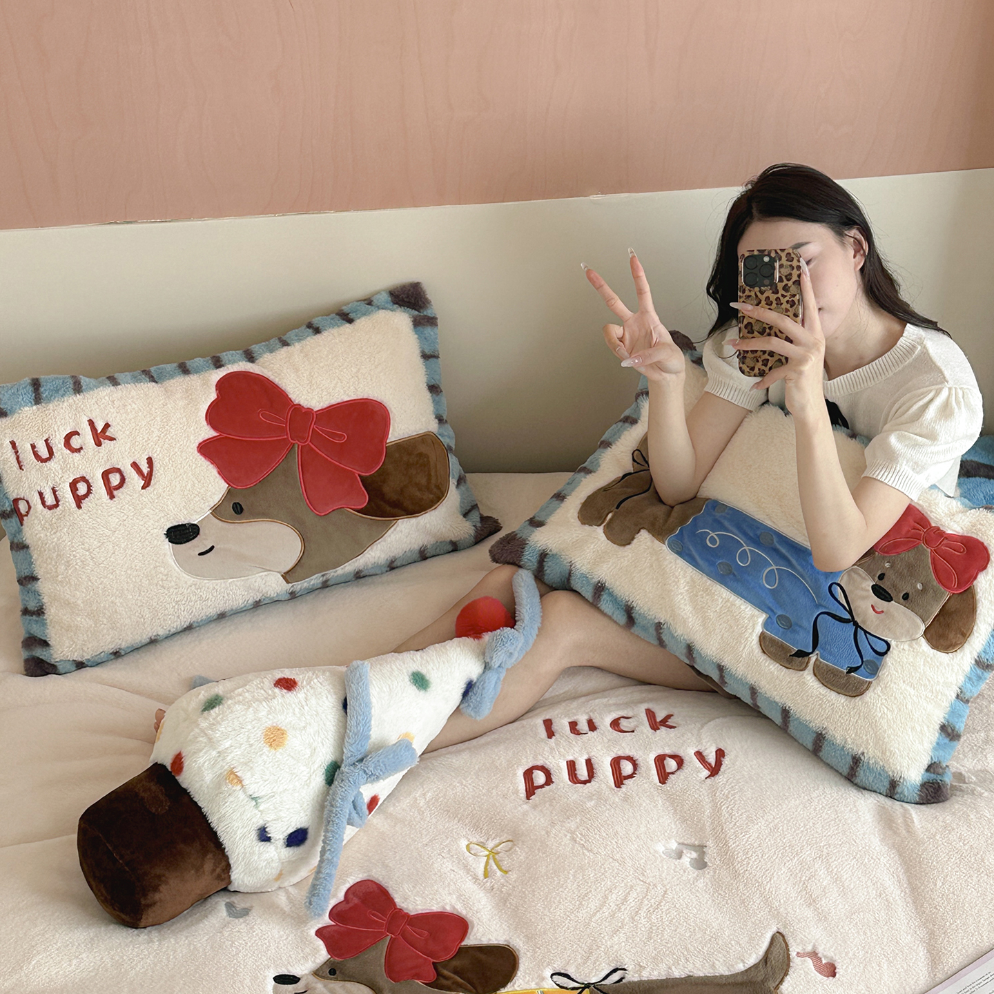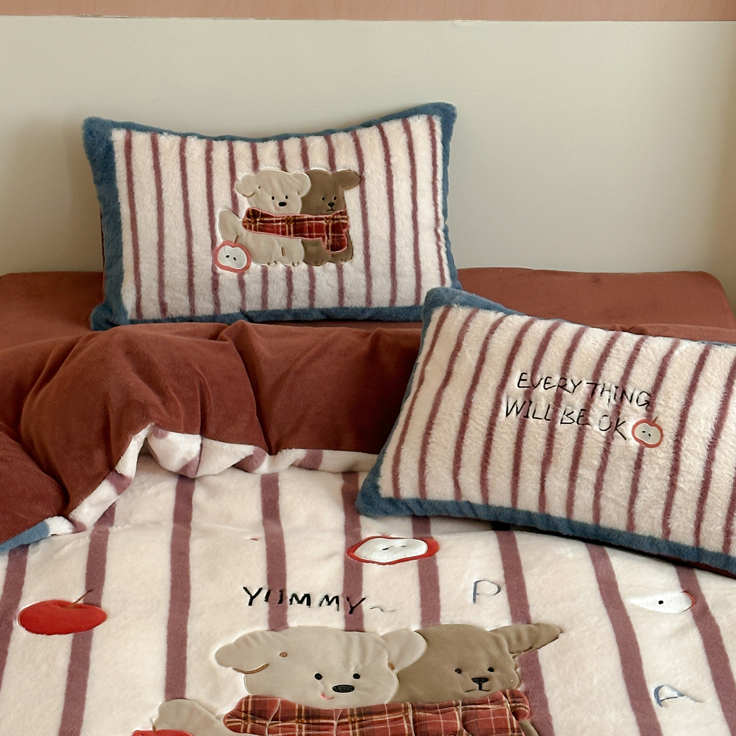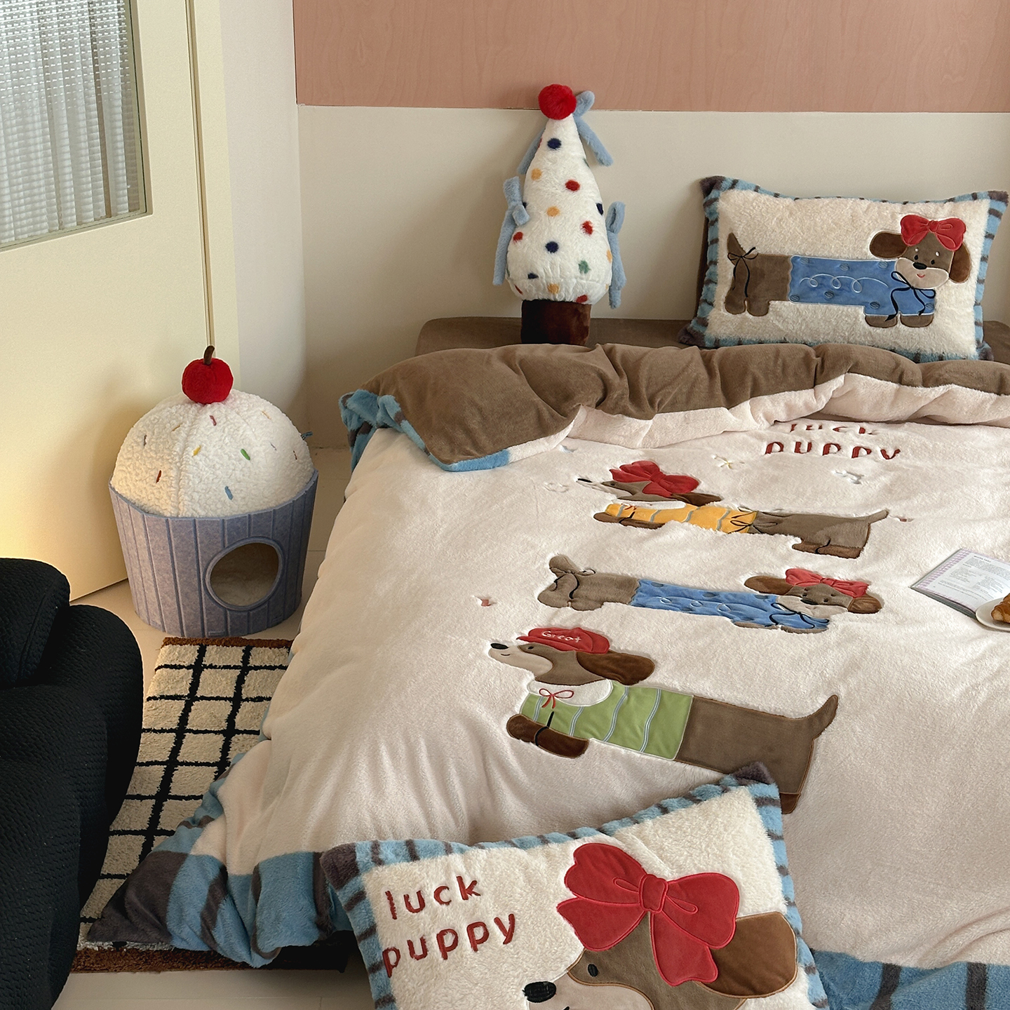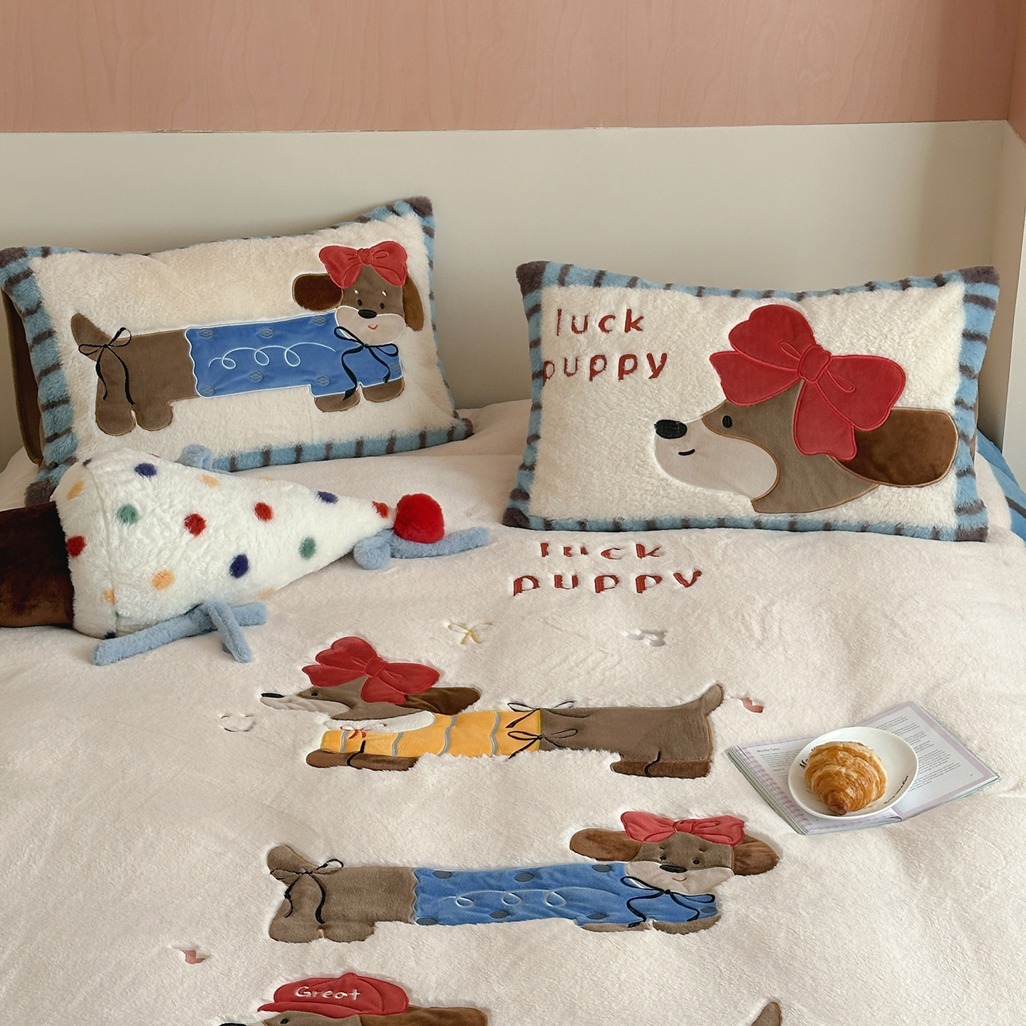 觅糖家纺 2025新款大版卡通兔毛绒系列刺绣四件套 薯条狗狗