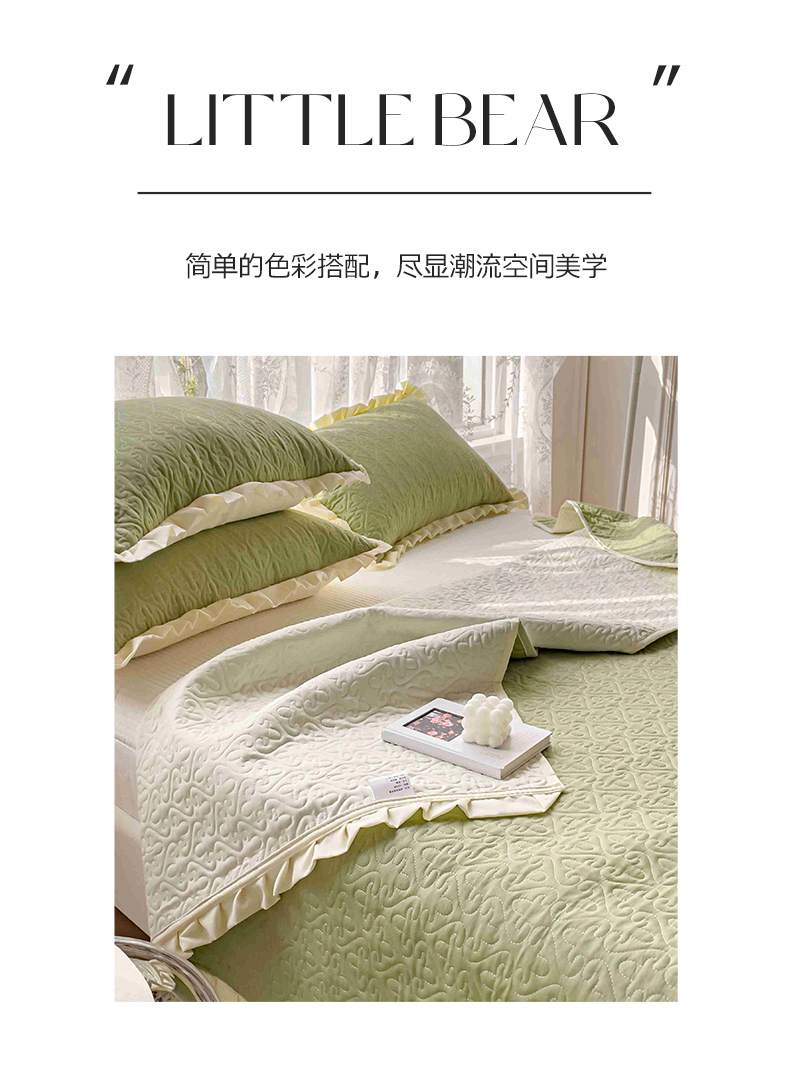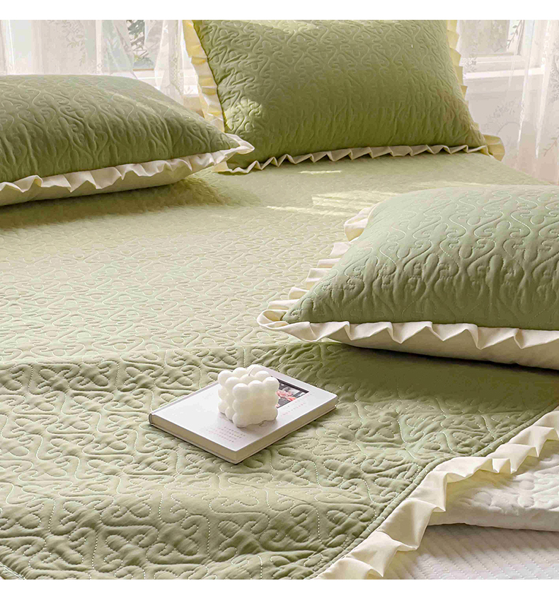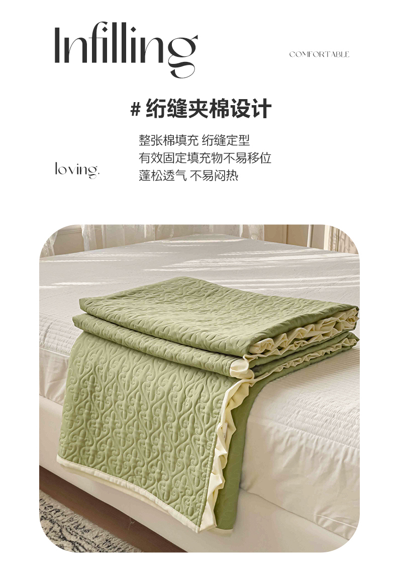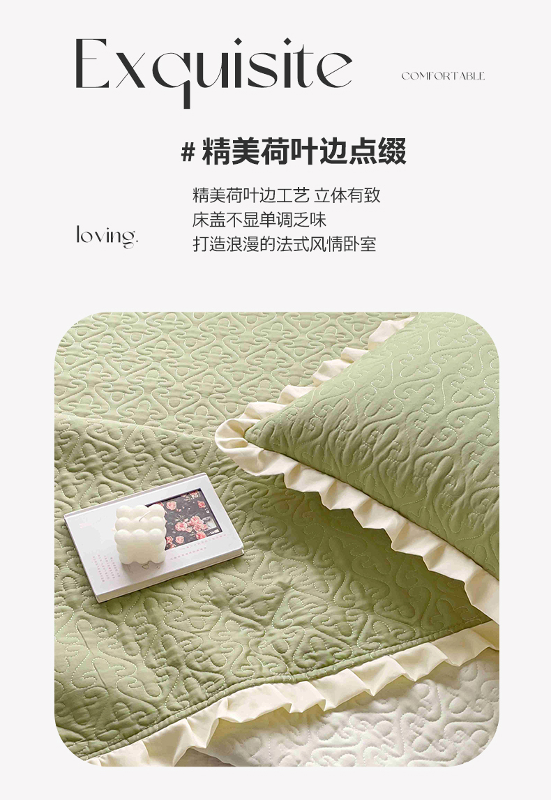 • 91家纺网 家纺一手货源 找家纺 妮可 2025新款全棉纯色花边款40S纯棉夹棉绗缝四季款多功能床盖 青草绿