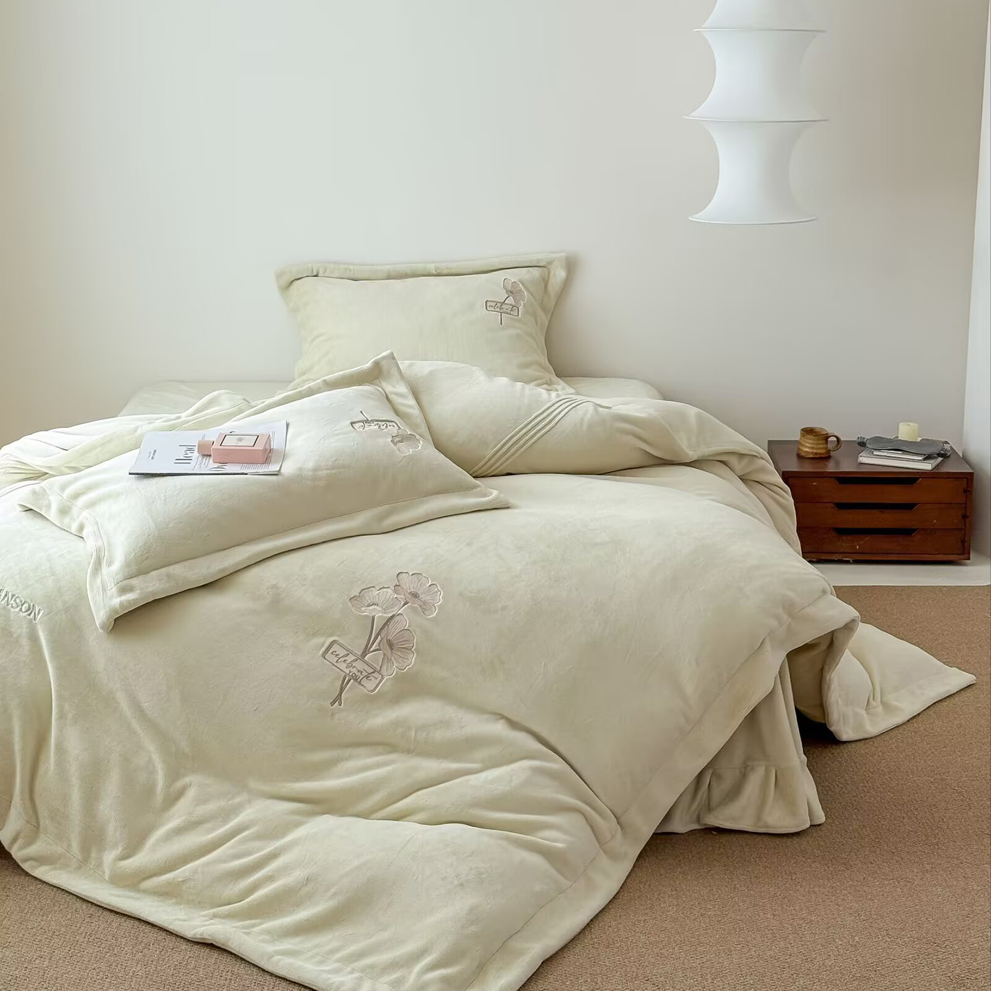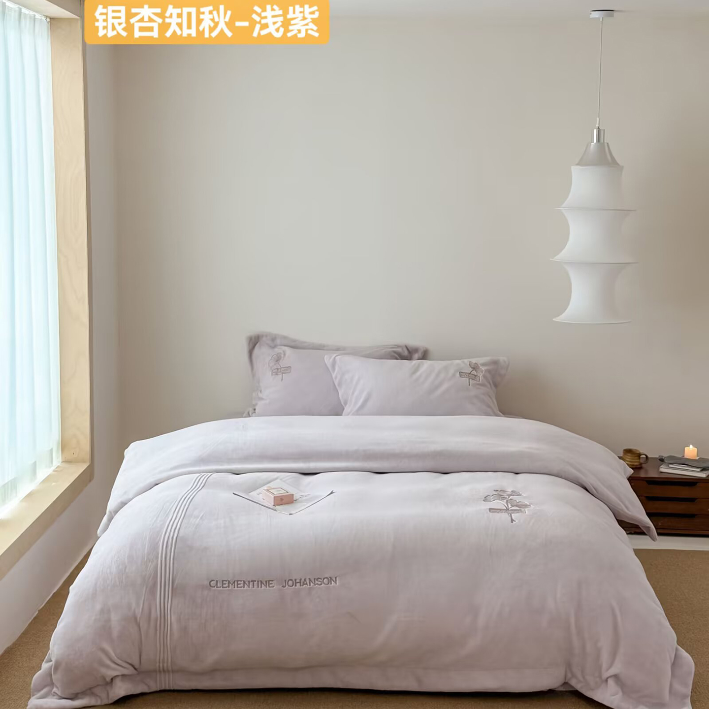 玖玖爱家纺 2025新款牛奶绒加厚全工艺同色绣花四件套-银杏知秋 银杏知秋-玉粉