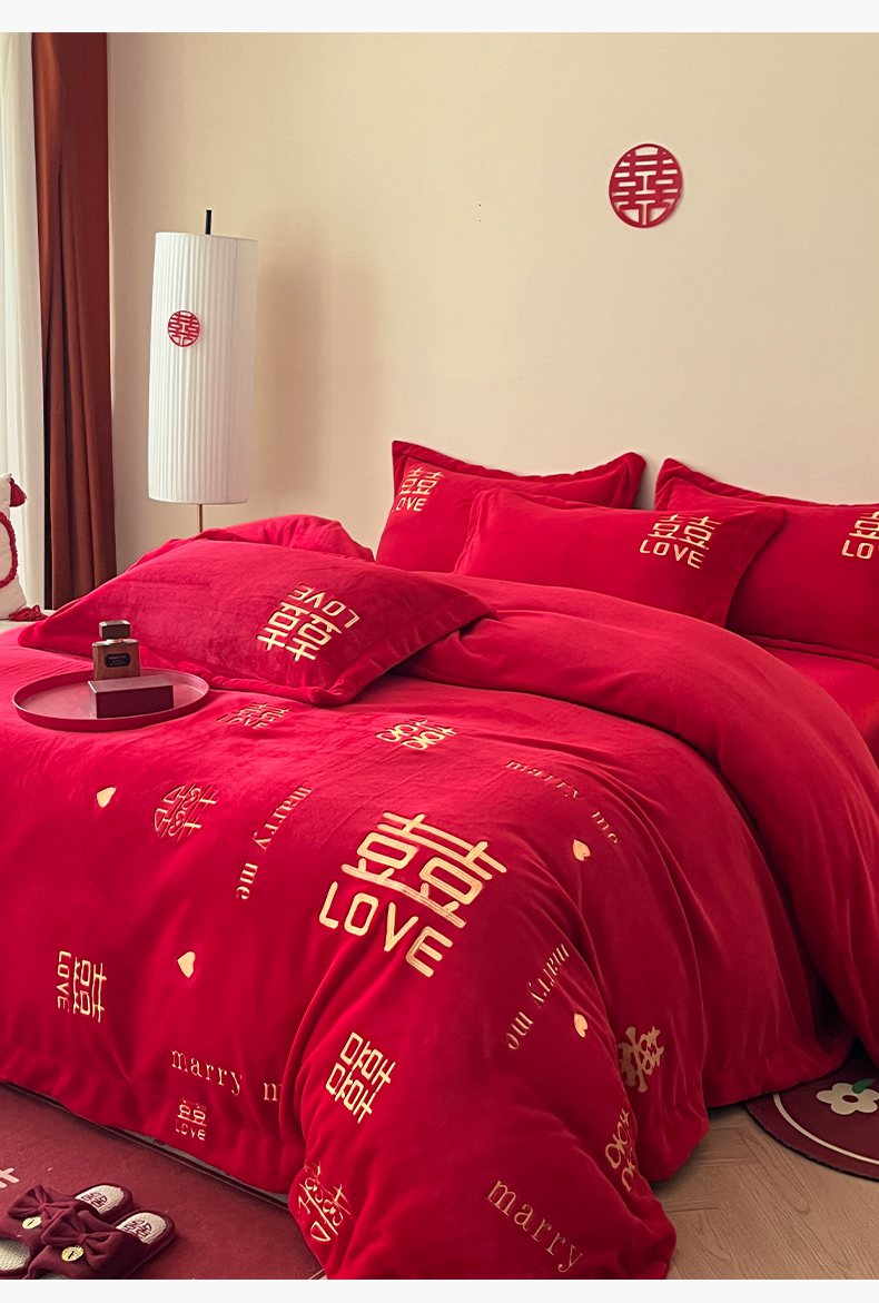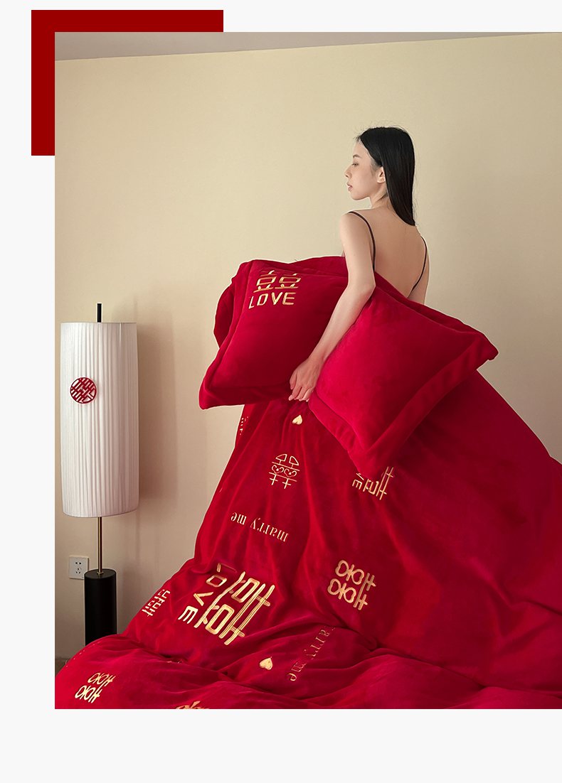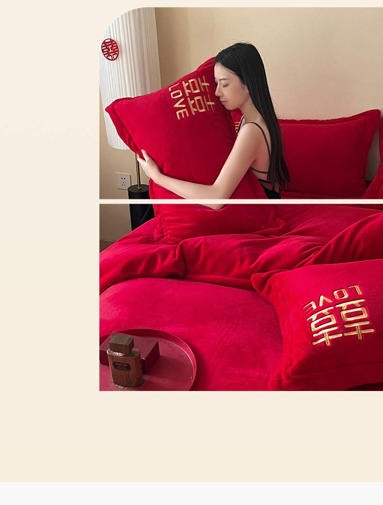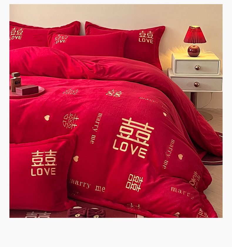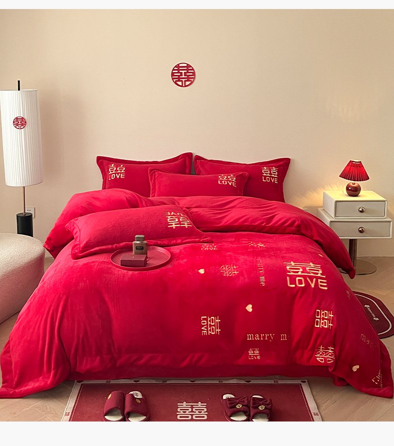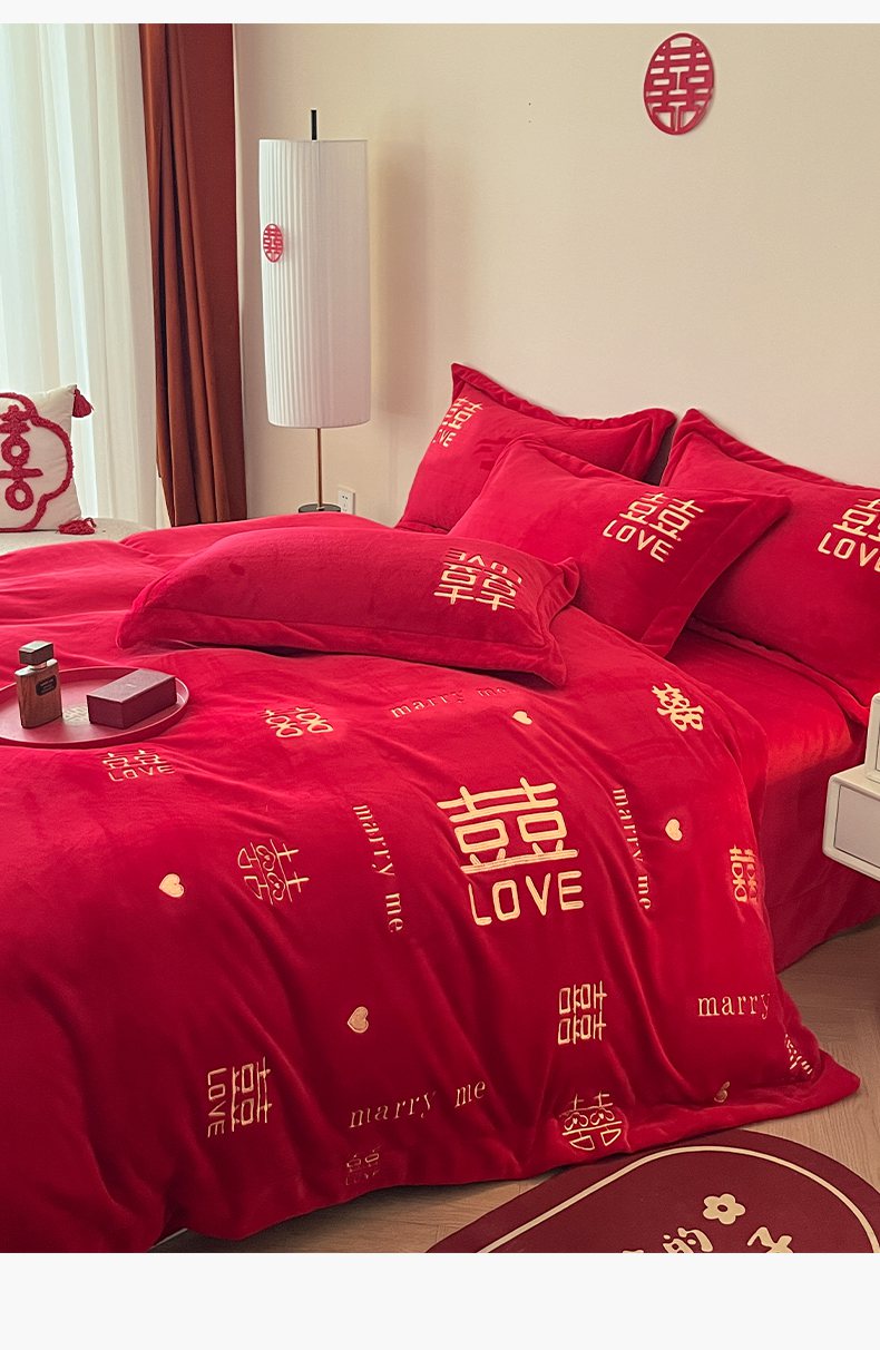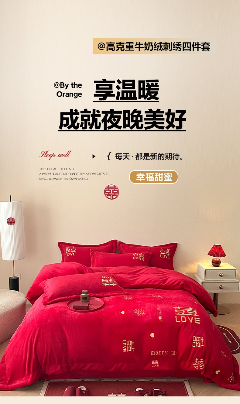 (总)欧乐蒂 2025新款高克重牛奶绒刺绣四件套-家家有喜,家家有喜-红,家家有喜-金