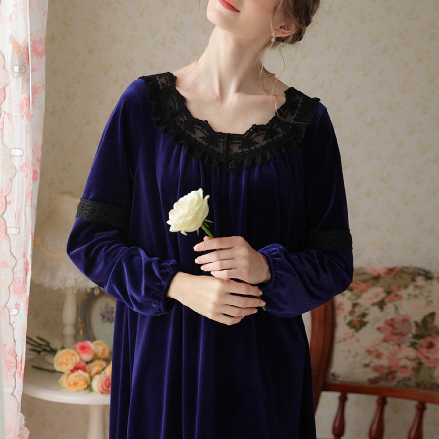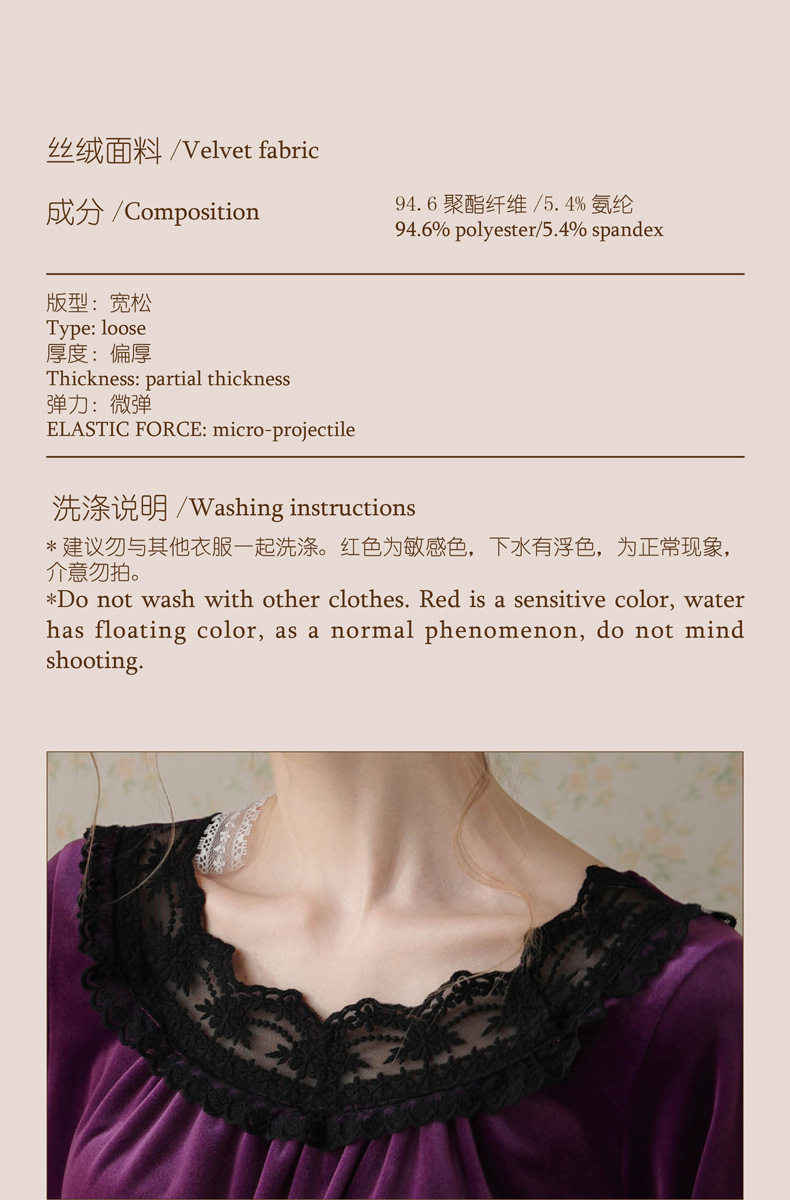 商品名称:洛兰沙家居馆 2026新款秋冬宽松复古蕾丝丝绒睡裙少女厚长袖长款公主风蓄热保暖家居服绒睡衣 红色