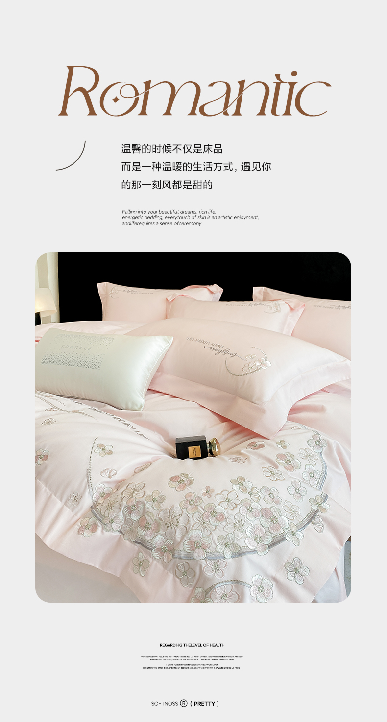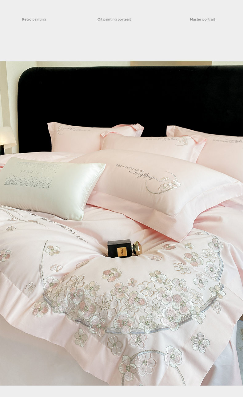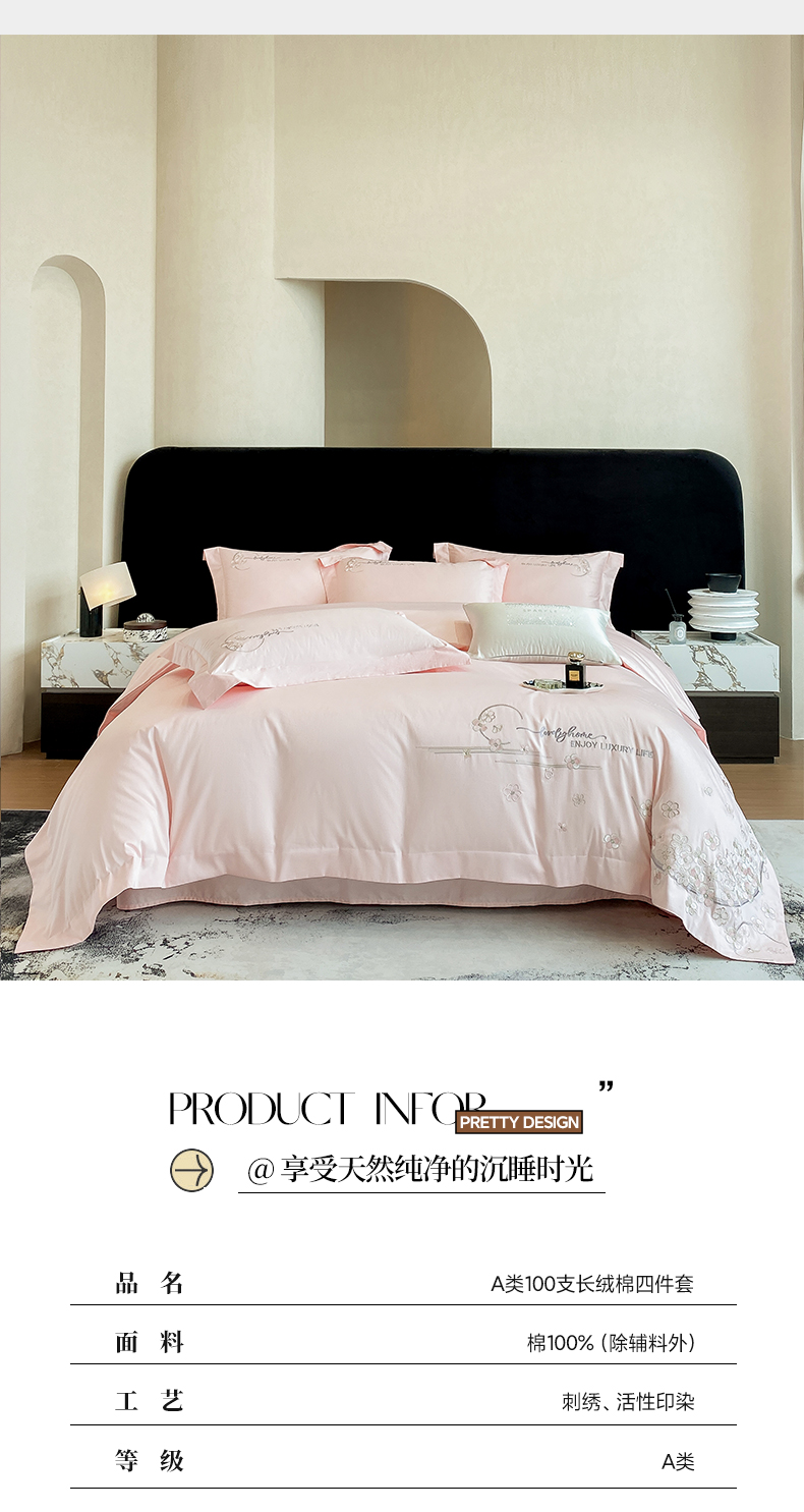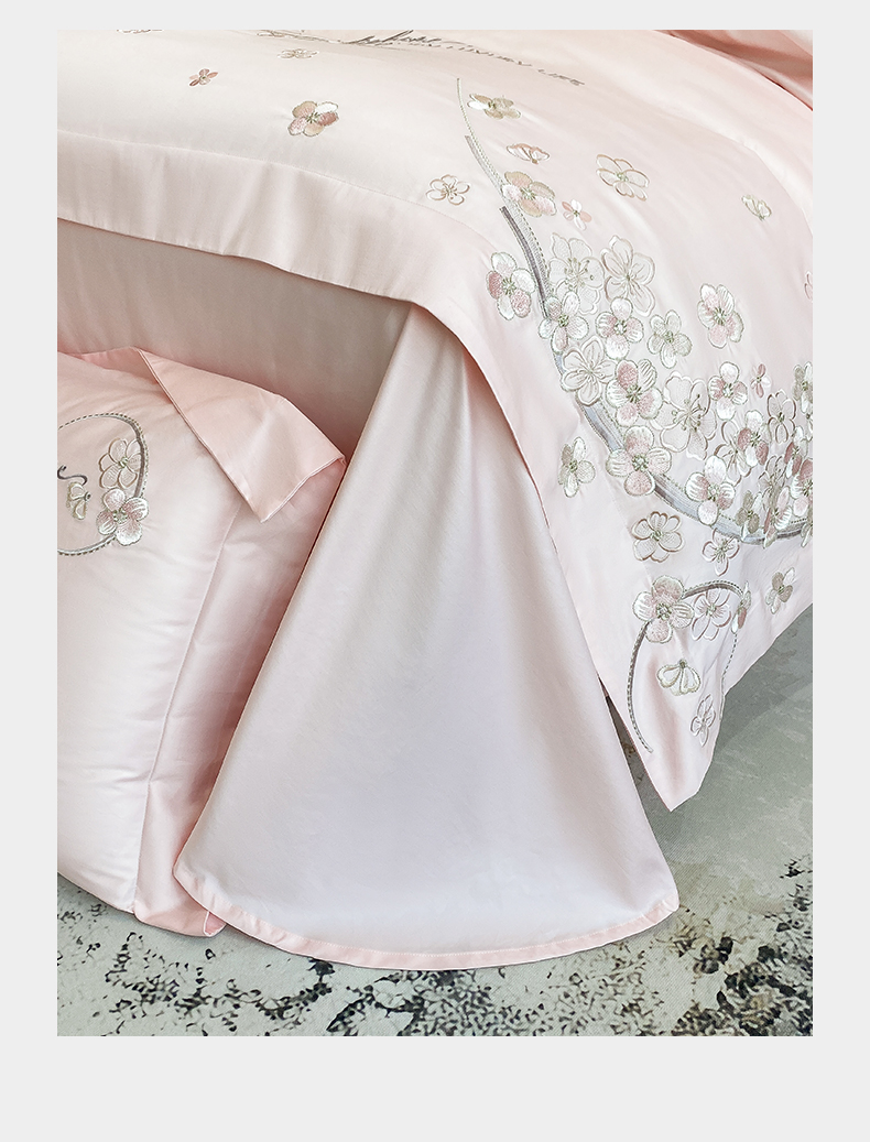 商品名称:欣宜家纺 2026春夏新款60支A类新疆长绒棉刺绣轻奢风四件套 樱花-少女粉