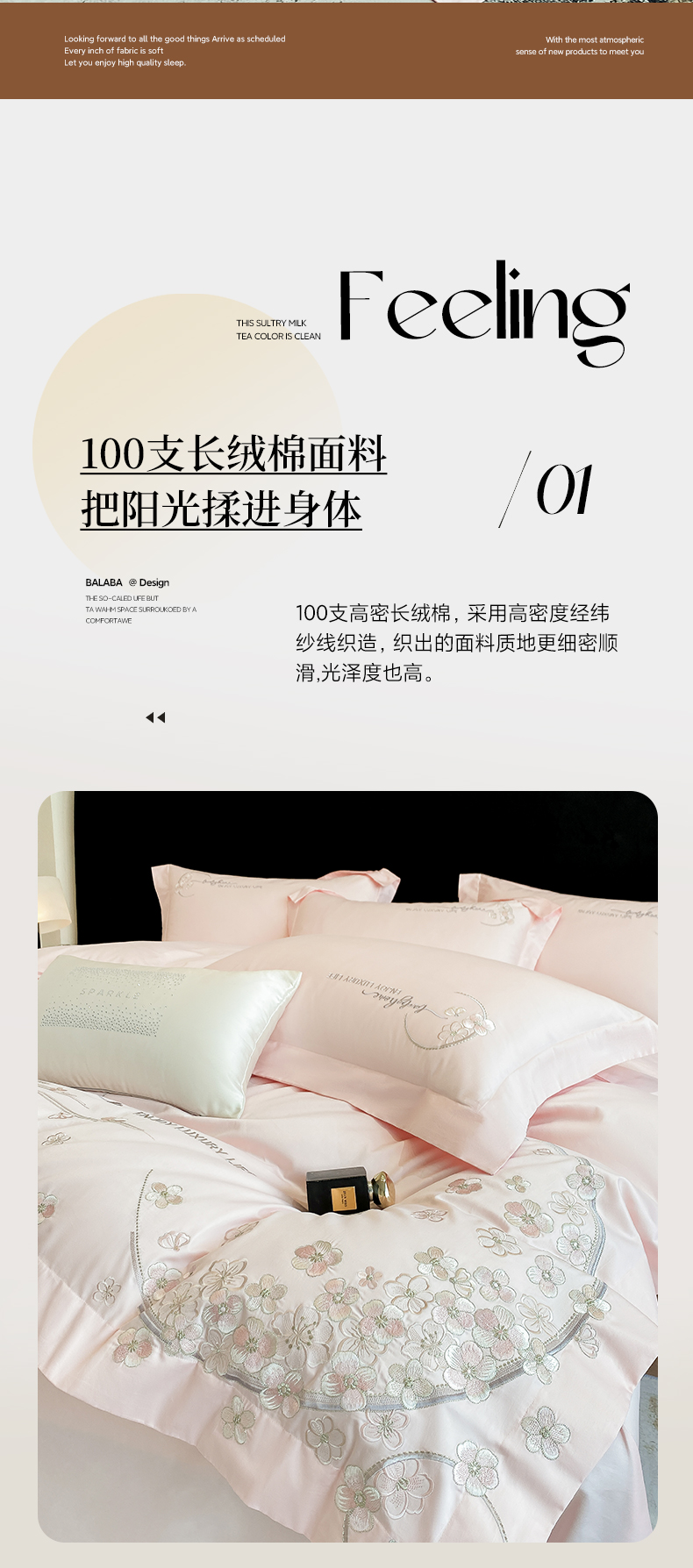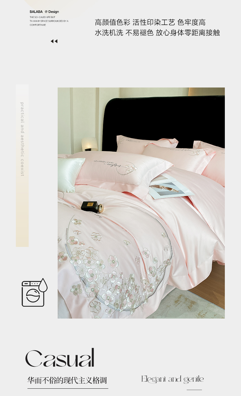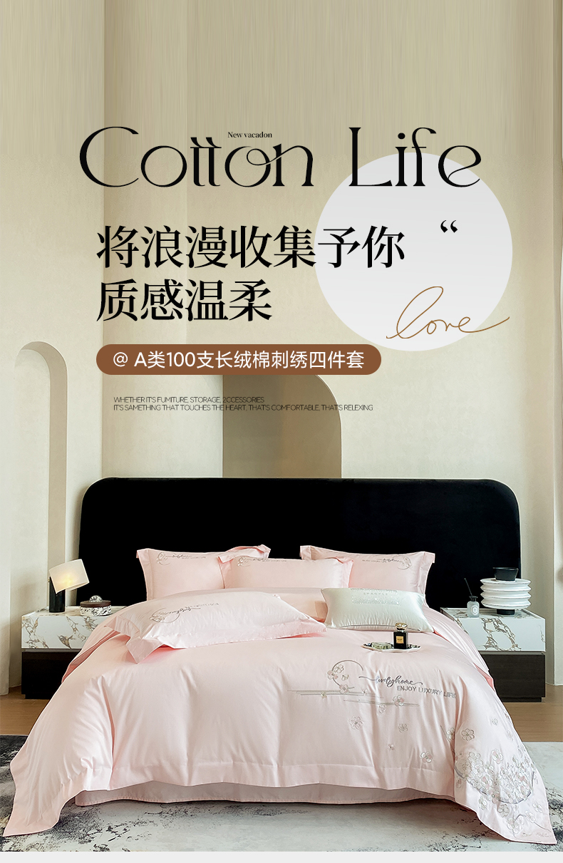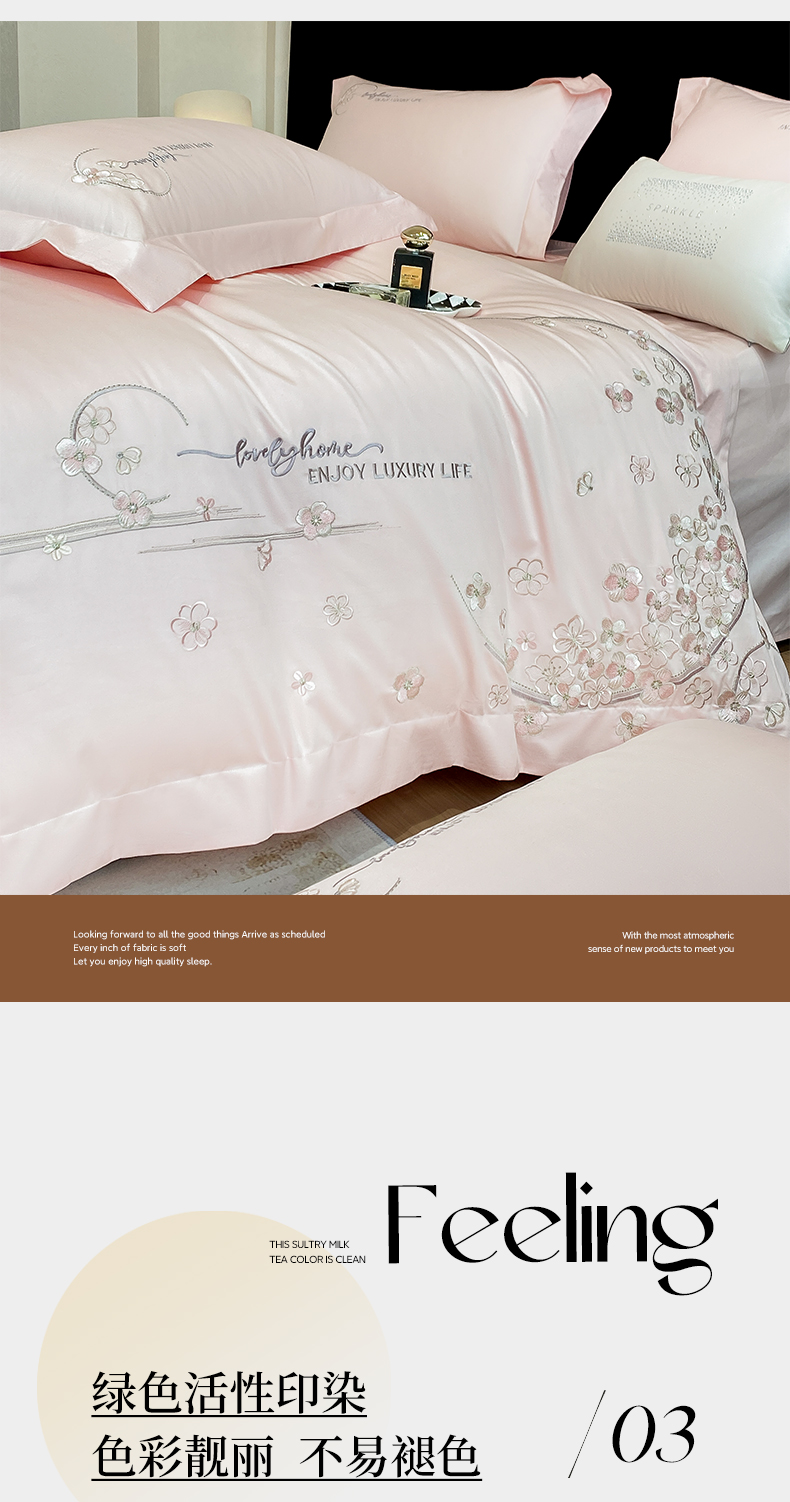 商品名称:欣宜家纺 2026春夏新款60支A类新疆长绒棉刺绣轻奢风四件套 樱花-少女粉