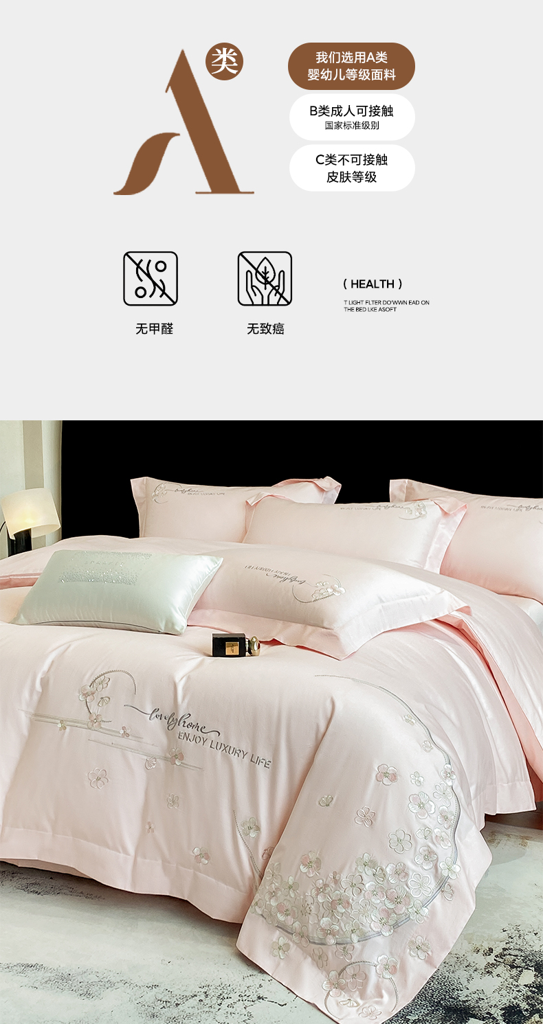 欣宜家纺 2026春夏新款60支A类新疆长绒棉刺绣轻奢风四件套 樱花-少女粉
