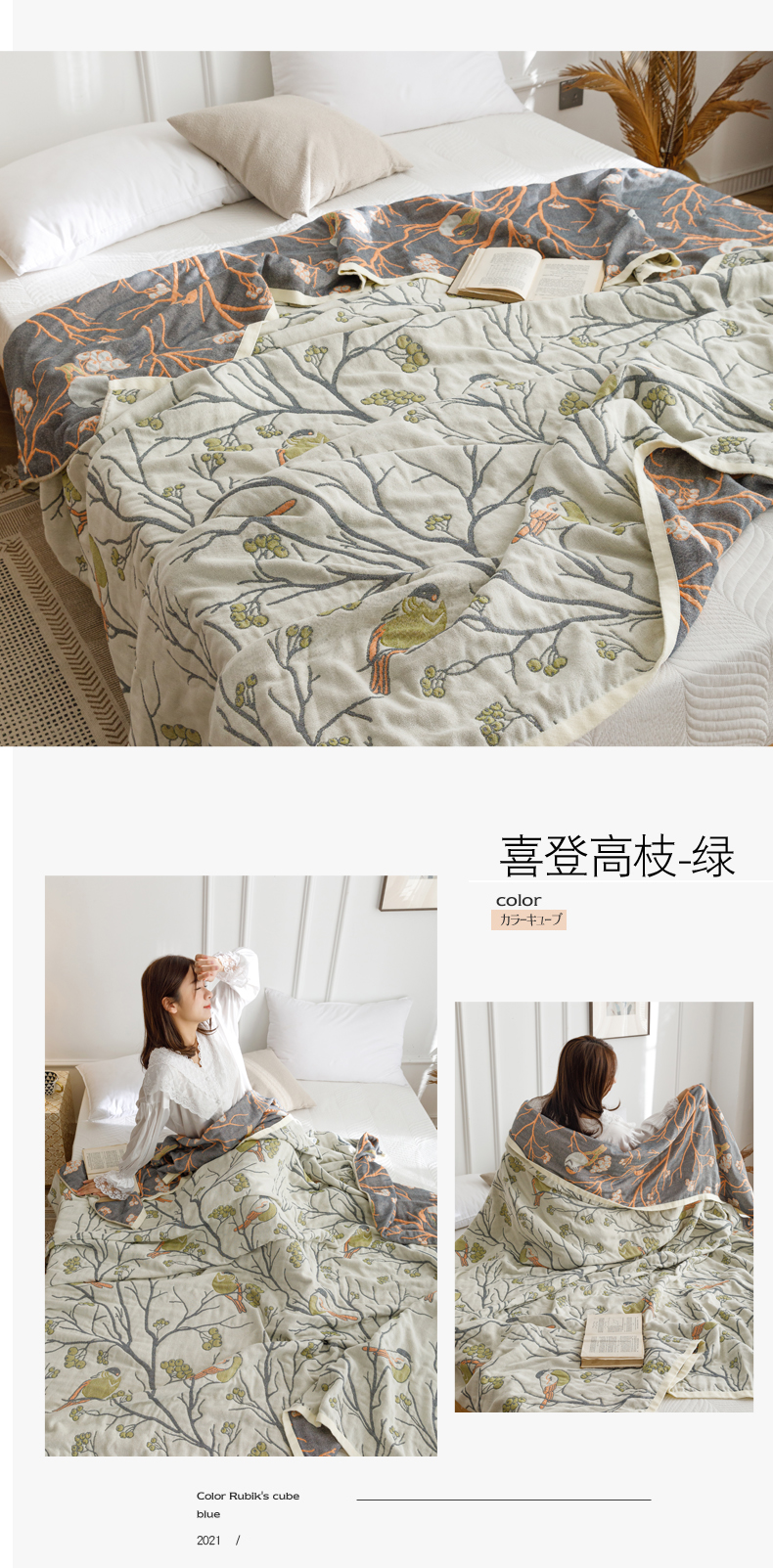 朴尔家纺-毛巾被 2026春夏新款水洗全棉纯棉四层细纱系列毛巾被下班夏凉被空调被 年轮-绿毛巾被