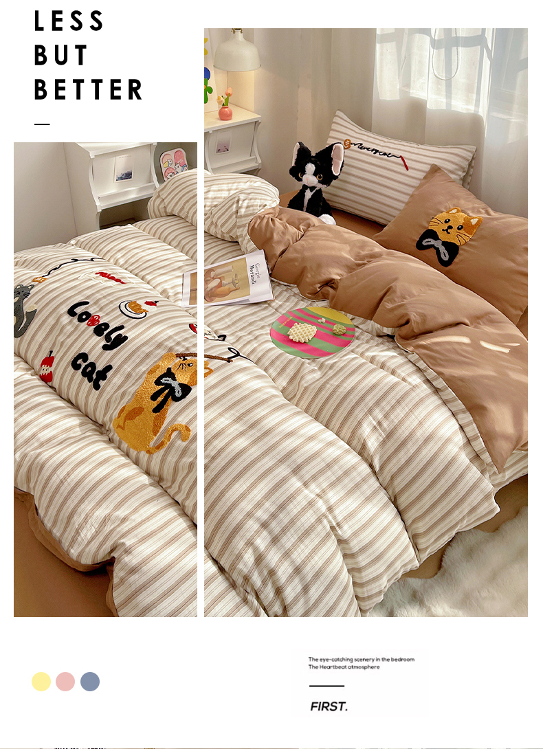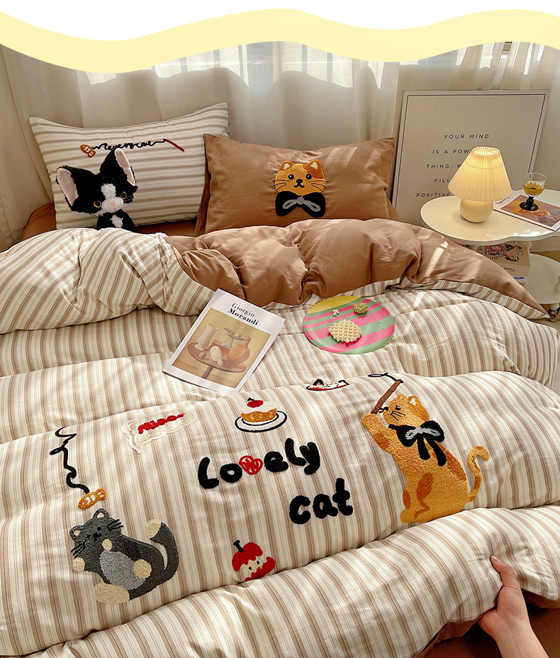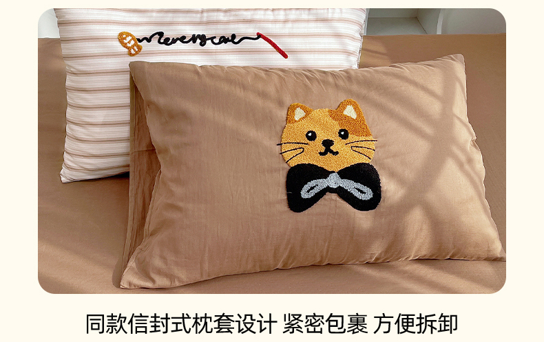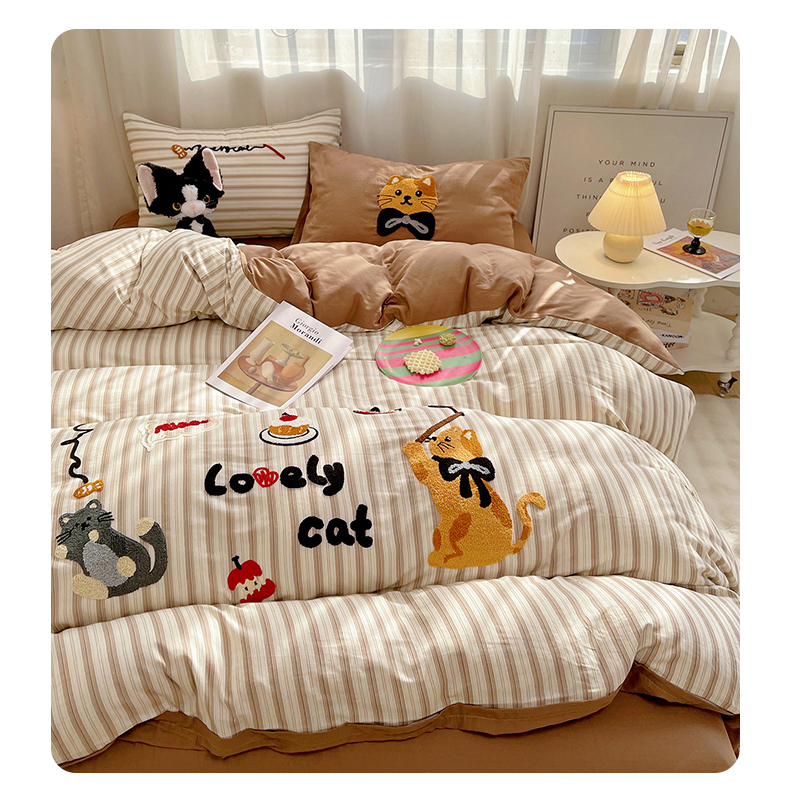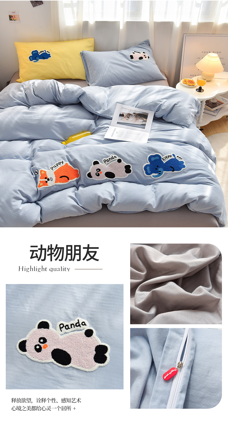 (总)炫拼家纺 2026新款A类棉麻刺绣卡通贝壳边四件套-布鲁系列,布鲁-小猫,布鲁-小熊,布鲁-小狗,布鲁-小马
