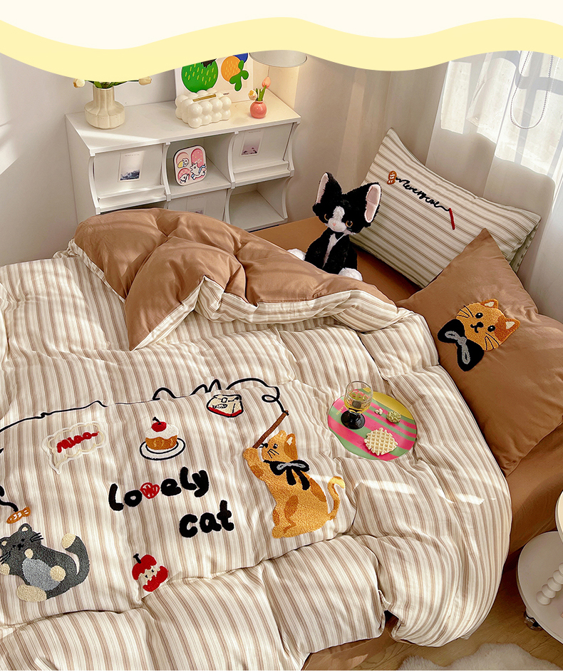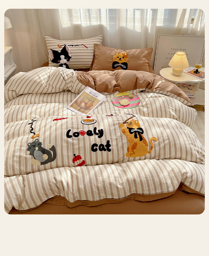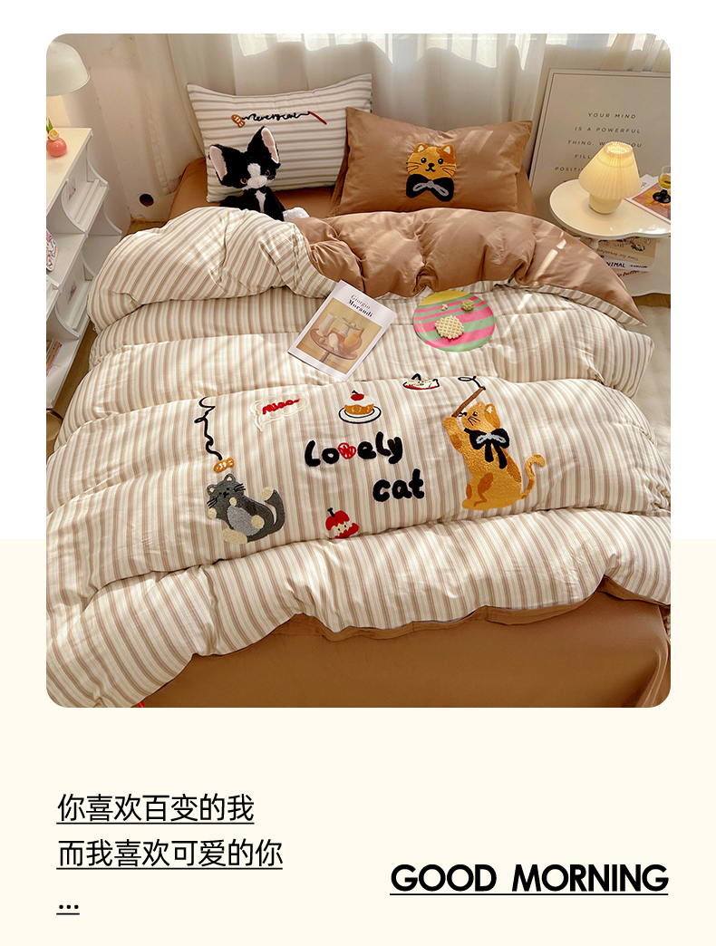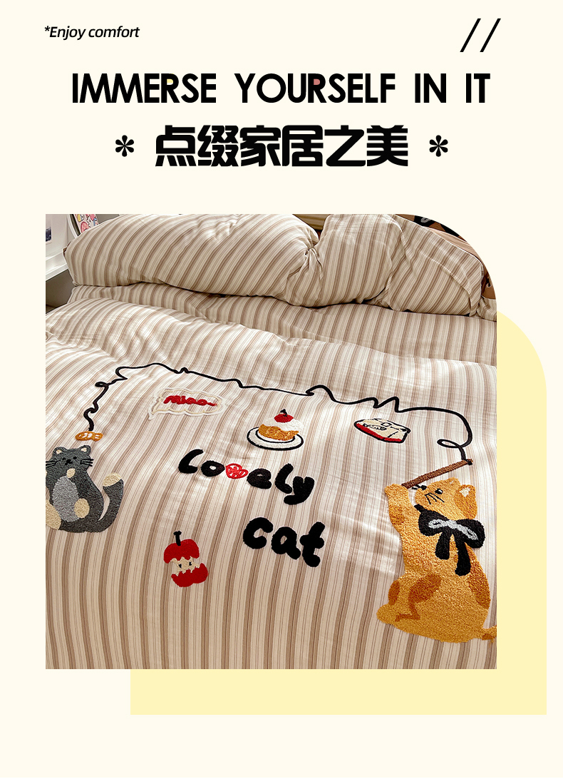 炫拼家纺 2026新款全棉A类双层纱卡通毛巾绣四件套-泡芙系列 泡芙-小猫