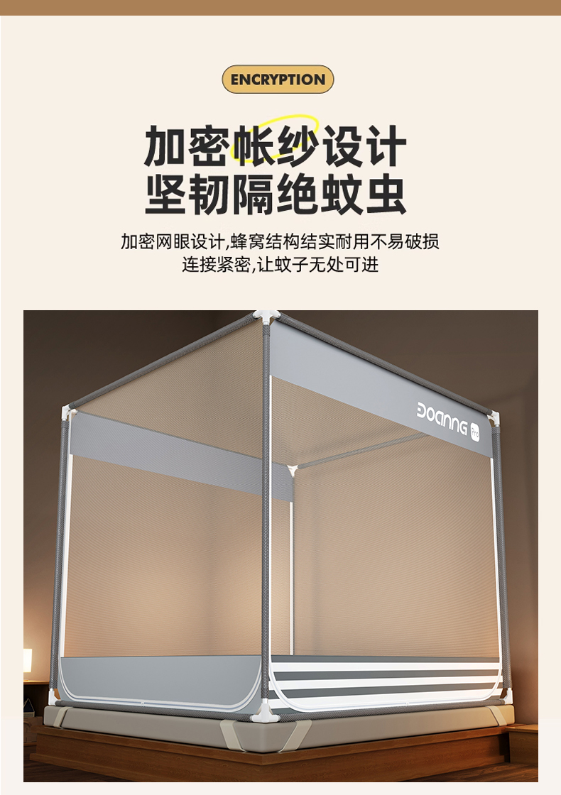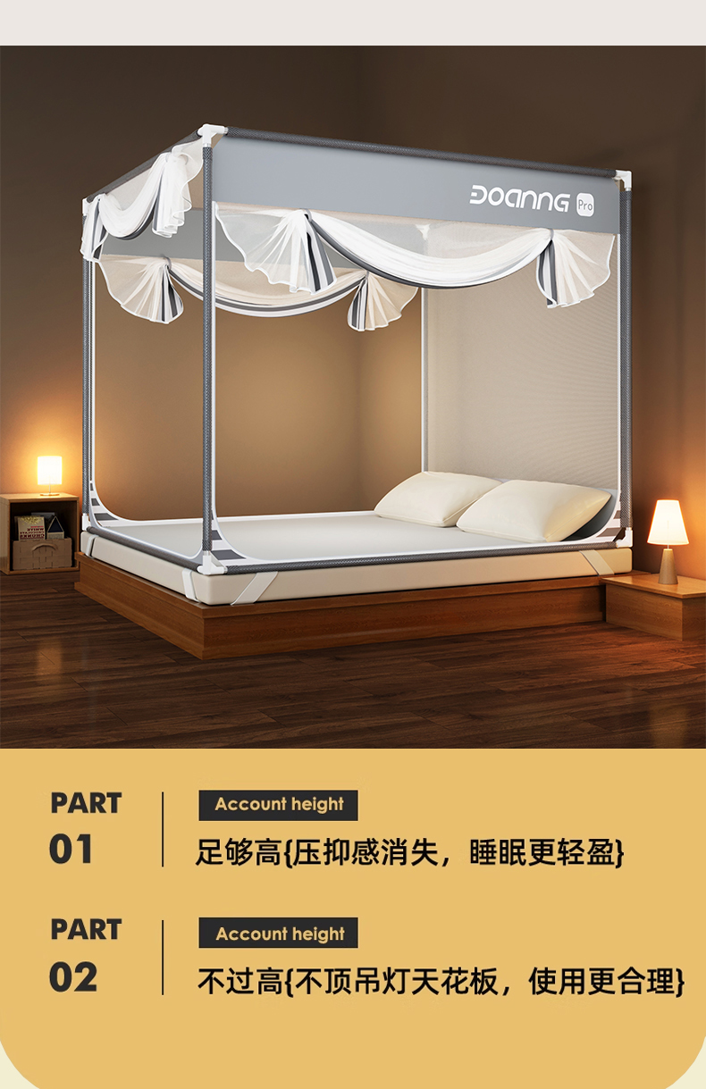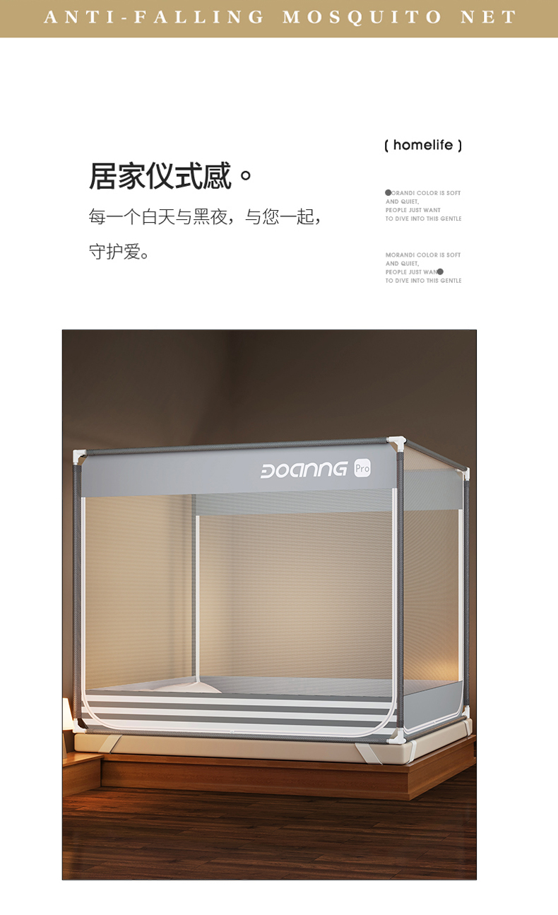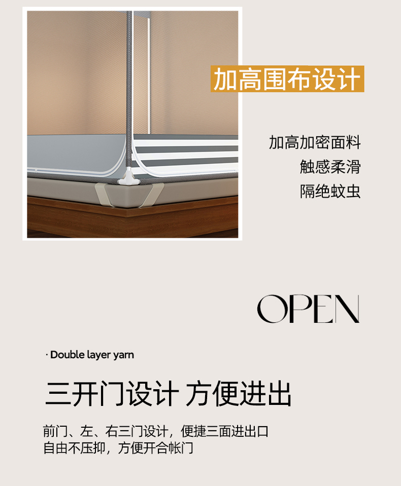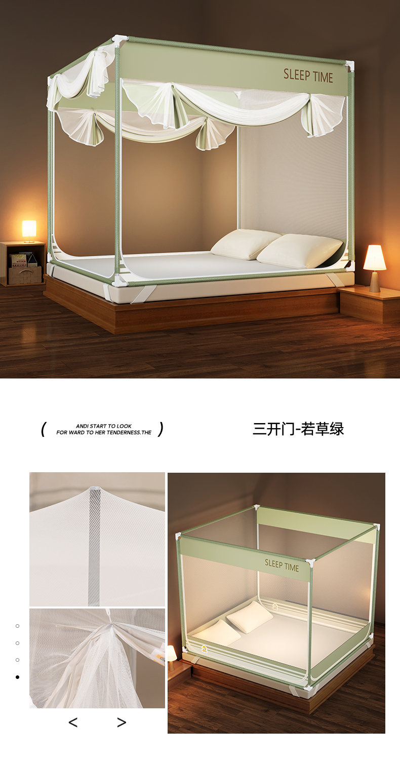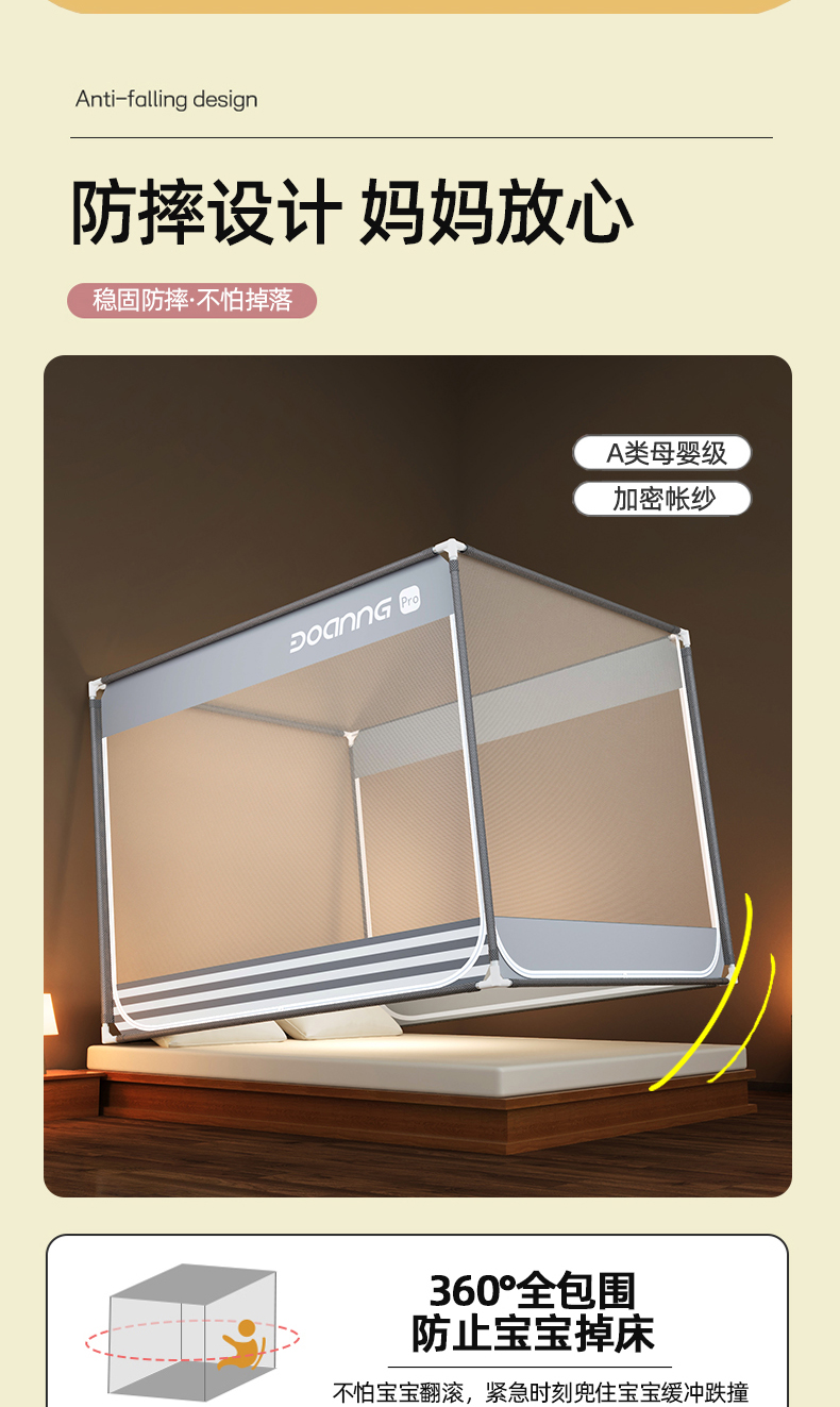 商品名称:青竹苑 2026新款三门全底外穿坐床式蚊帐儿童防摔防蚊拉链方帐 夜光灰