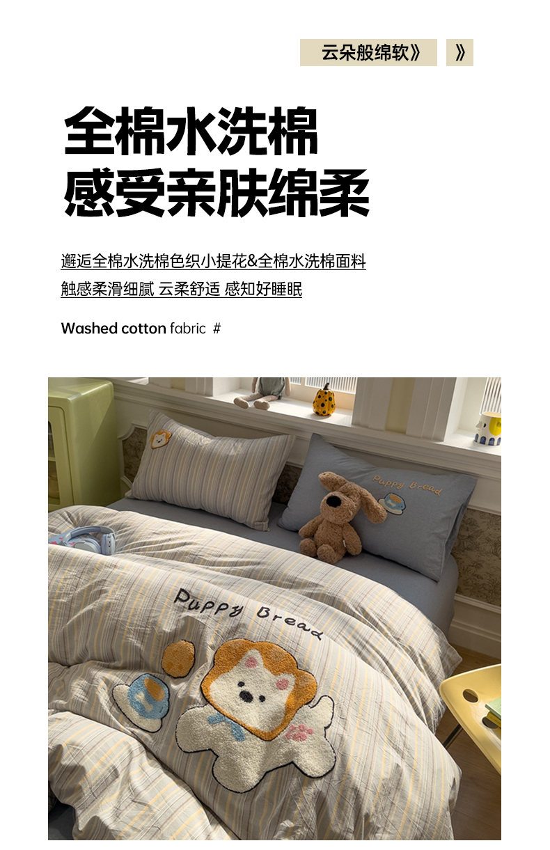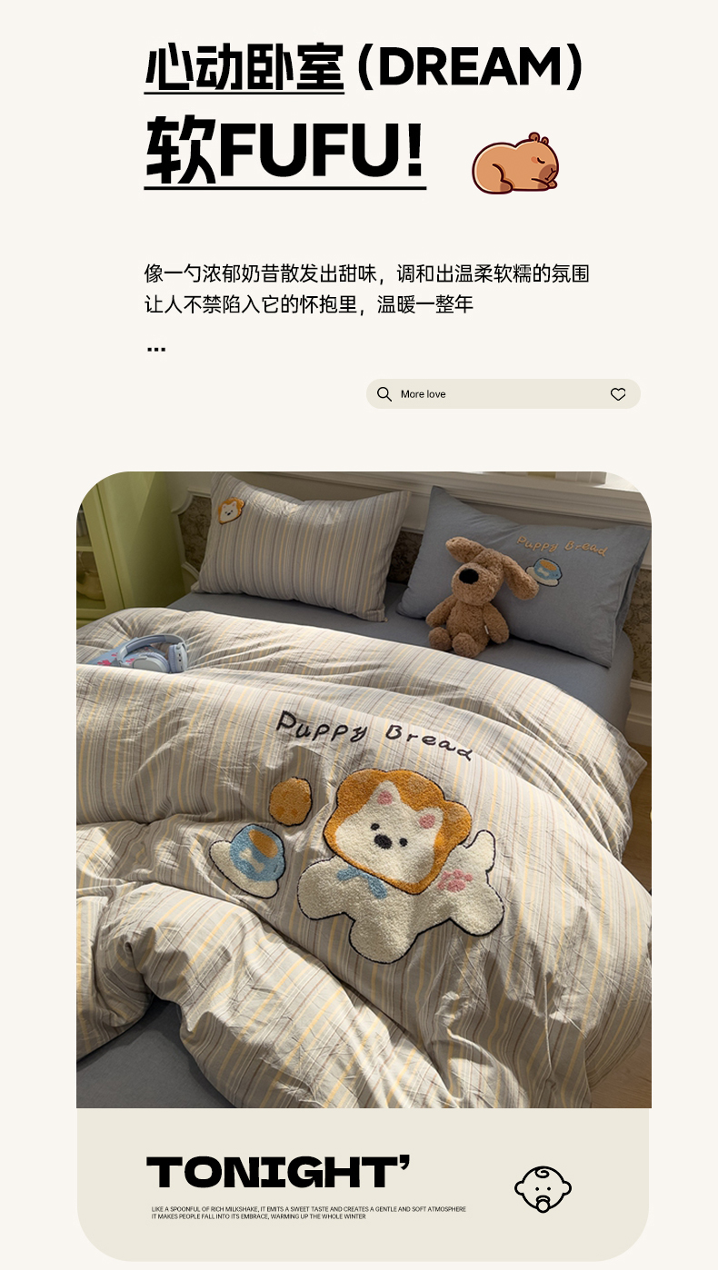 当前位置: 91家纺网 > 商品网购 > 床品套件 > 四件套 > 全棉普通四件套 > 麦田家纺 2026加密A类色织全棉纯棉水洗棉毛巾绣四件套 面包小狗