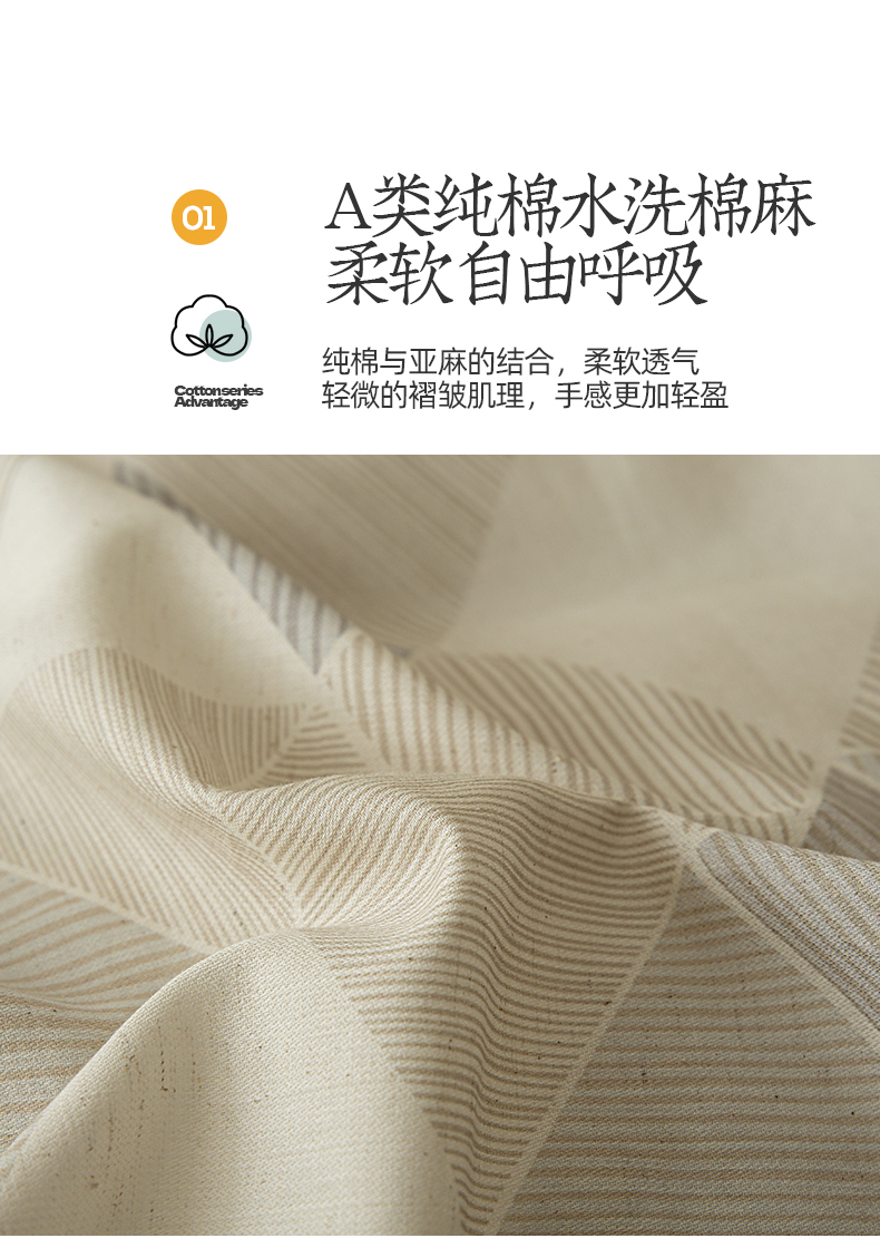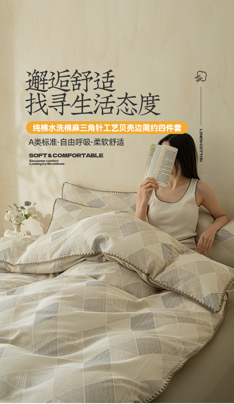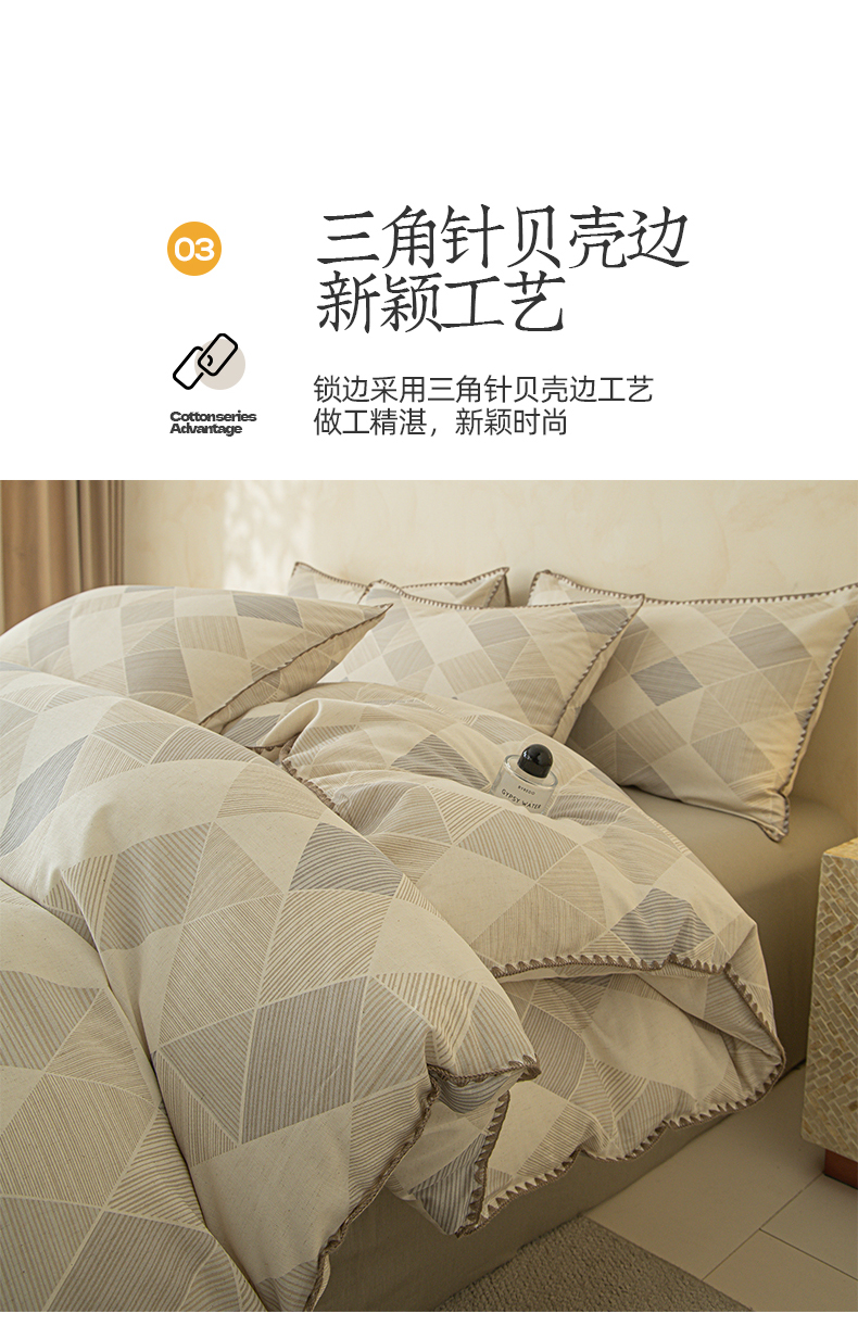 商品名称:桃子家居 2026新款A类纯棉棉麻三角针工艺贝壳边简约水洗棉麻四件套系列 棉麻-三角针菱序