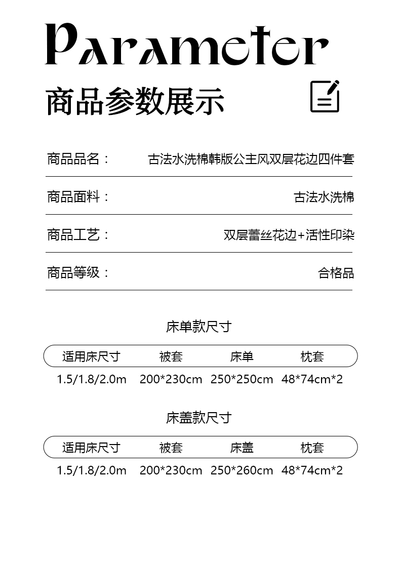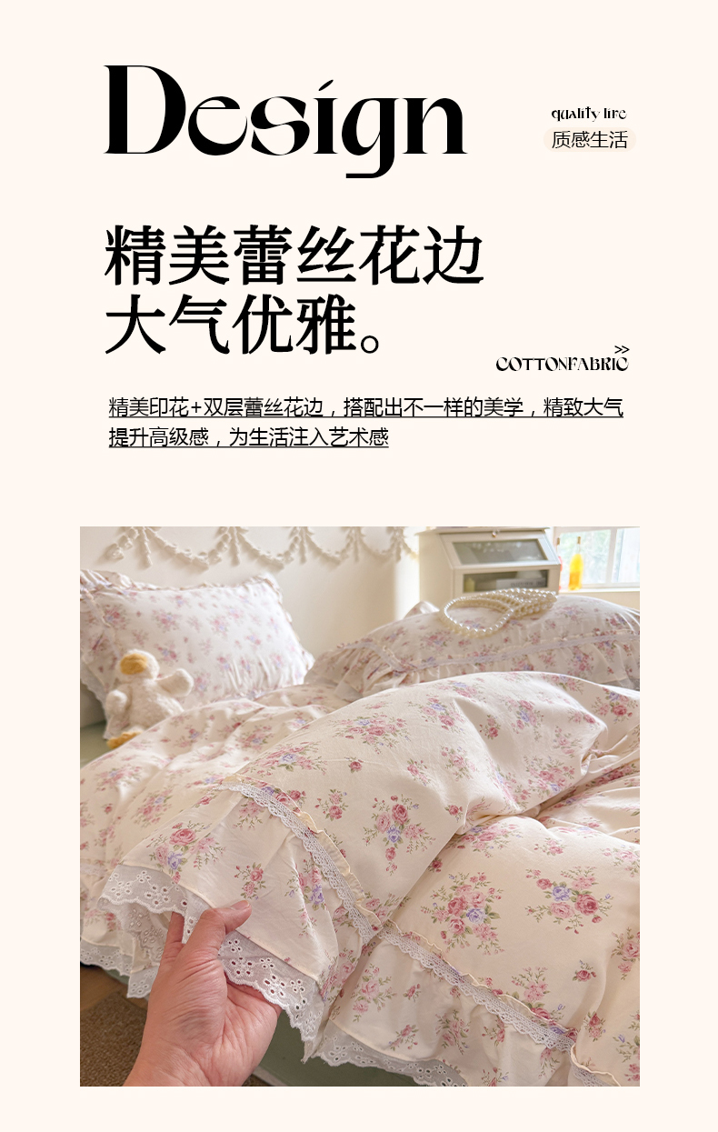 商品名称:吾欢心 2026新款古法水洗棉韩版公主风双层花边四件套 花韵