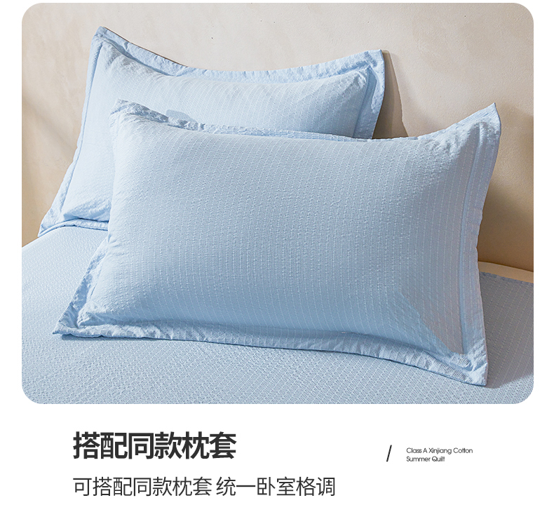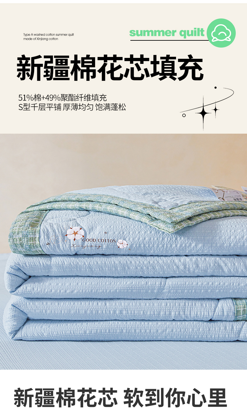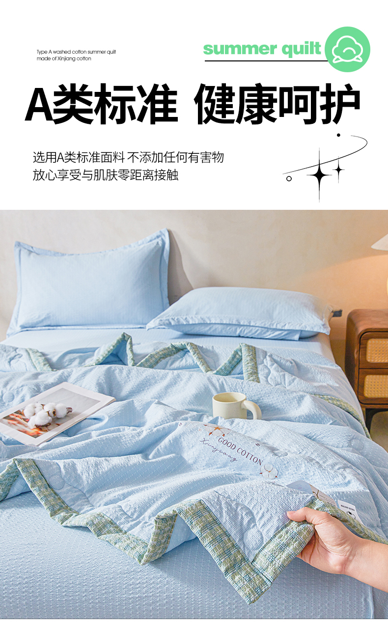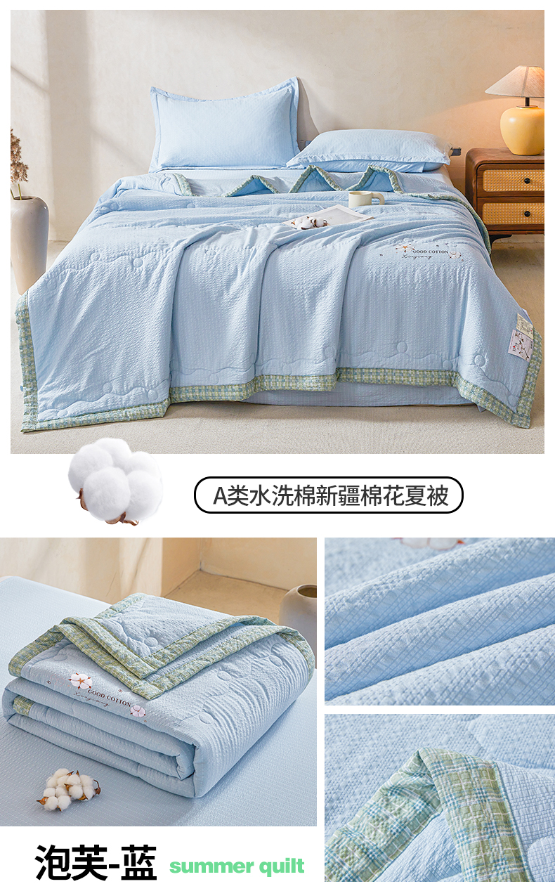 商品名称:西域种棉人 2026新款A类新疆棉花夏凉被加宽包边水洗棉泡泡纱吸湿透气棉花夏被空调被纯色烫画 泡芙-蓝