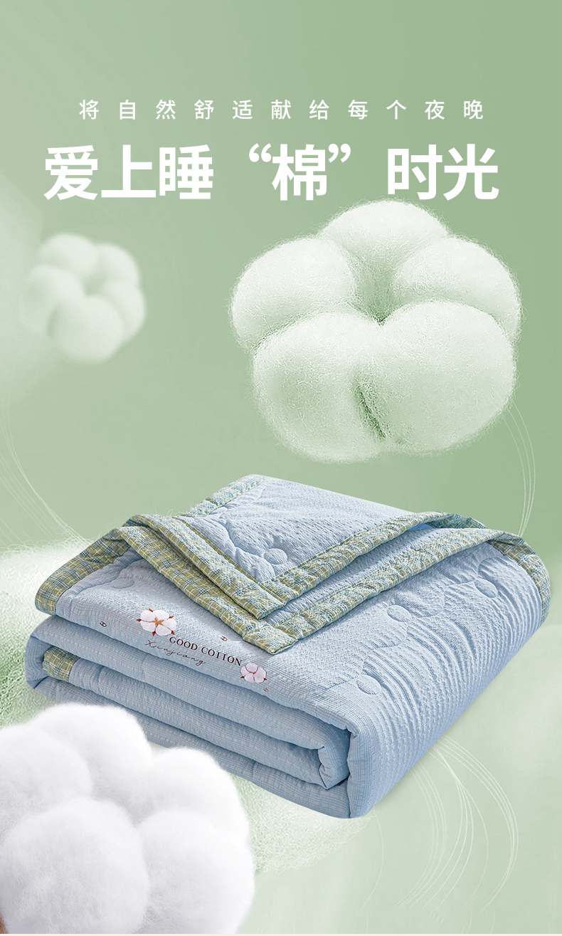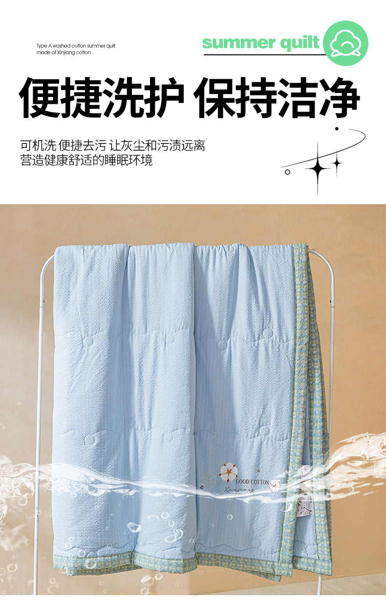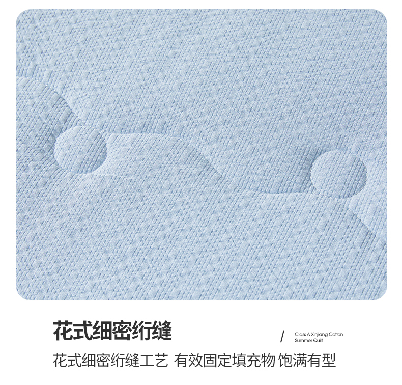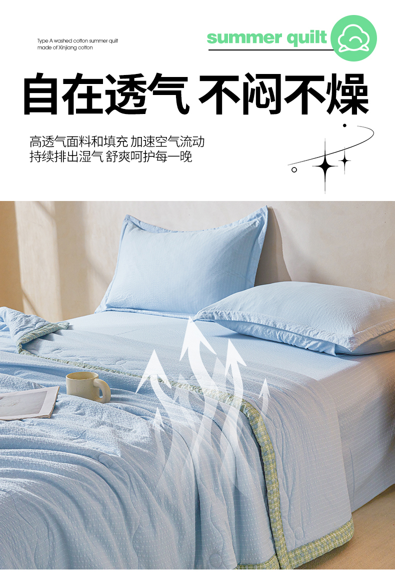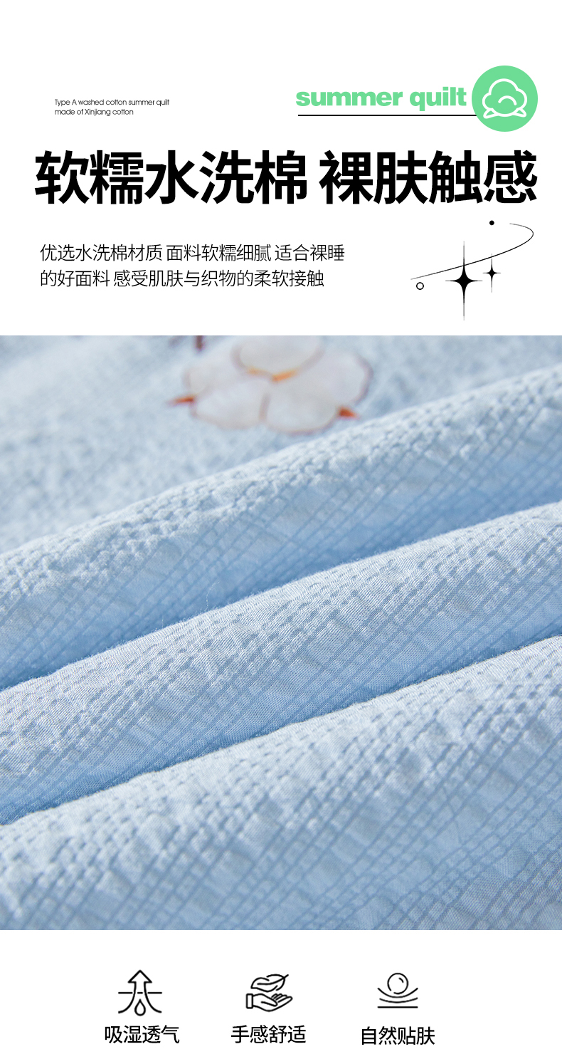 商品名称:西域种棉人 2026新款A类新疆棉花夏凉被加宽包边水洗棉泡泡纱吸湿透气棉花夏被空调被纯色烫画 泡芙-蓝