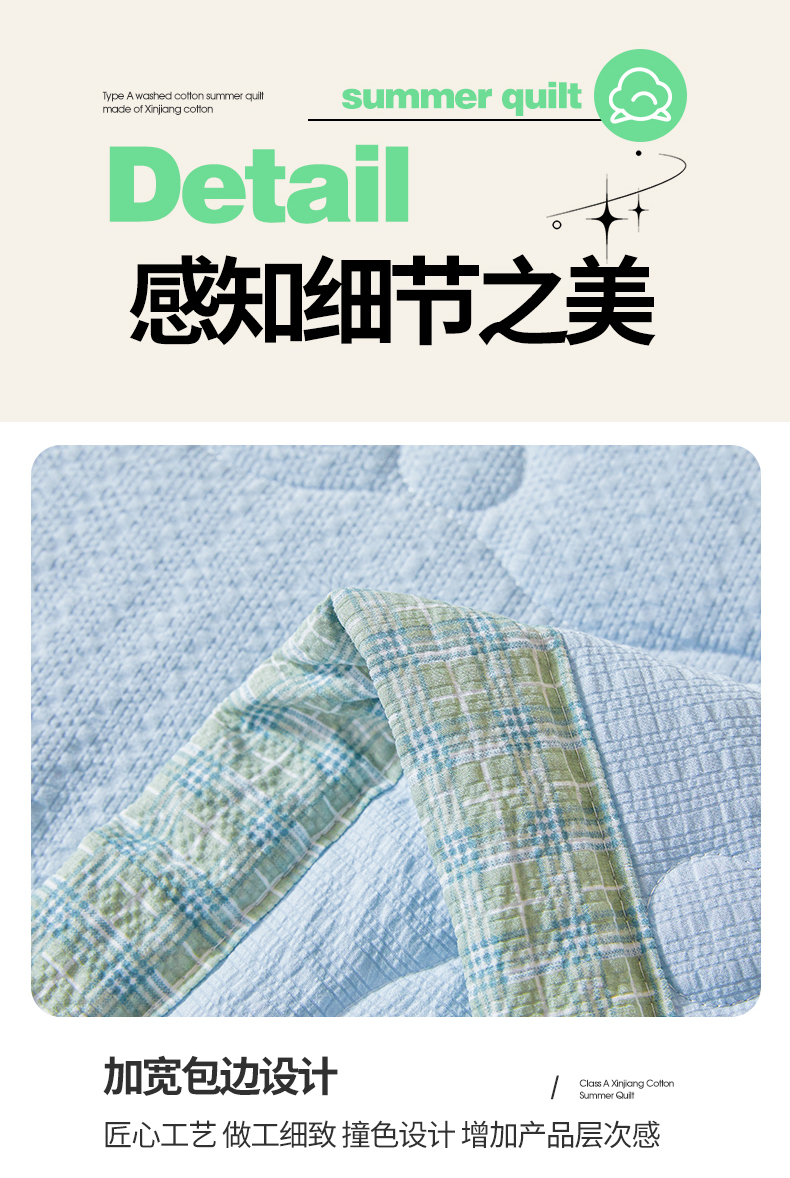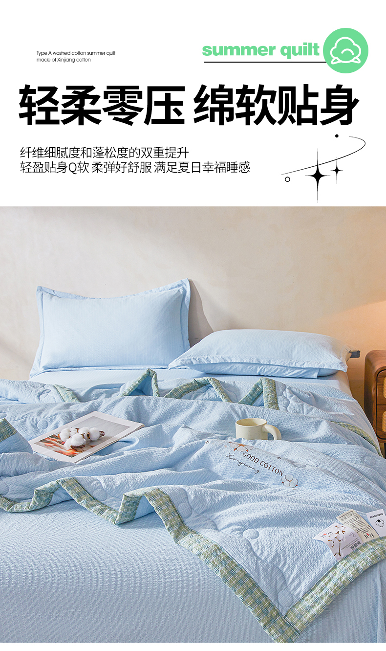 被子 > 夏被 > 西域种棉人 2026新款A类新疆棉花夏凉被加宽包边水洗棉泡泡纱吸湿透气棉花夏被空调被纯色烫画 泡芙-蓝