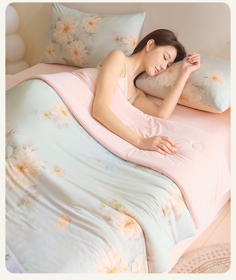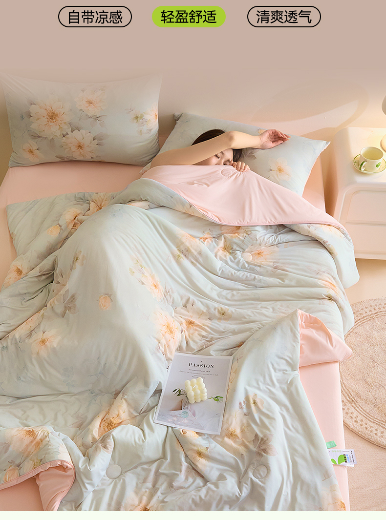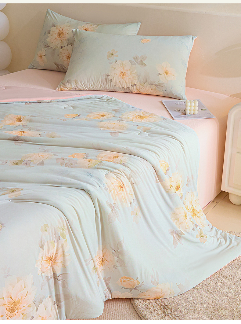 (总)恬思语家纺 2026春夏新品莱赛尔天丝印花蚕丝夏被夏凉被空调被,绮梦-玉,幸福里-绿