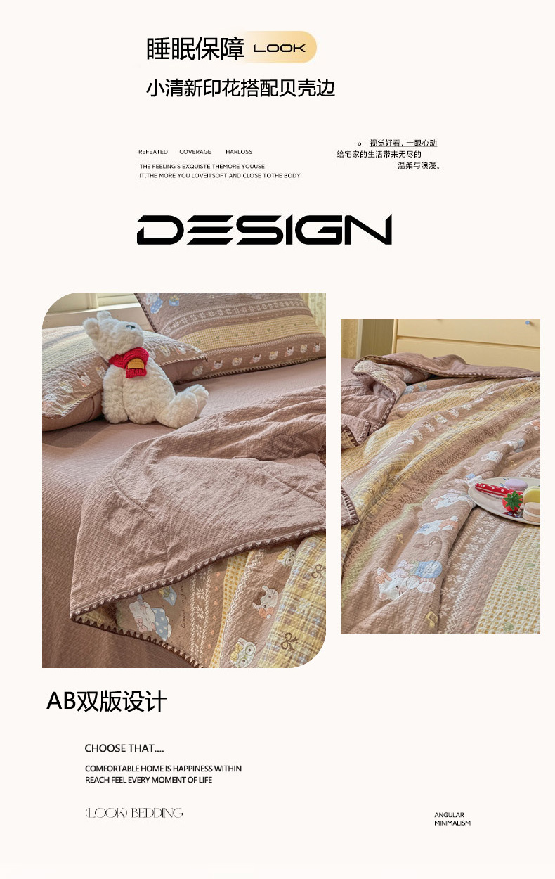 慕澄家纺 2026新款泡芙棉贝壳边印花夏被四件套 夏被-椰棕猫软糖