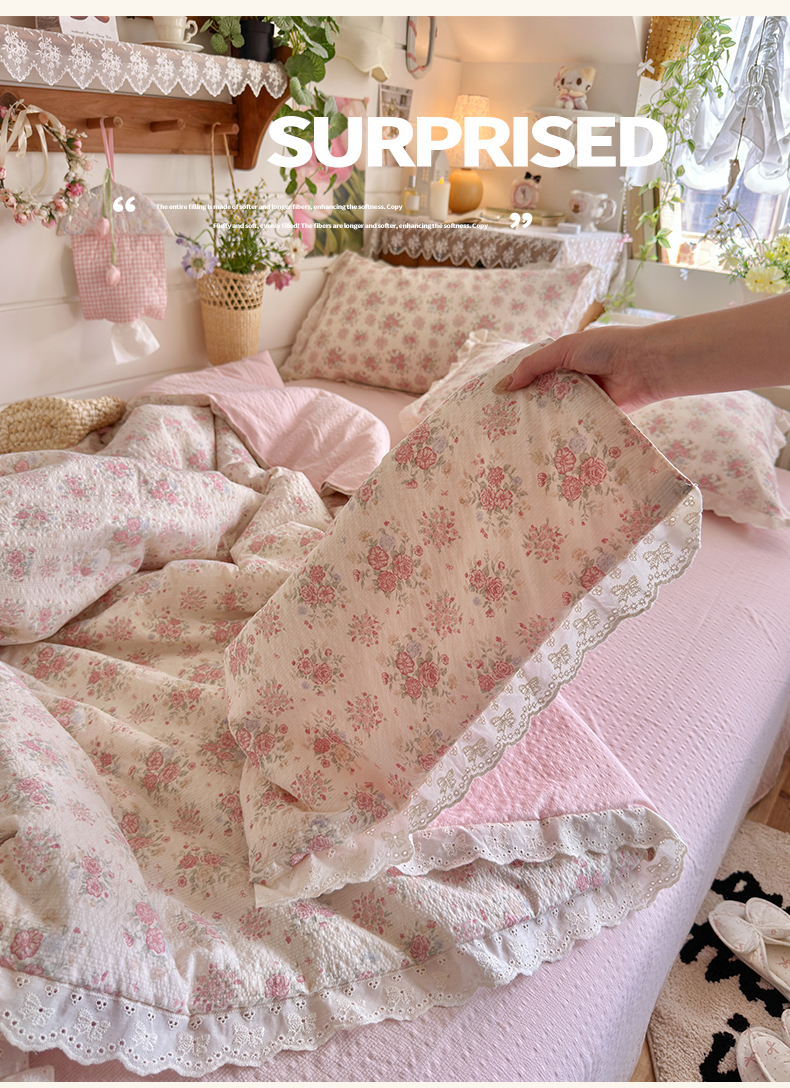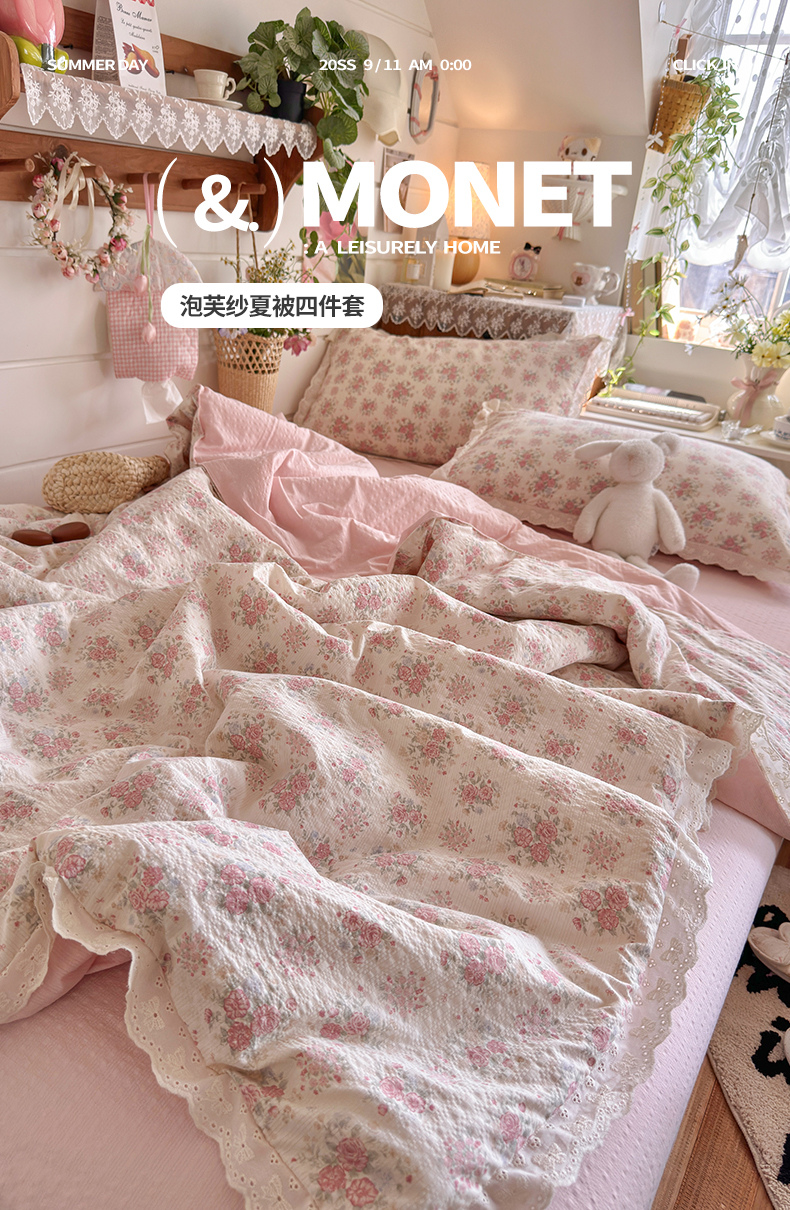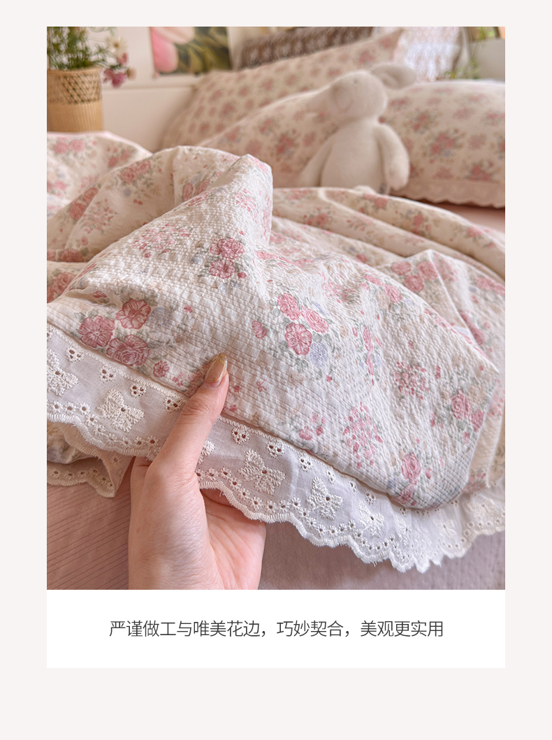 商品名称:初念 2026新款泡芙纱全花边夏被四件套 花笺-日光漫游