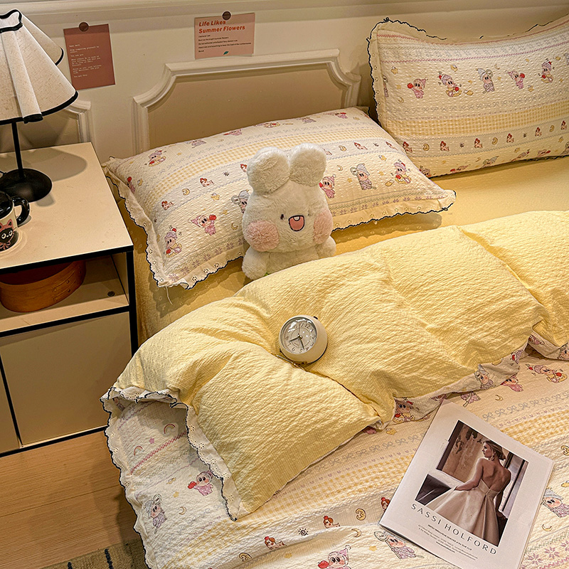 (总)一比一家纺 2026新款泡芙纱简款夏被四件套,安妮,草莓恋语,春日小兔,花藤小兔,咖啡狗,浪漫彩蝶,玫瑰之恋,素锦,小黄鸭,心愿,星梦乐园,星星狗,熊博士,摇摇星人,樱桃波点,云朵泡芙,长耳兔,紫色花语,组合图仅供展示-不可下单