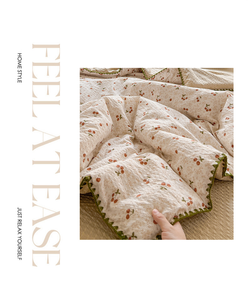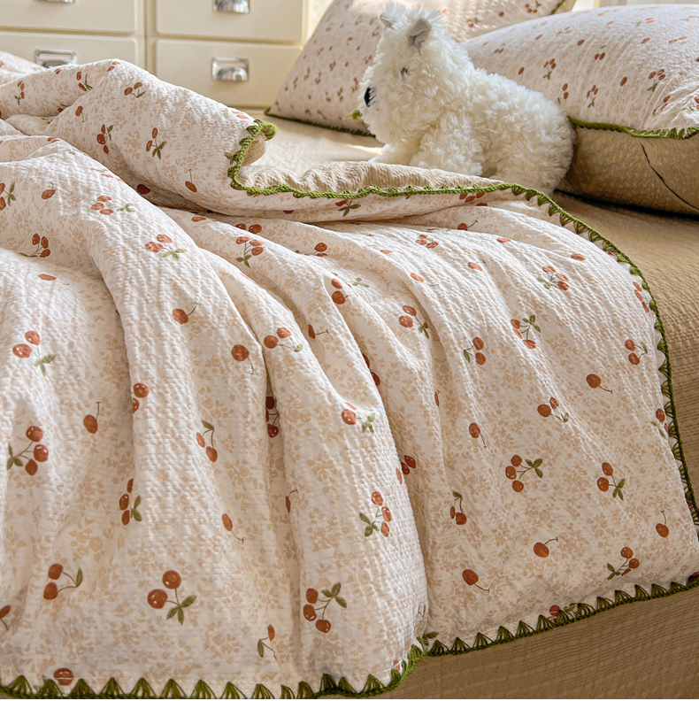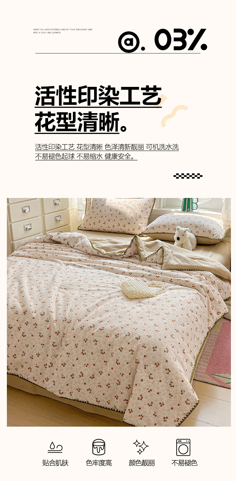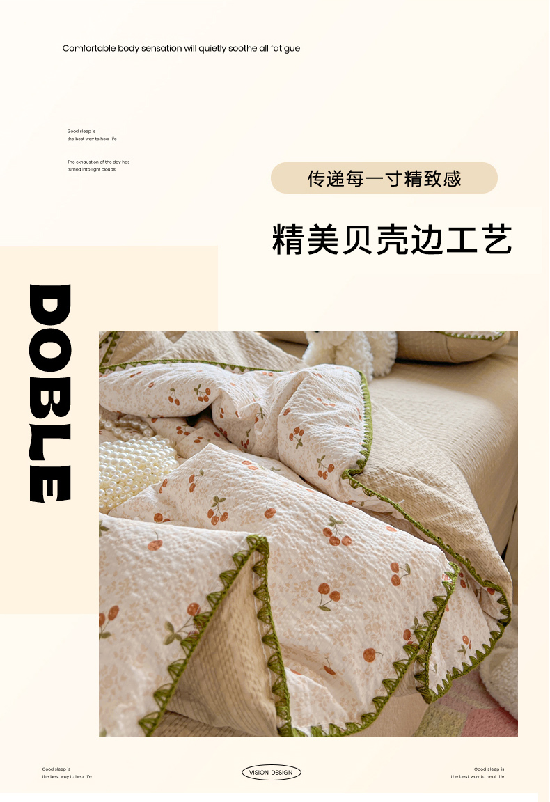 商品名称:恒尚居 2026新款A类泡芙纱贝壳边夏被夏凉被四件套空调被三角针绣边 【满地樱桃】贝壳边