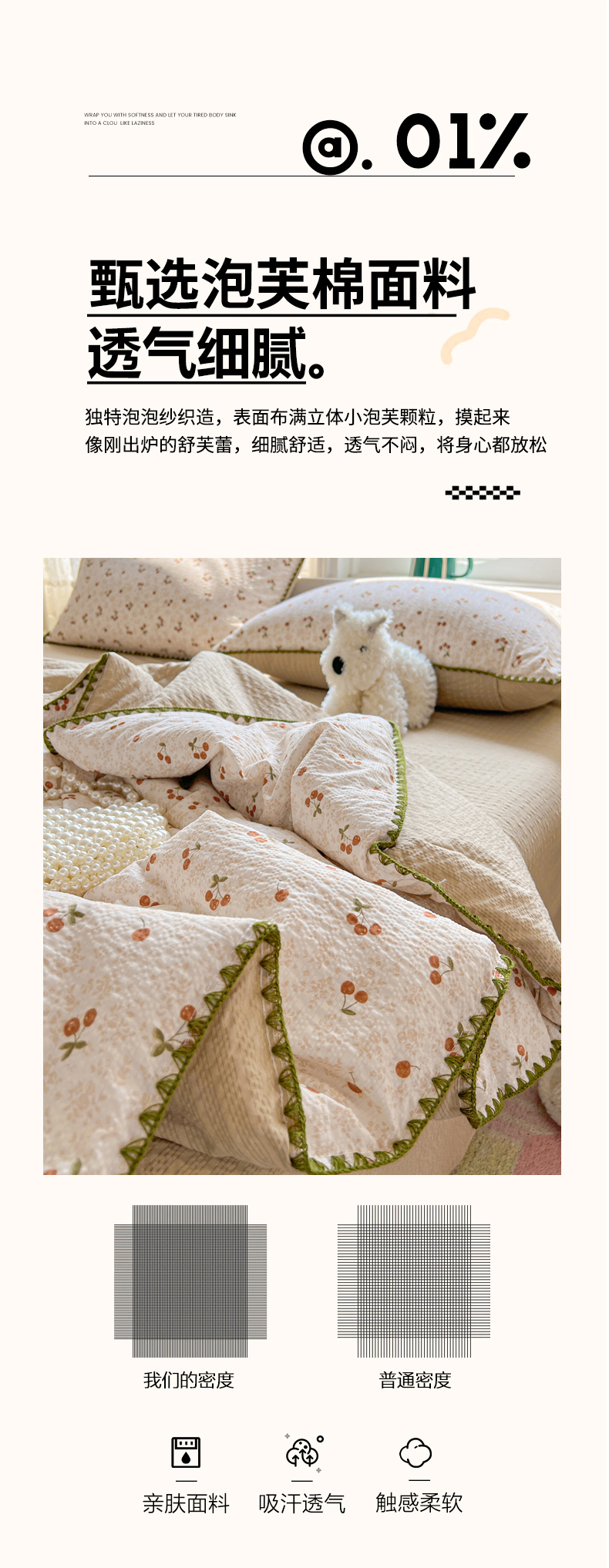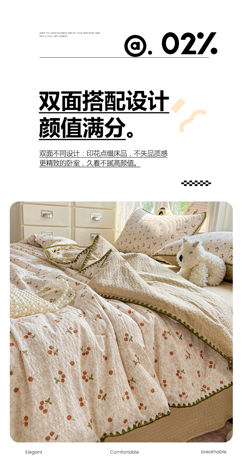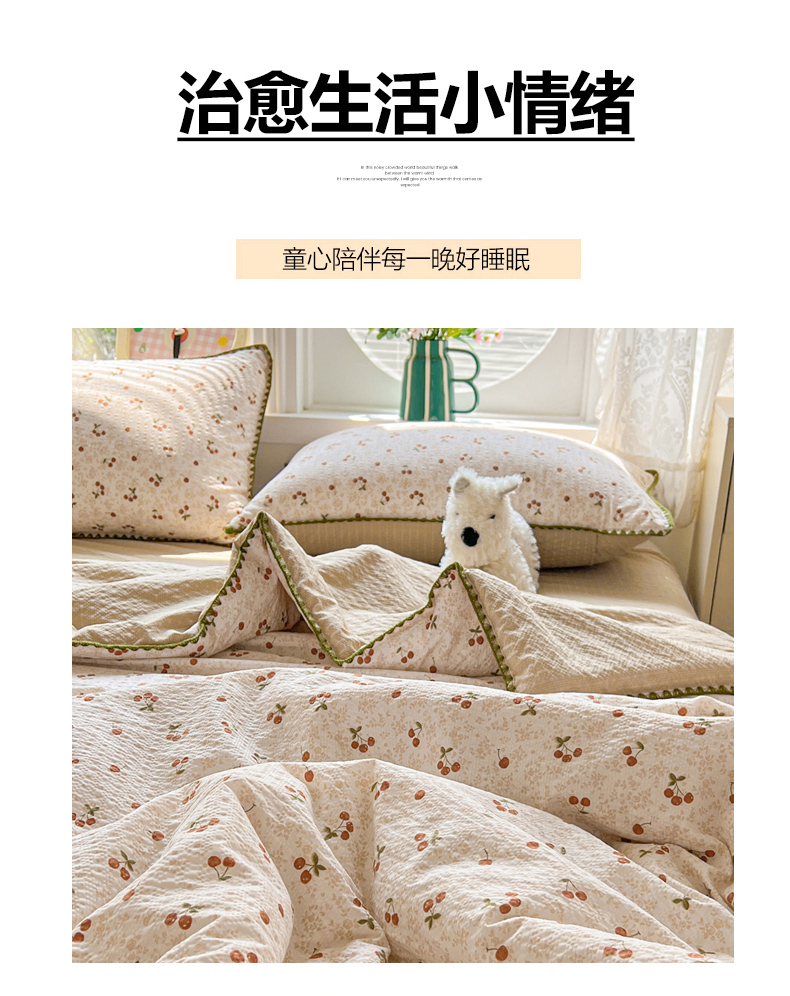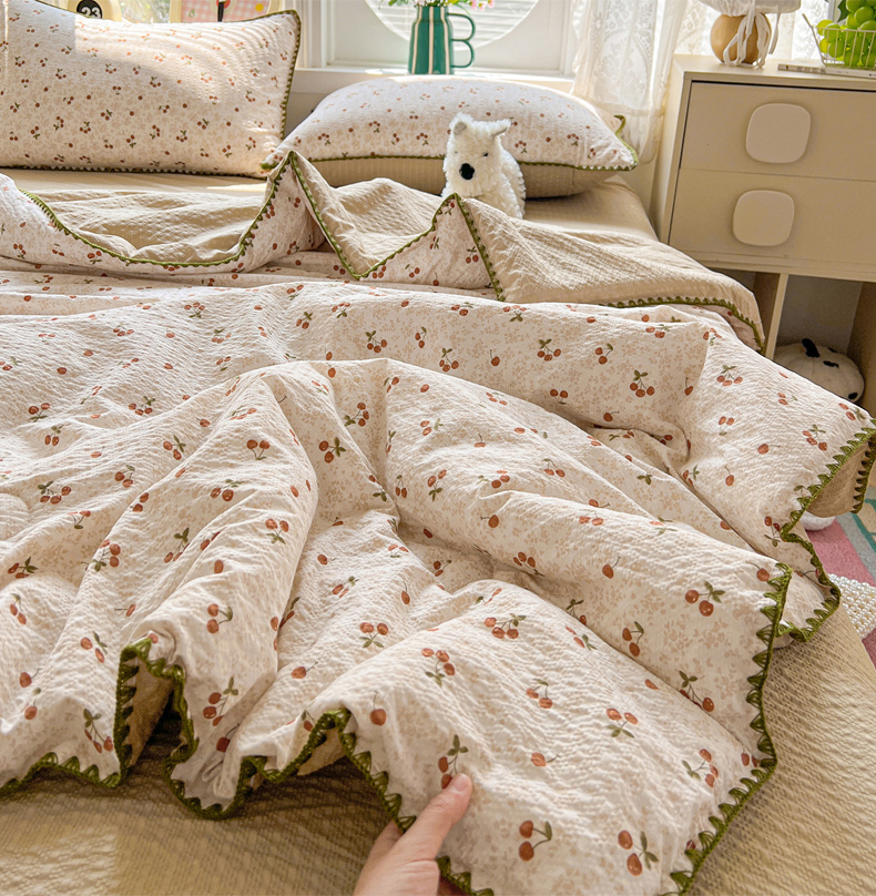 商品名称:恒尚居 2026新款A类泡芙纱贝壳边夏被夏凉被四件套空调被三角针绣边 【满地樱桃】贝壳边