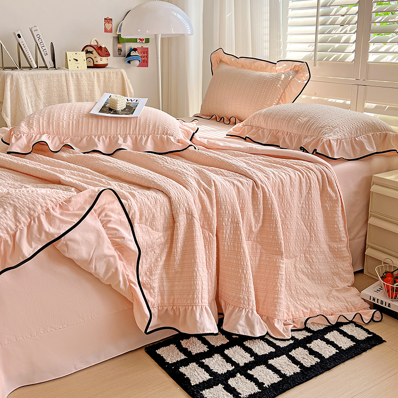 仟网汇 2026新款赫本纯色泡泡纱花边款夏被夏凉被空调被四件套 樱花粉