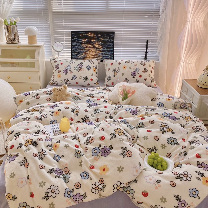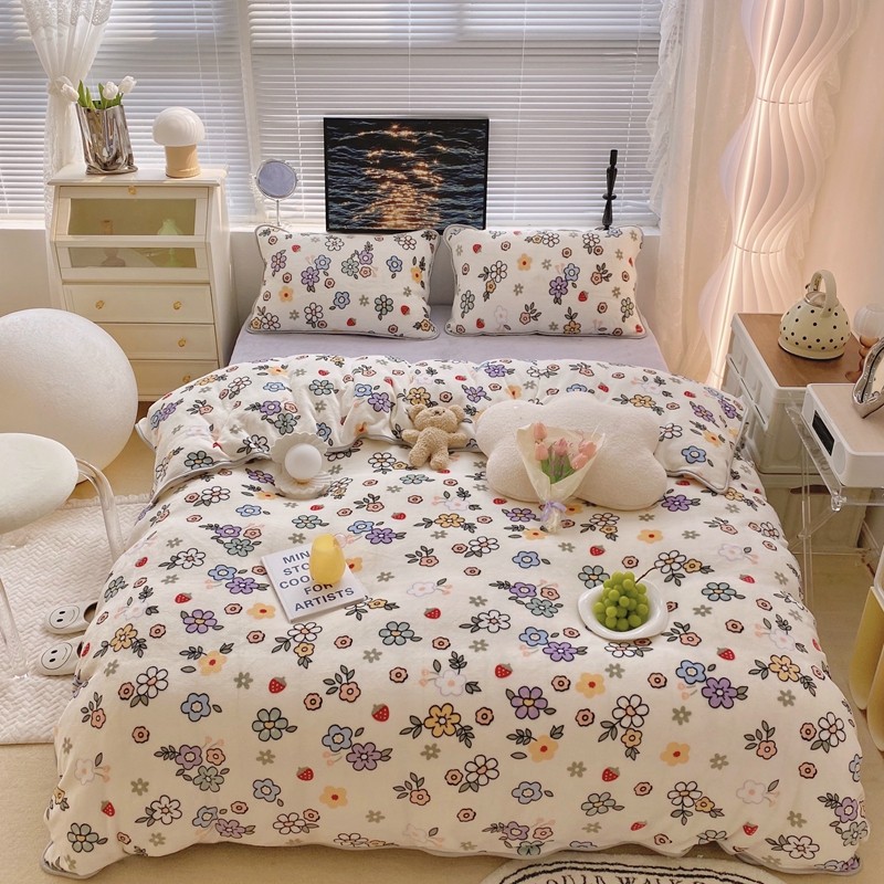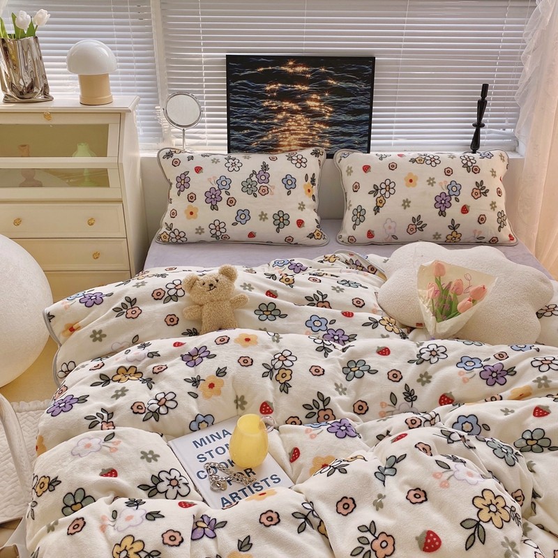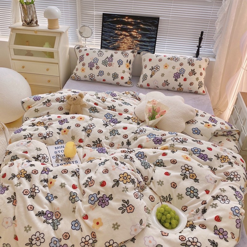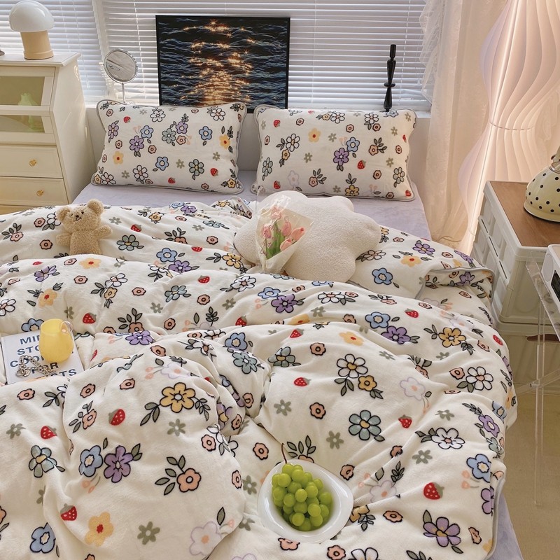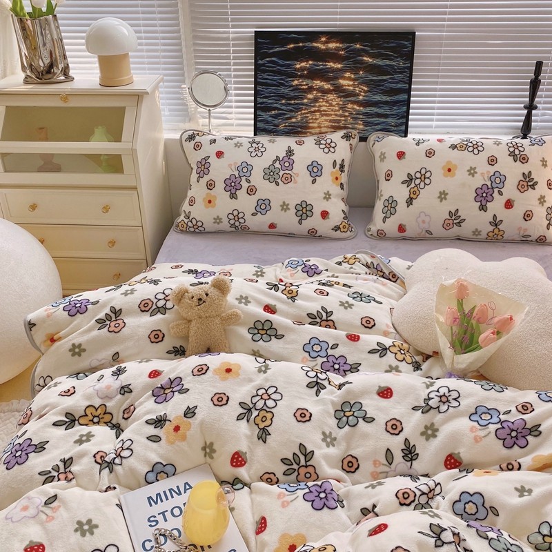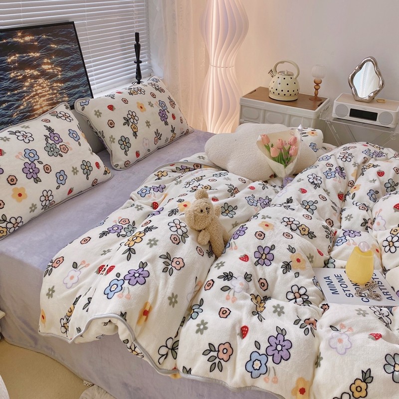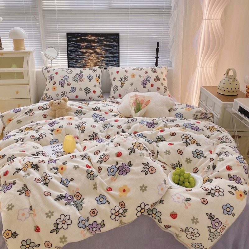 顾里家纺2021新款ins韩国高端保暖牛奶绒四件套碎花草莓