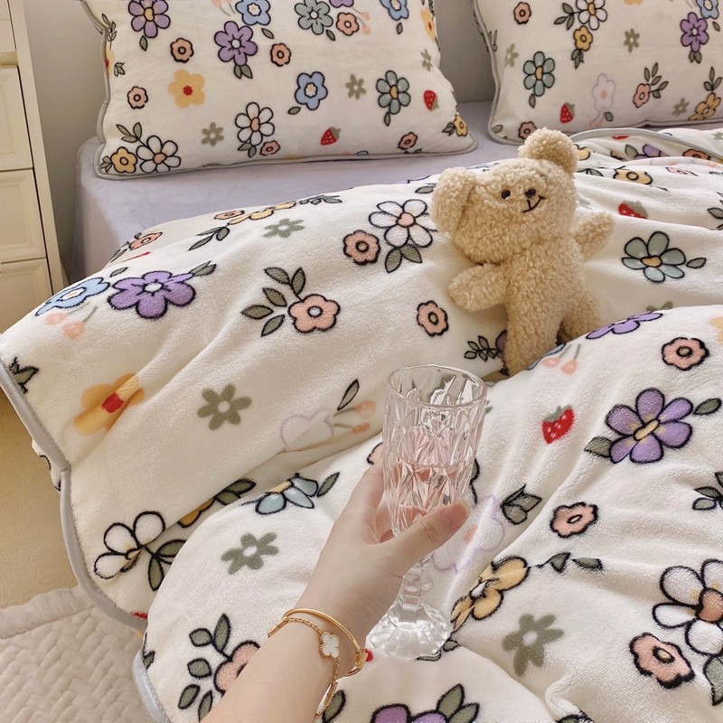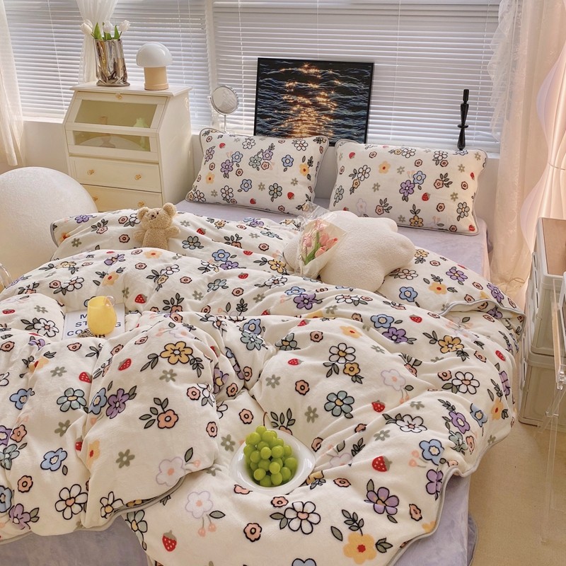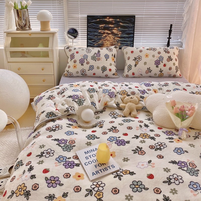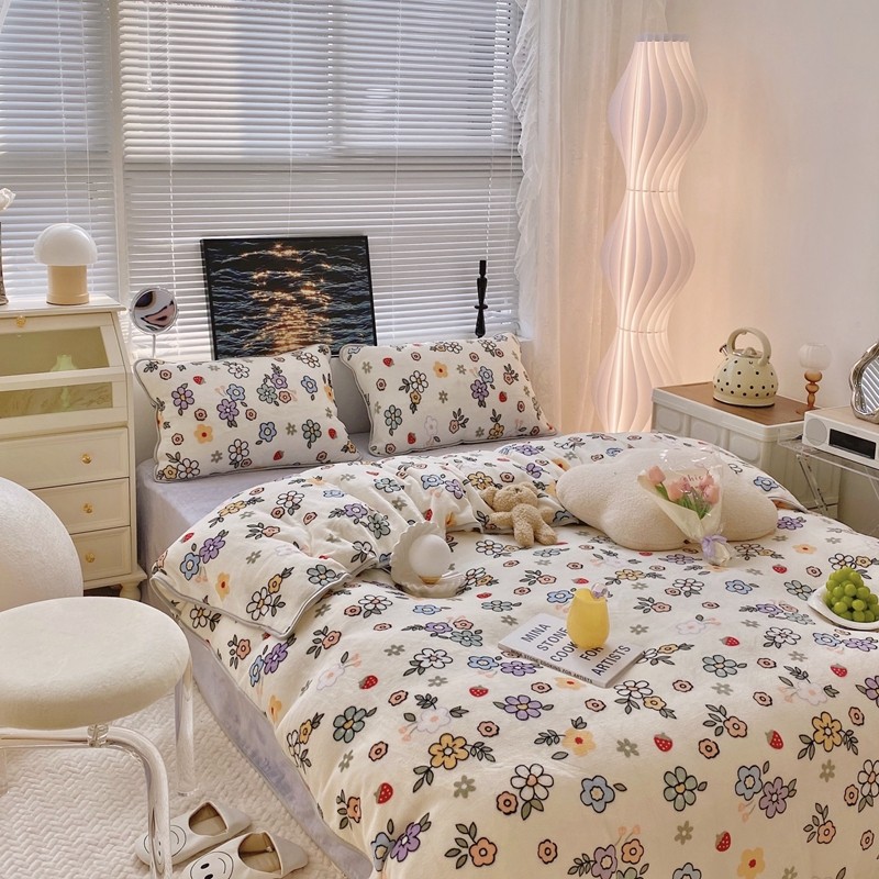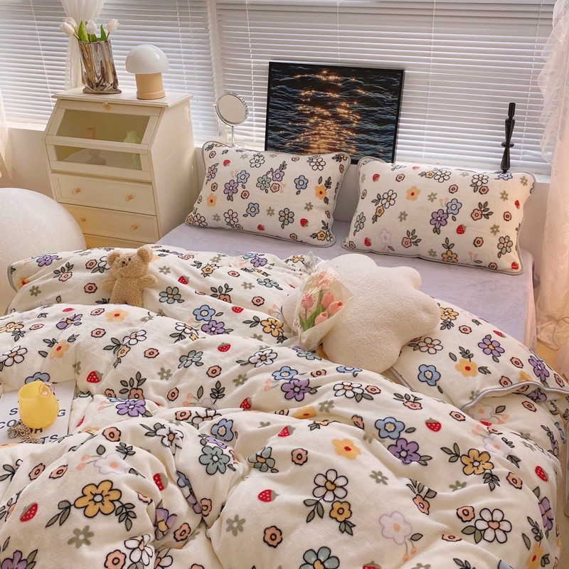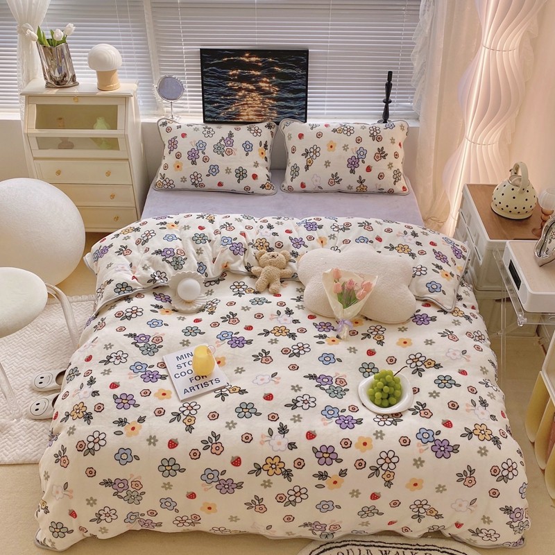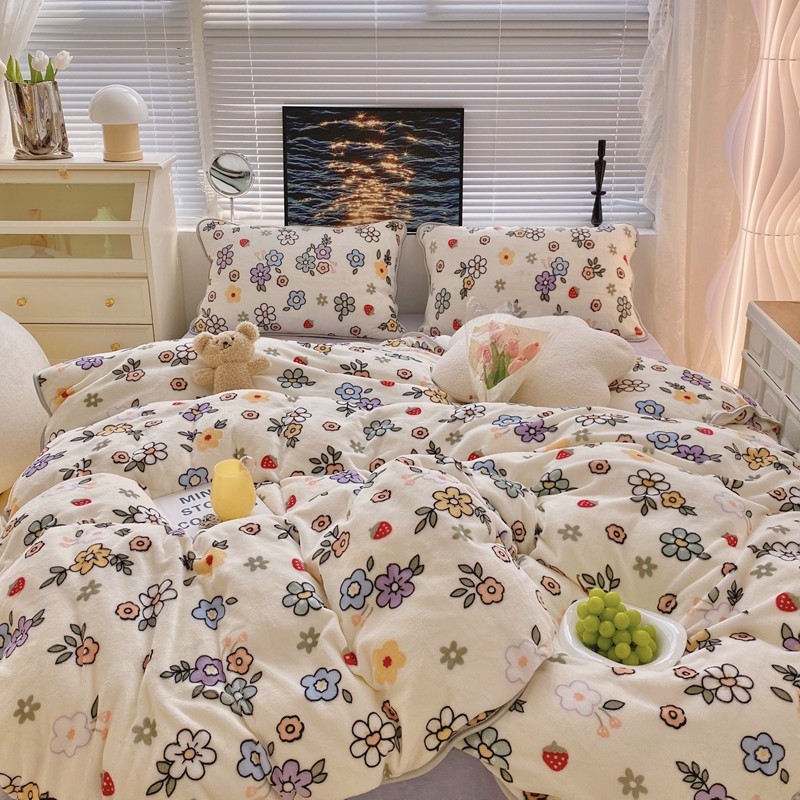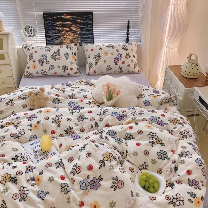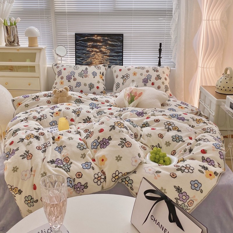 顾里家纺2021新款ins韩国高端保暖牛奶绒四件套碎花草莓