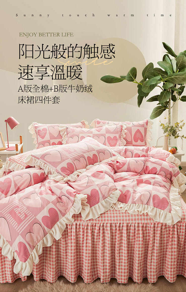 (总)宜凡家纺 2025新款兔绒提花牛奶绒夹棉床裙四件套,爱心 少女粉,爱心 粉紫,爱心 驼色,蝶舞 大红,蝶舞 米色,蝶舞 浅紫,蝶舞 玉色,简爱 苍青,简爱 豆沙紫,简爱 玉色,樱桃 苍青,樱桃 豆沙紫,樱桃 奶油白