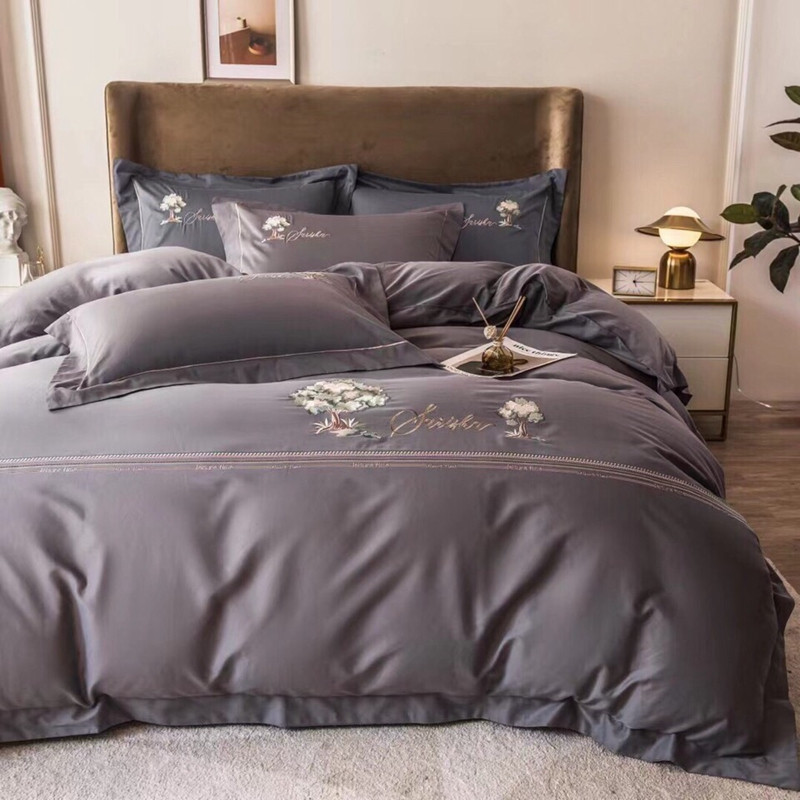 总玖玖爱家纺 纯棉100支贡缎长绒棉刺绣被套三件套四件套加大四件套,白色,高级灰,卡其,蓝灰,绿色,浅桔,深蓝,紫豆沙