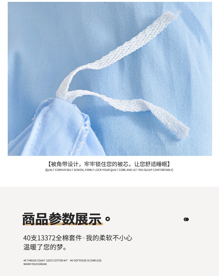当前位置: 91家纺网 > 商品网购 > 床品套件 > 四件套 > 全棉普通四件套 > 极梦新款40支喷气全棉纯色四件套浅蓝