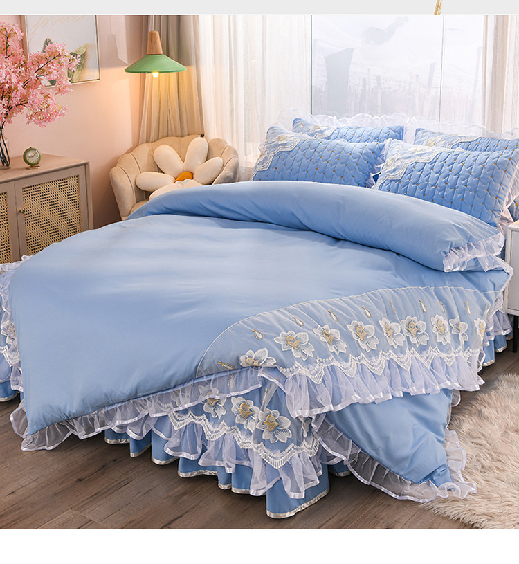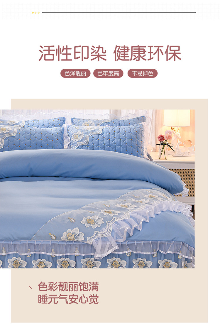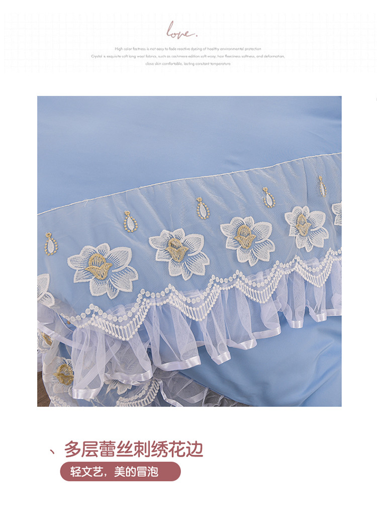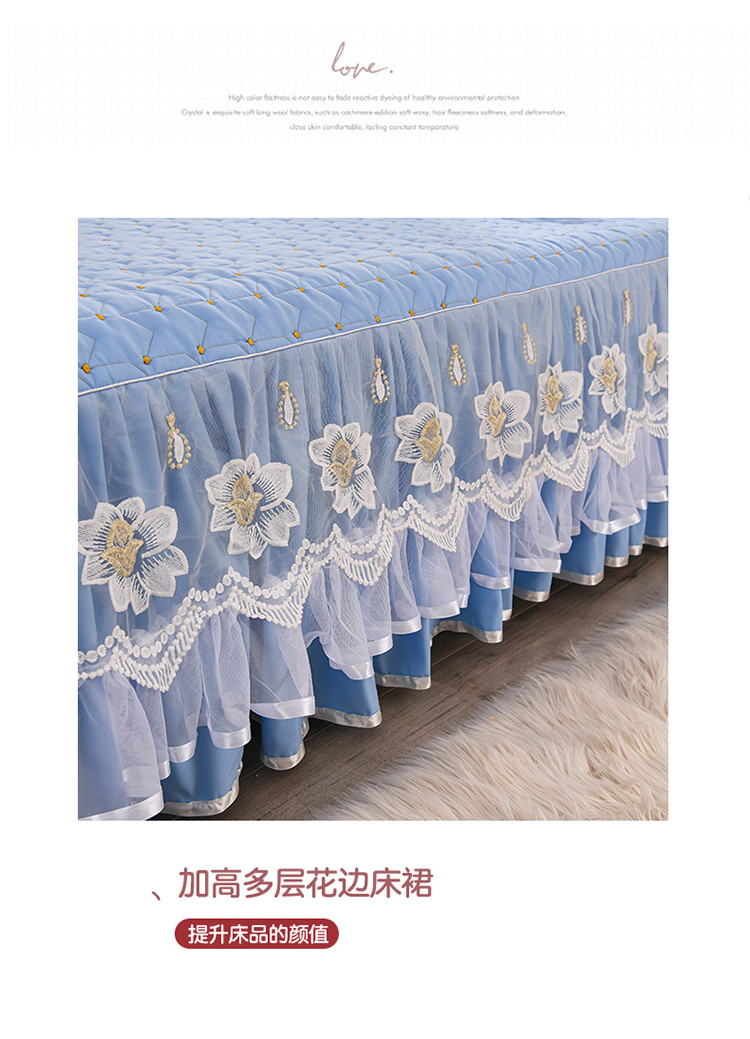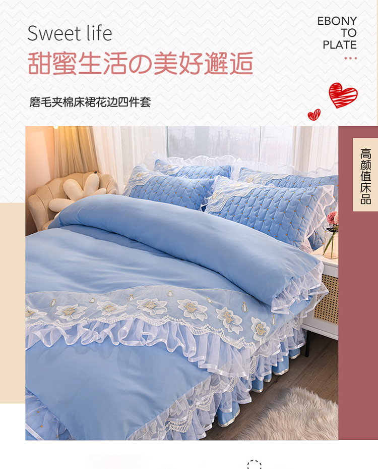 当前位置: 91家纺网 > 商品网购 > 床品套件 > 四件套 > 普通磨毛四件套 > 瑞宝2025新款花海磨毛夹棉床裙款花边四件套系列 花海-天蓝