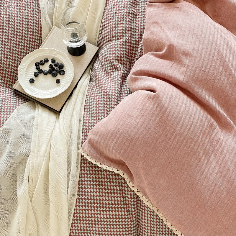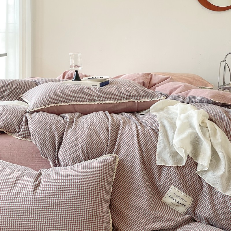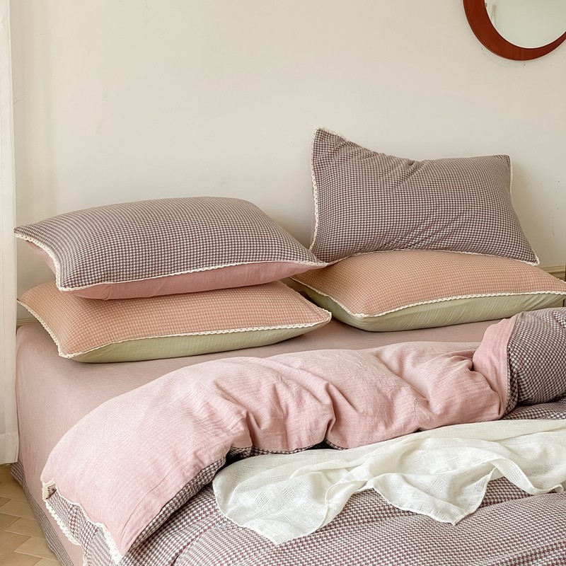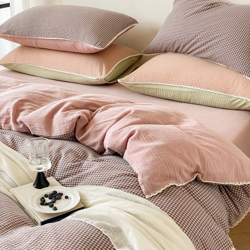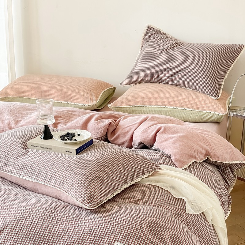 商品名称:圆岛 2022新款色织小提花花边款全棉水洗棉四件套 沙紫拼粉