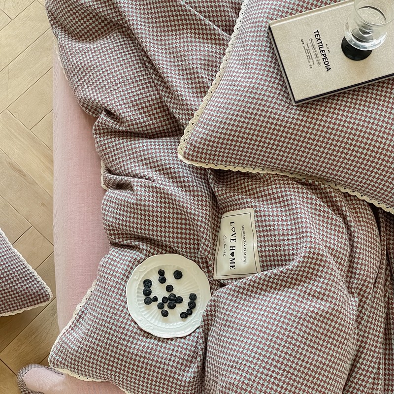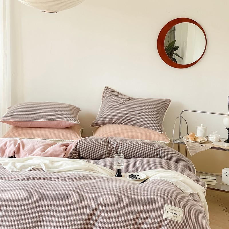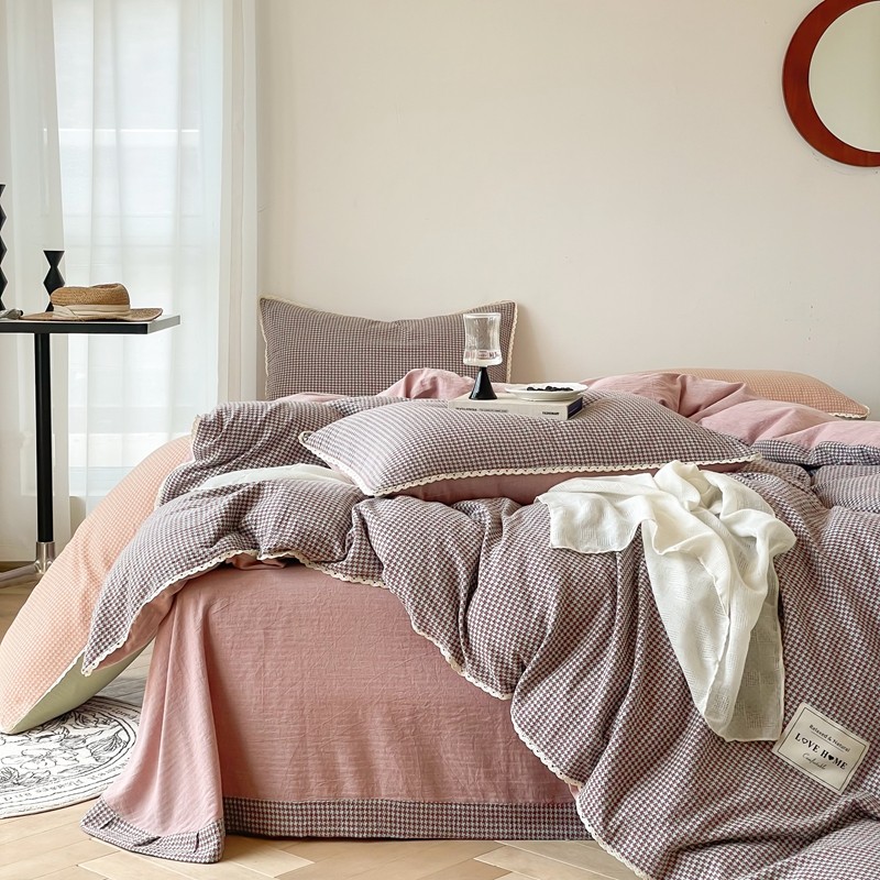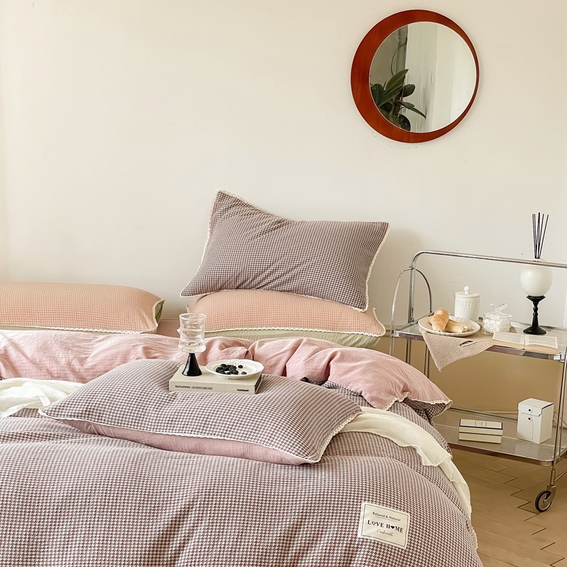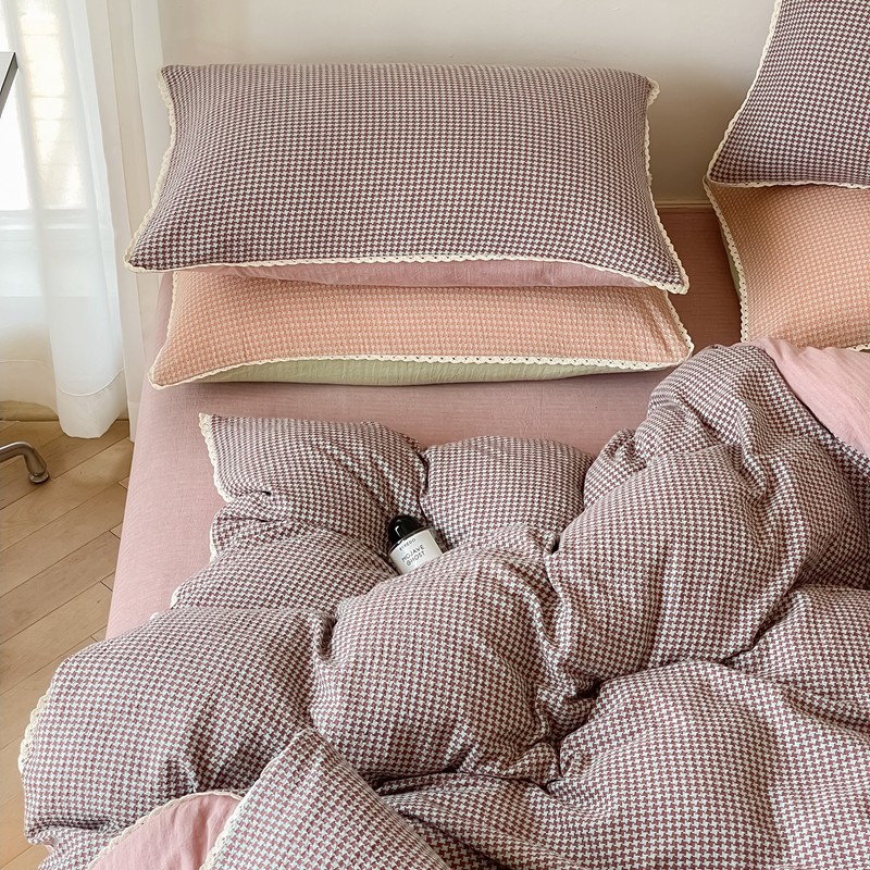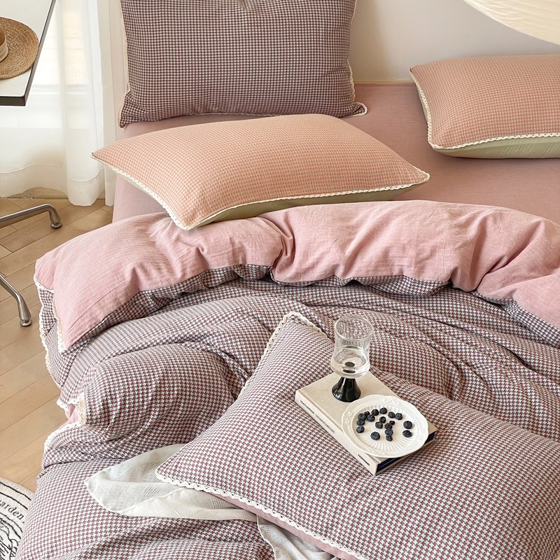 商品名称:圆岛 2022新款色织小提花花边款全棉水洗棉四件套 沙紫拼粉
