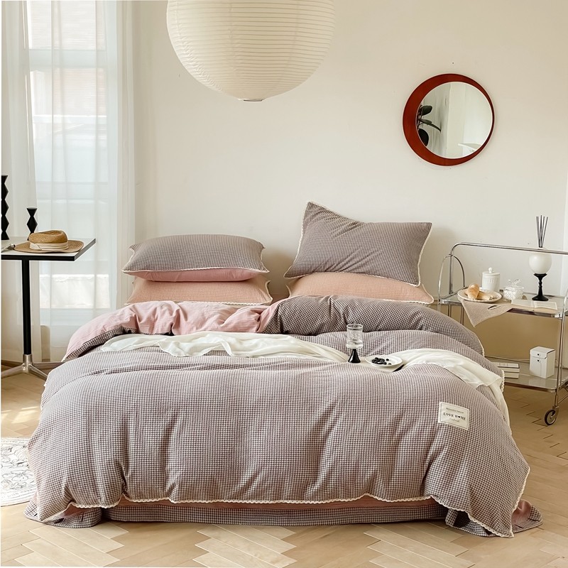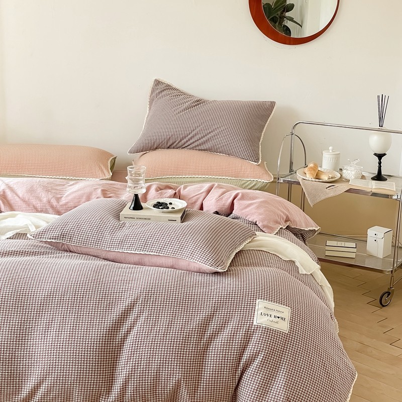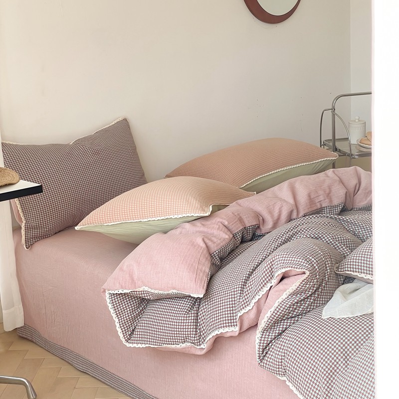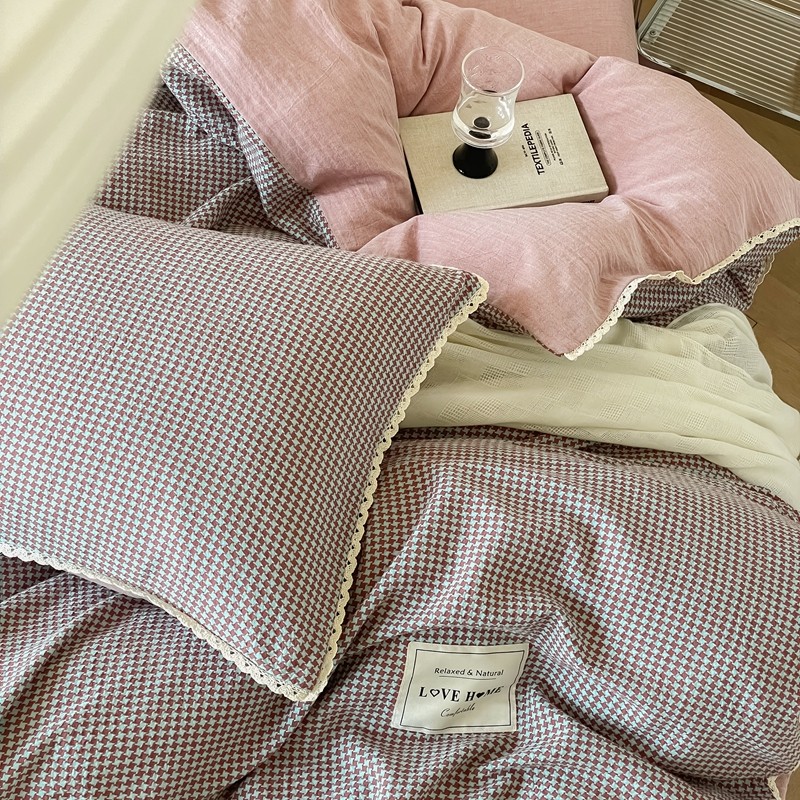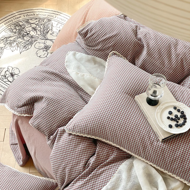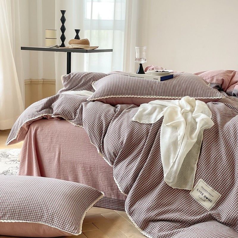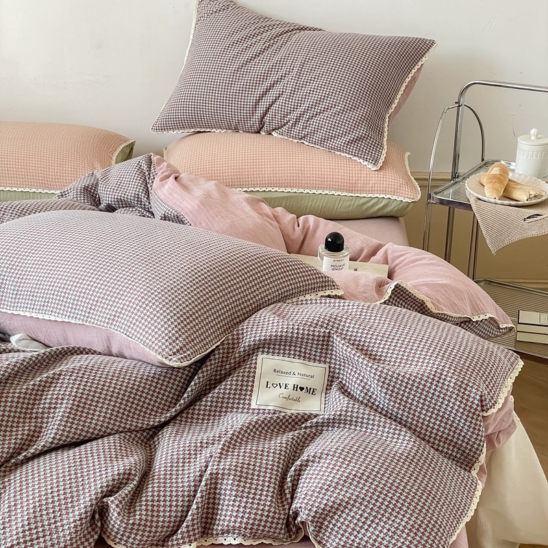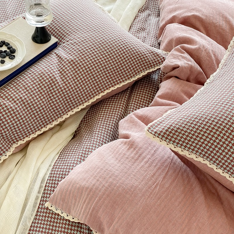 圆岛 2022新款色织小提花花边款全棉水洗棉四件套 沙紫拼粉