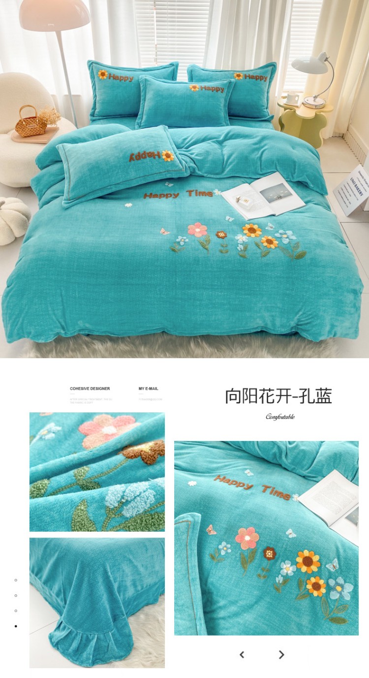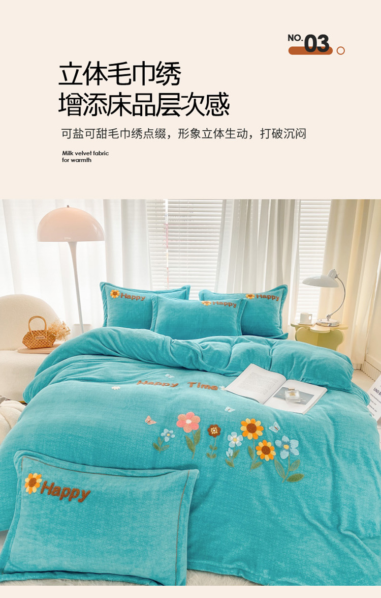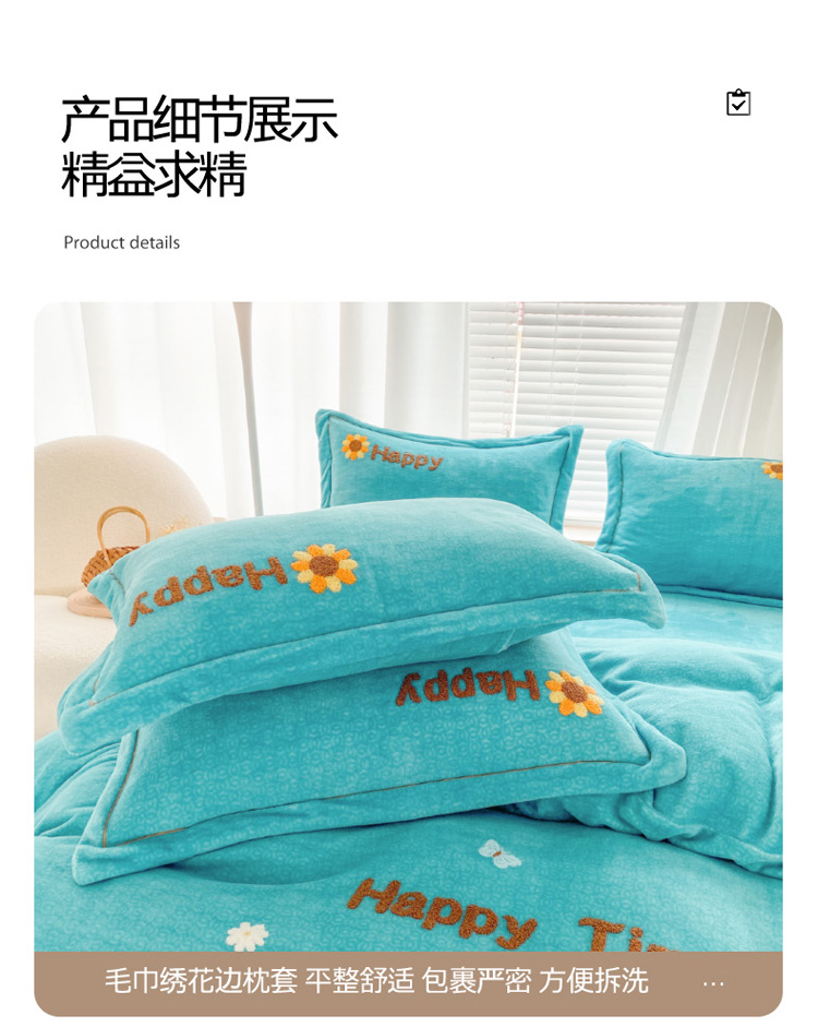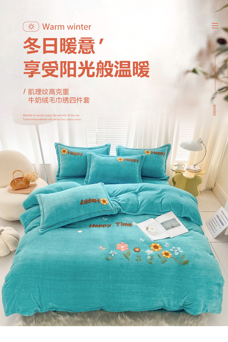 商品名称:云锦22新肌理纹高克重200克牛奶绒毛巾绣四件套向阳花开孔蓝