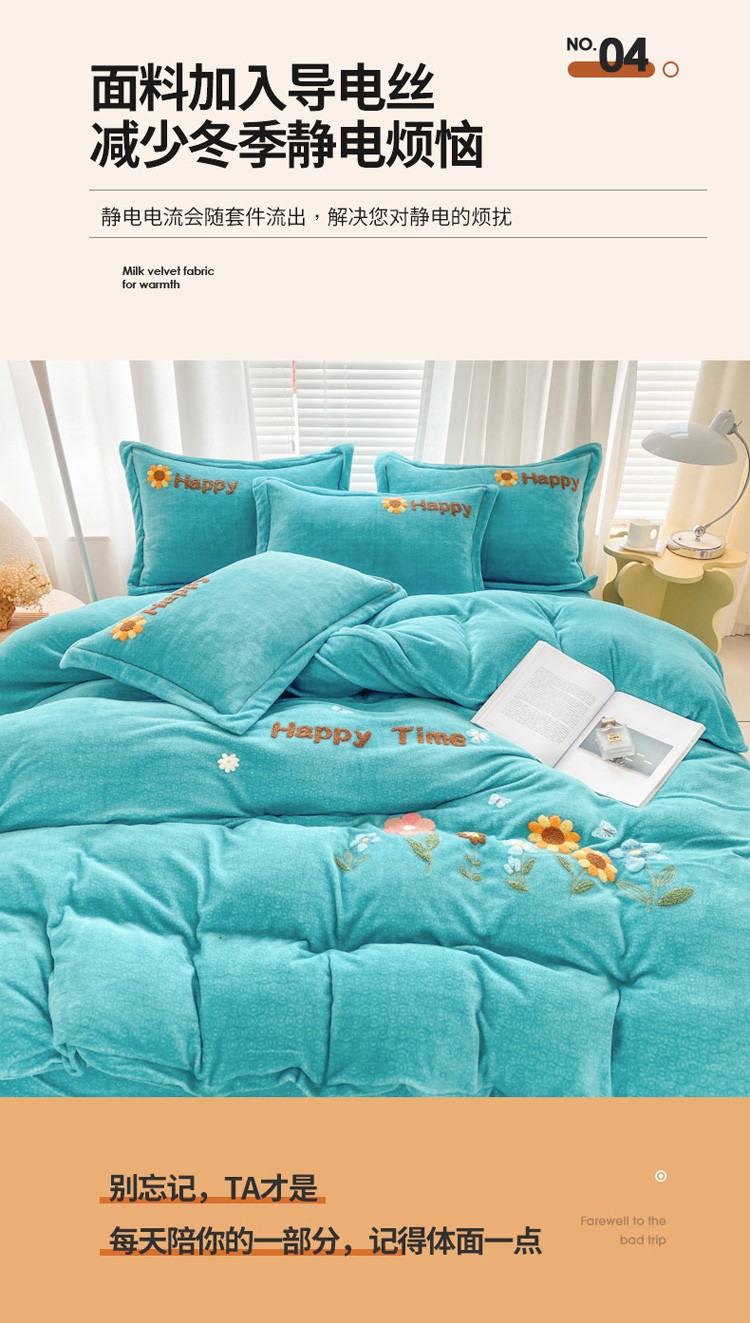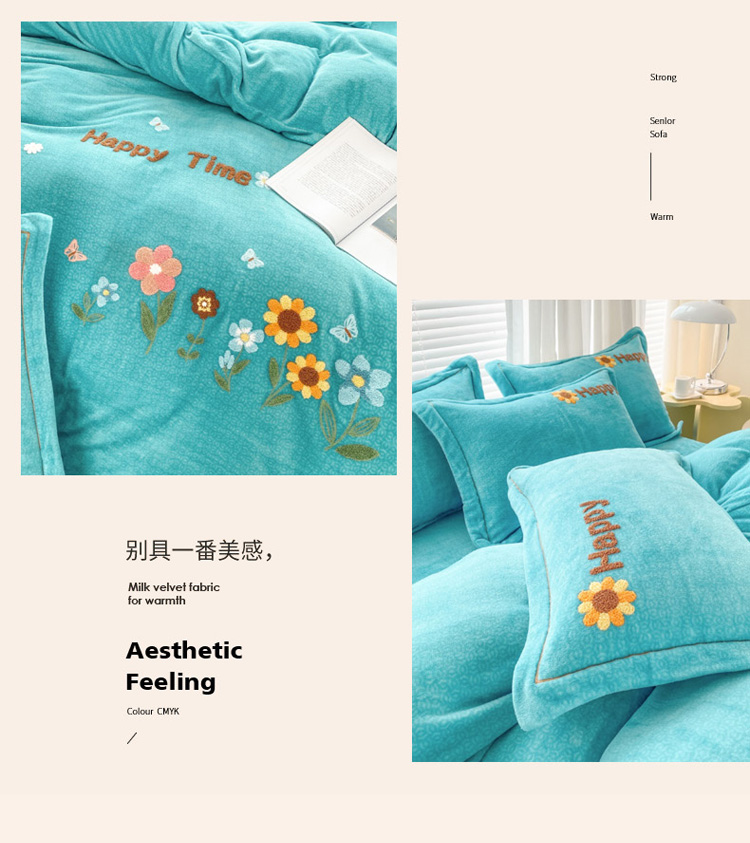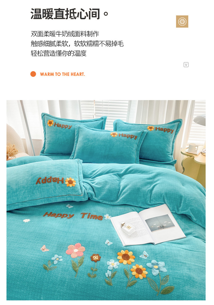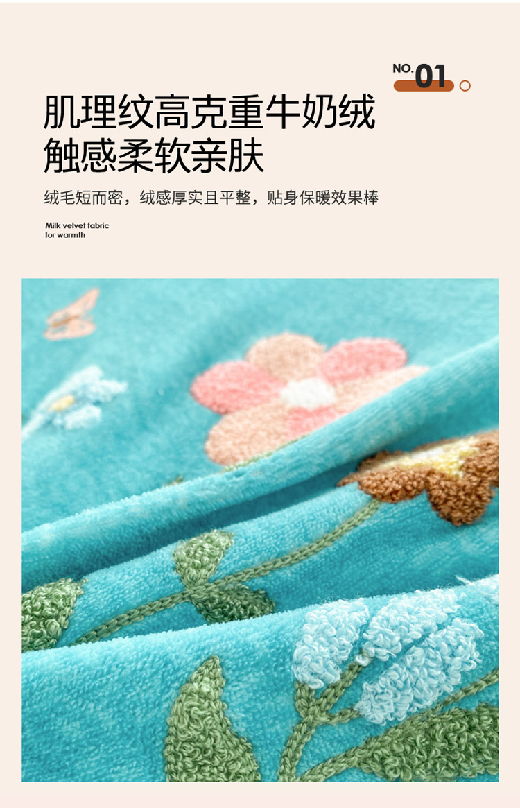 商品名称:云锦22新肌理纹高克重200克牛奶绒毛巾绣四件套向阳花开孔蓝