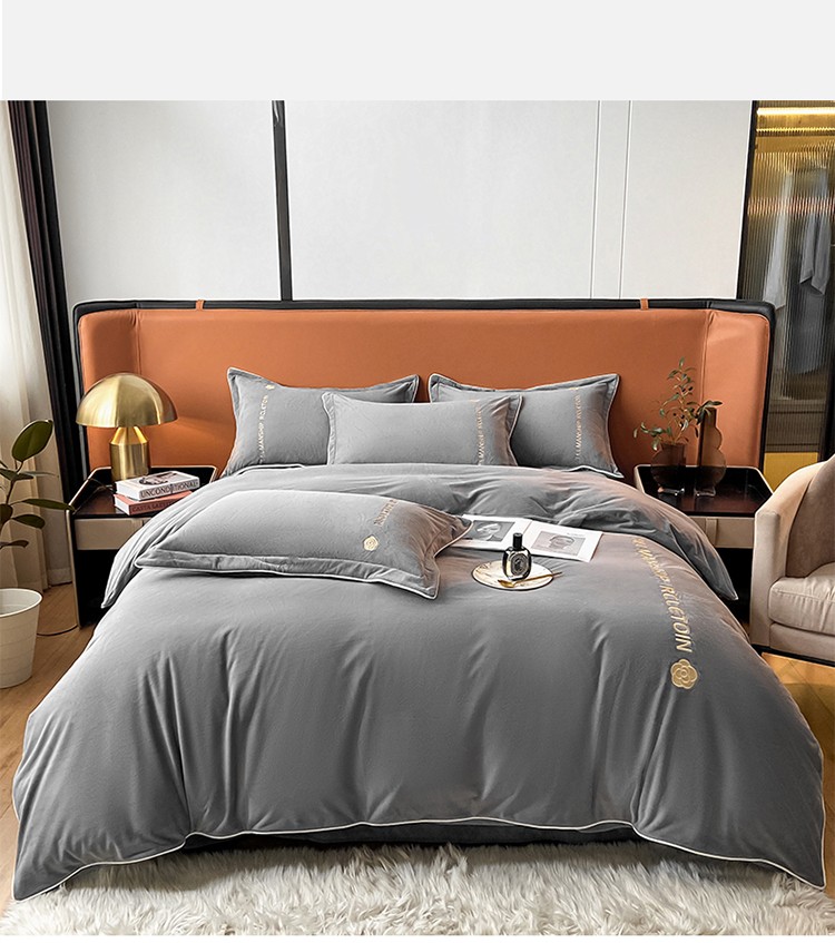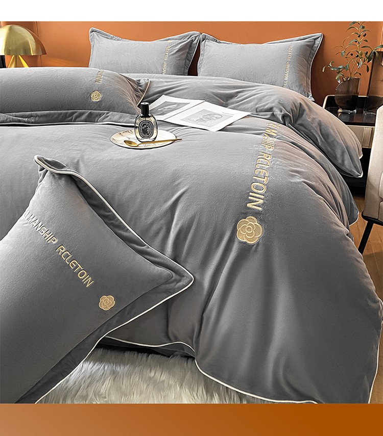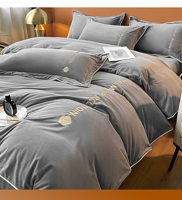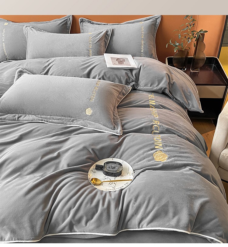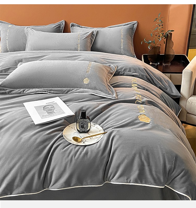 嗯呢 2023新款A类高克重轻奢刺绣婴儿绒四件套 高级灰