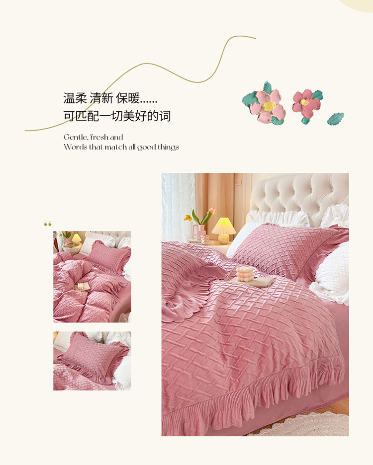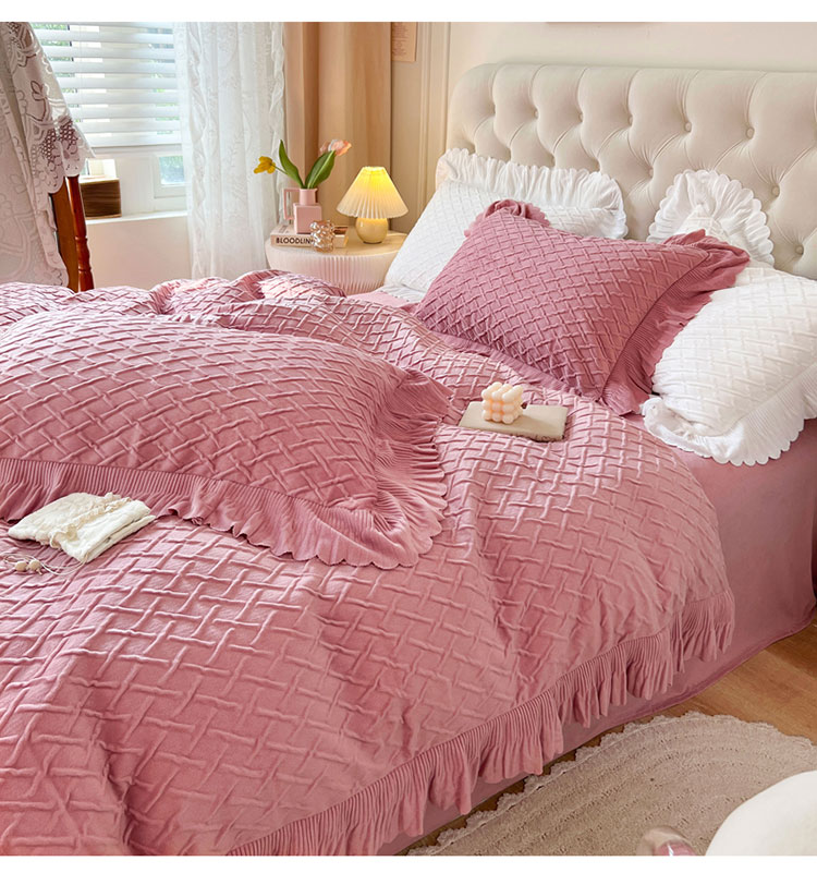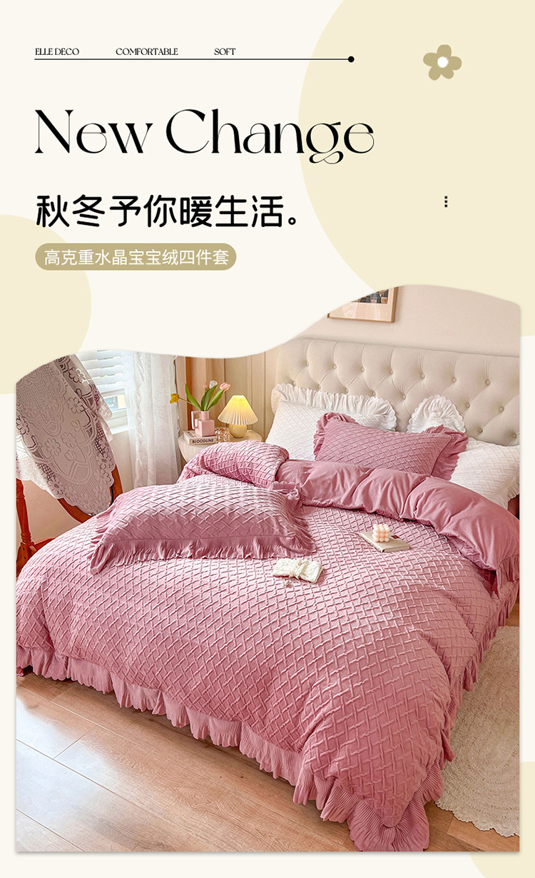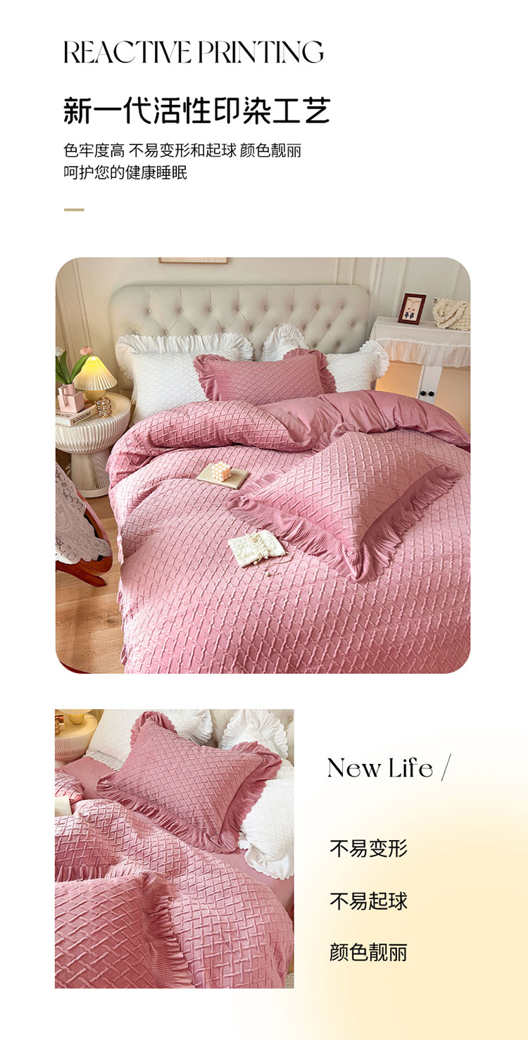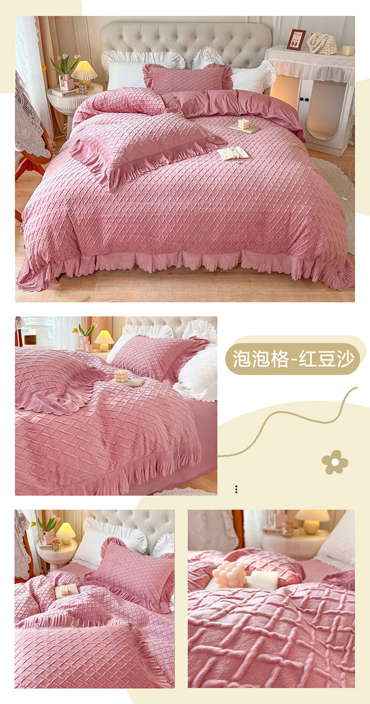 惯盈高克重水晶绒宝宝绒四件套压泡荷叶边四件套-泡泡格红豆沙
