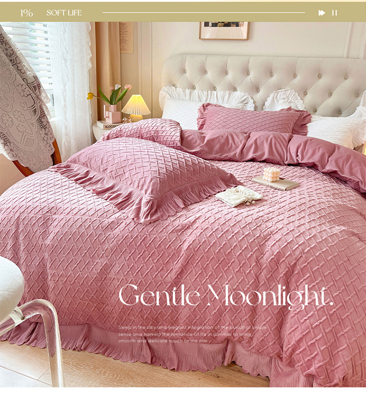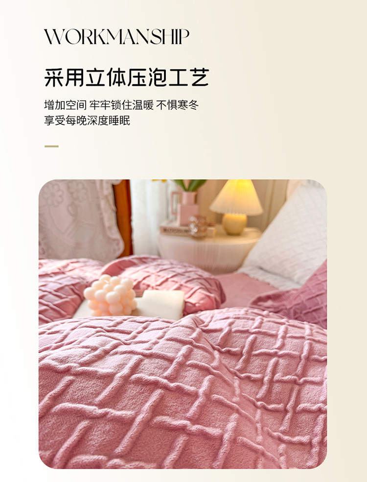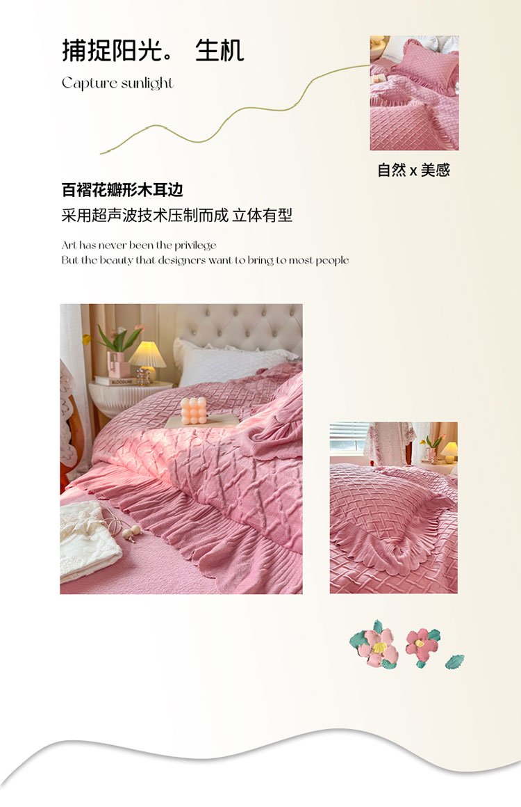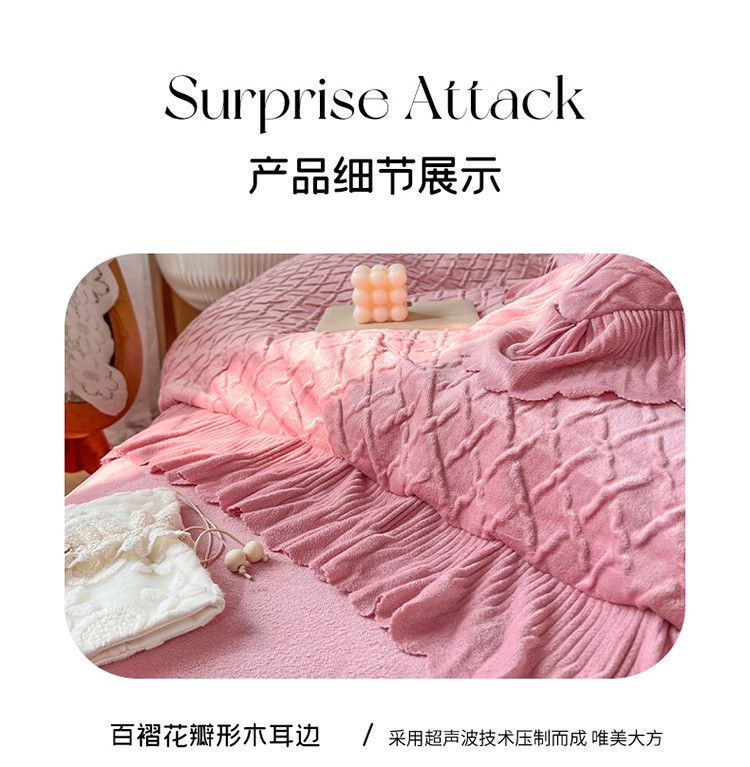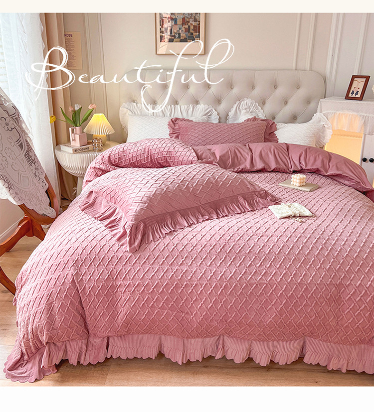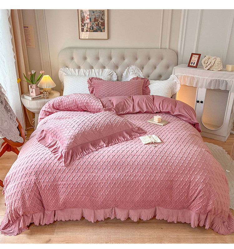 惯盈高克重水晶绒宝宝绒四件套压泡荷叶边四件套-泡泡格红豆沙